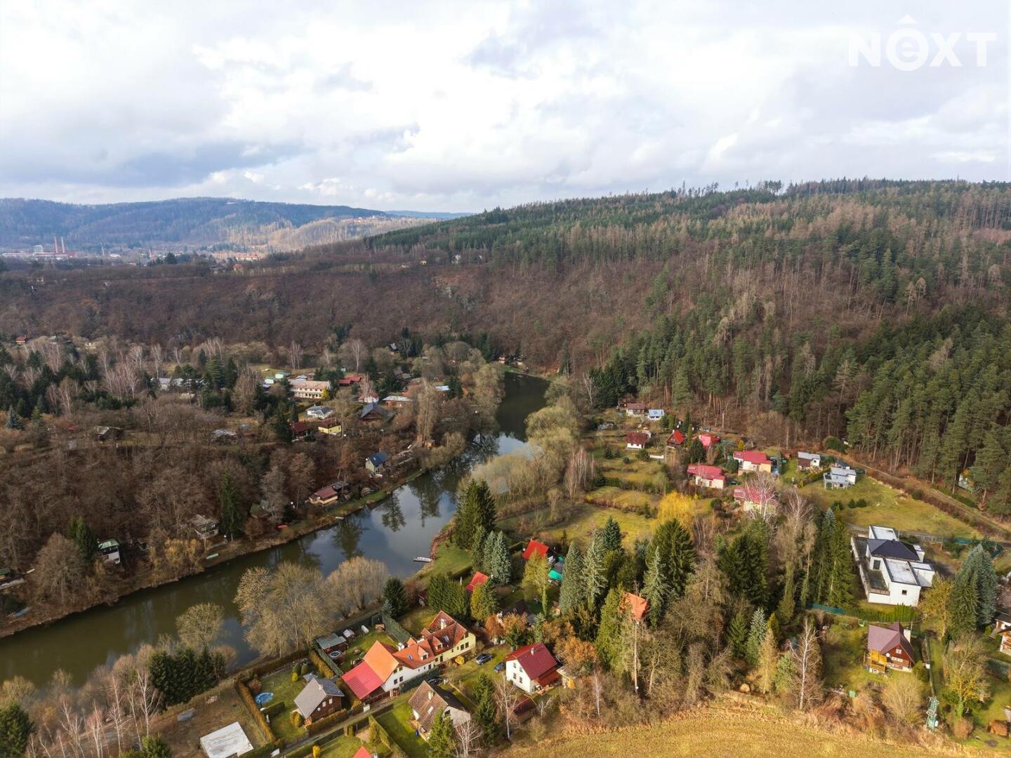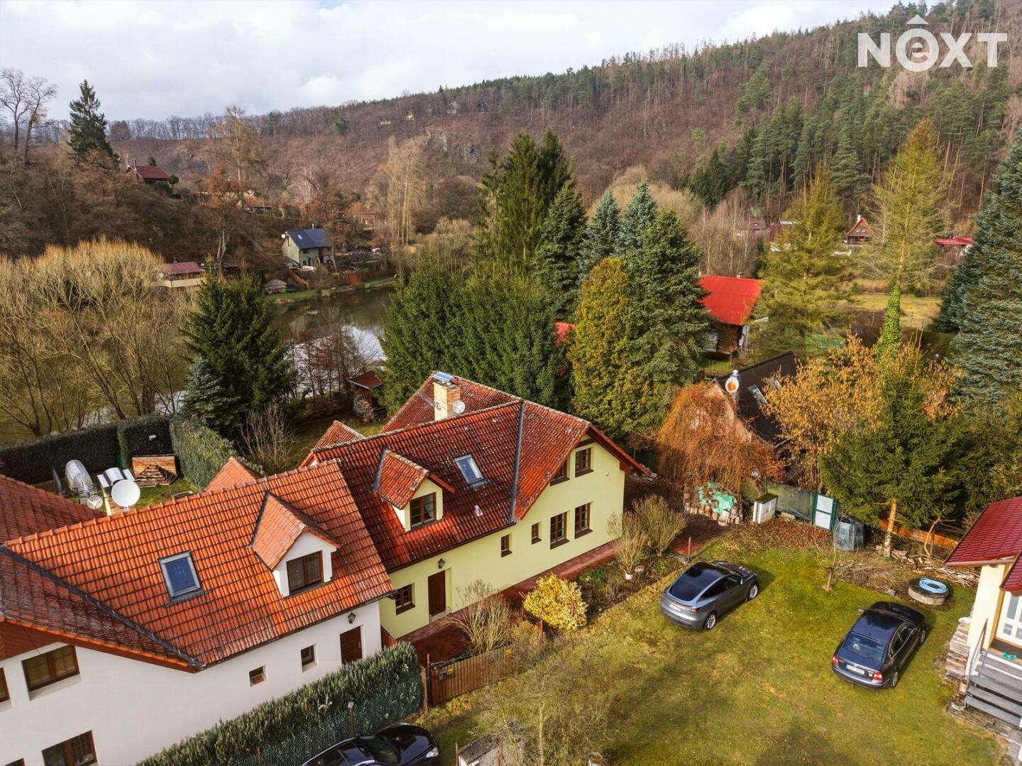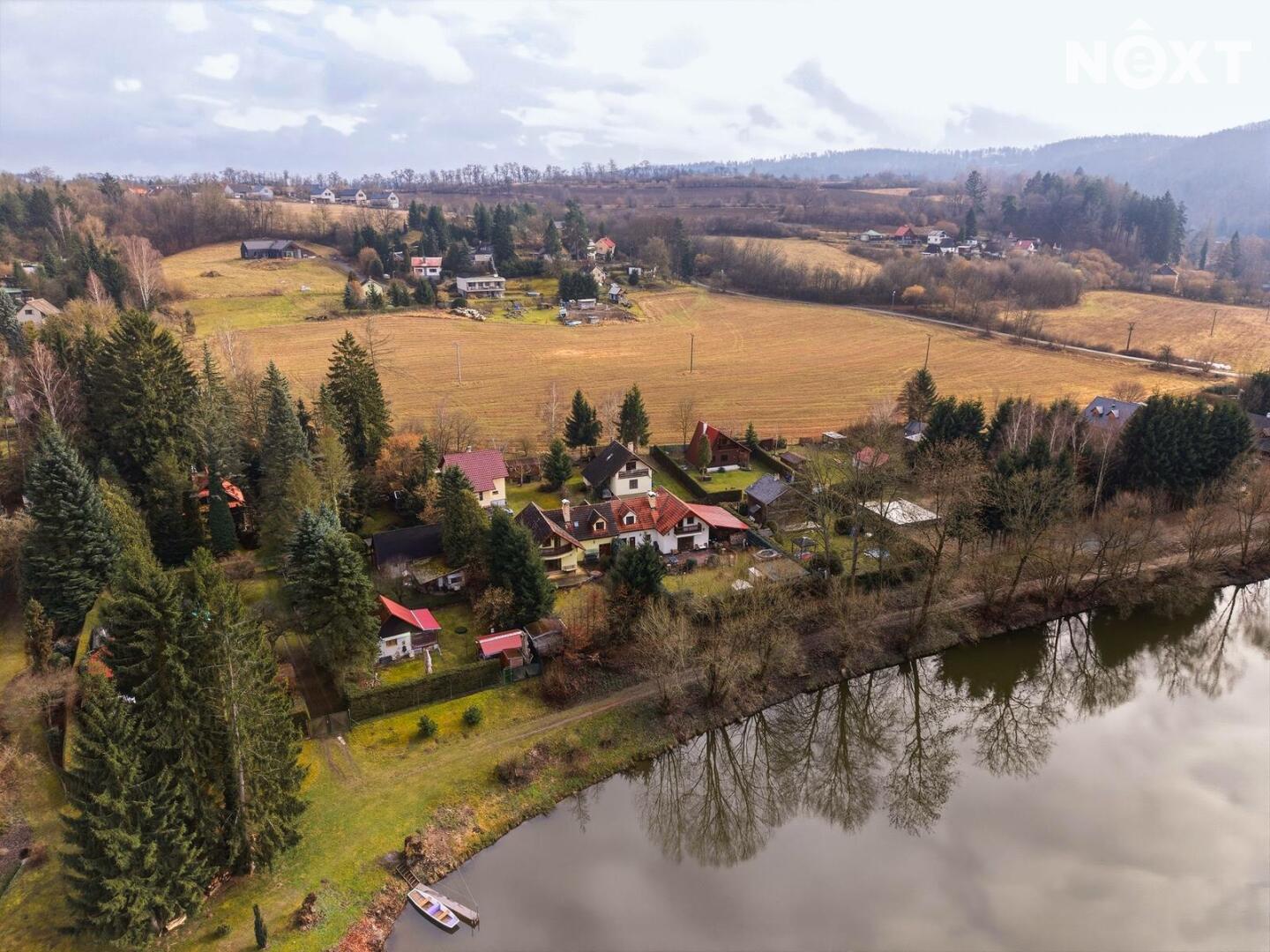 Dům stojí na obdélníkovém, ze tří stran oploceném pozemku o celkové výměře 567 m², z čehož pečlivě udržovaná okrasná zahrada tvoří 463 m². Ta nabízí dostatek prostoru pro relaxaci, dětské hry, zahradničení nebo jen pro nicnedělání, které je zde překvapivě návykové. Využít k tomu můžete rozlehlou terasu s výhledem na řeku. A pokud bude hlad, tak lze i něco ugrilovat v kamenném grilu.