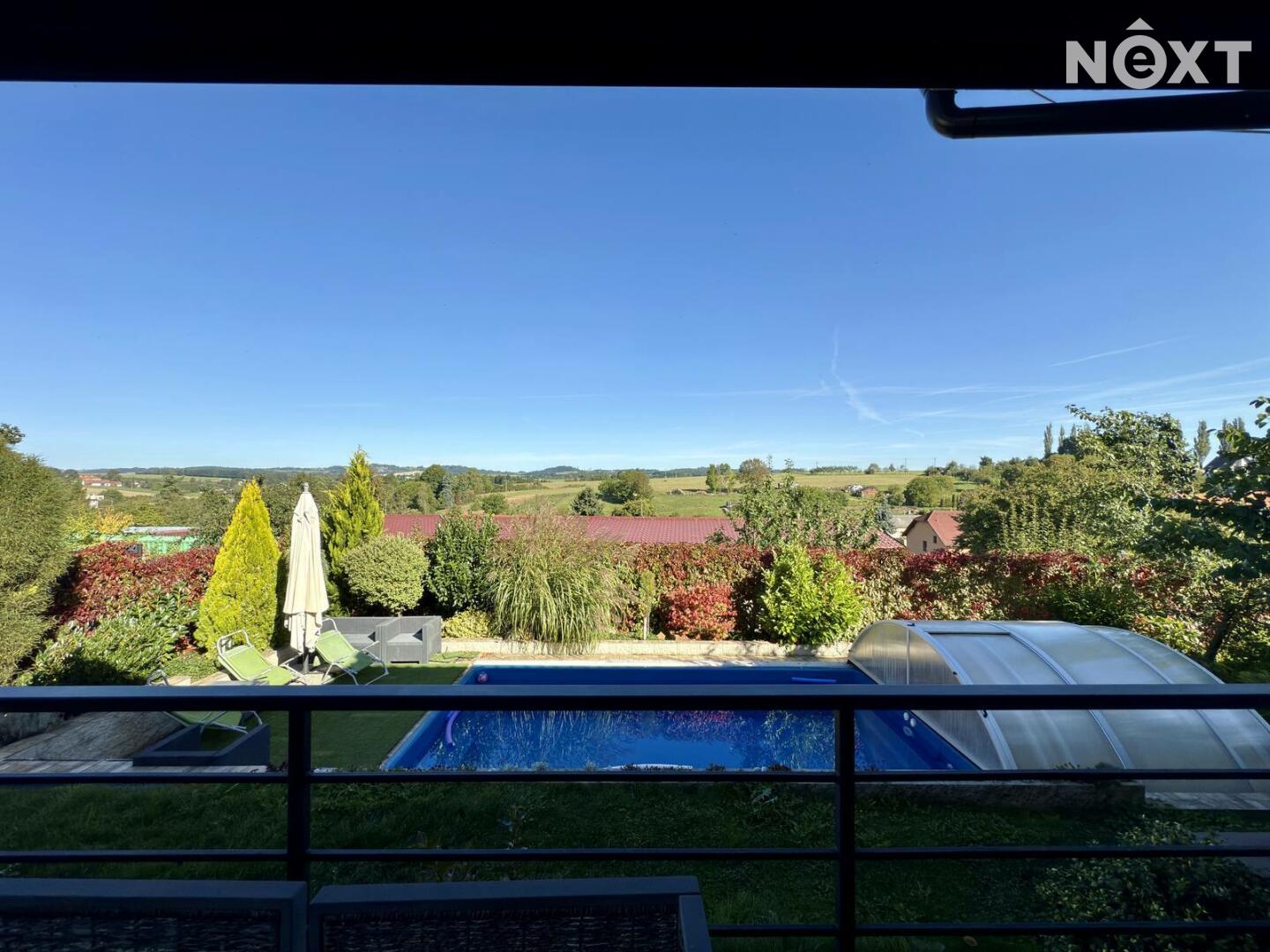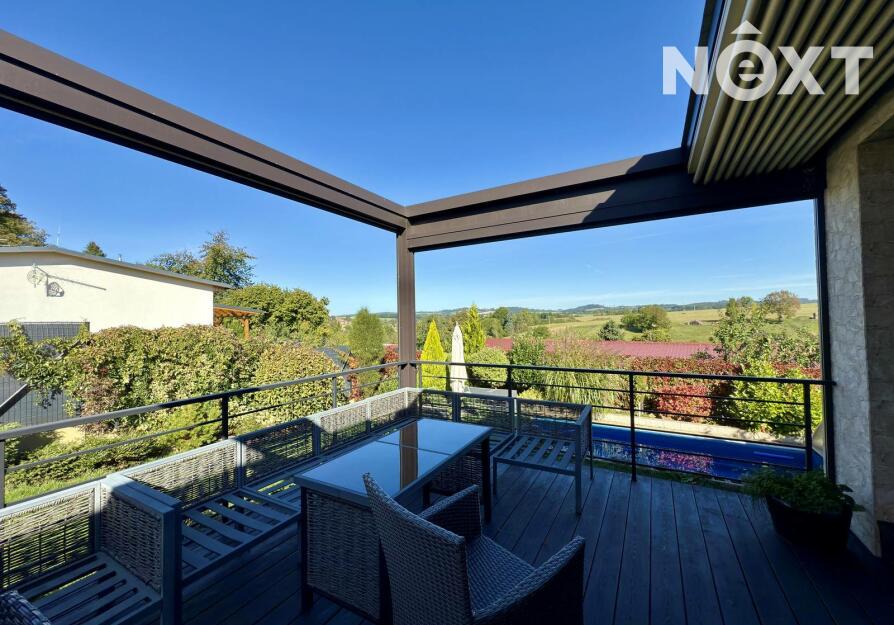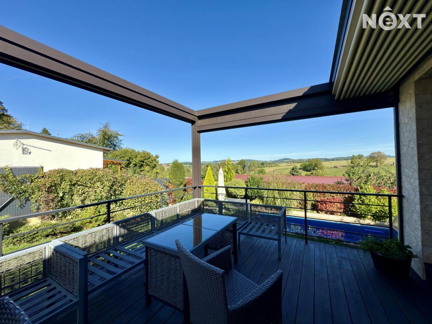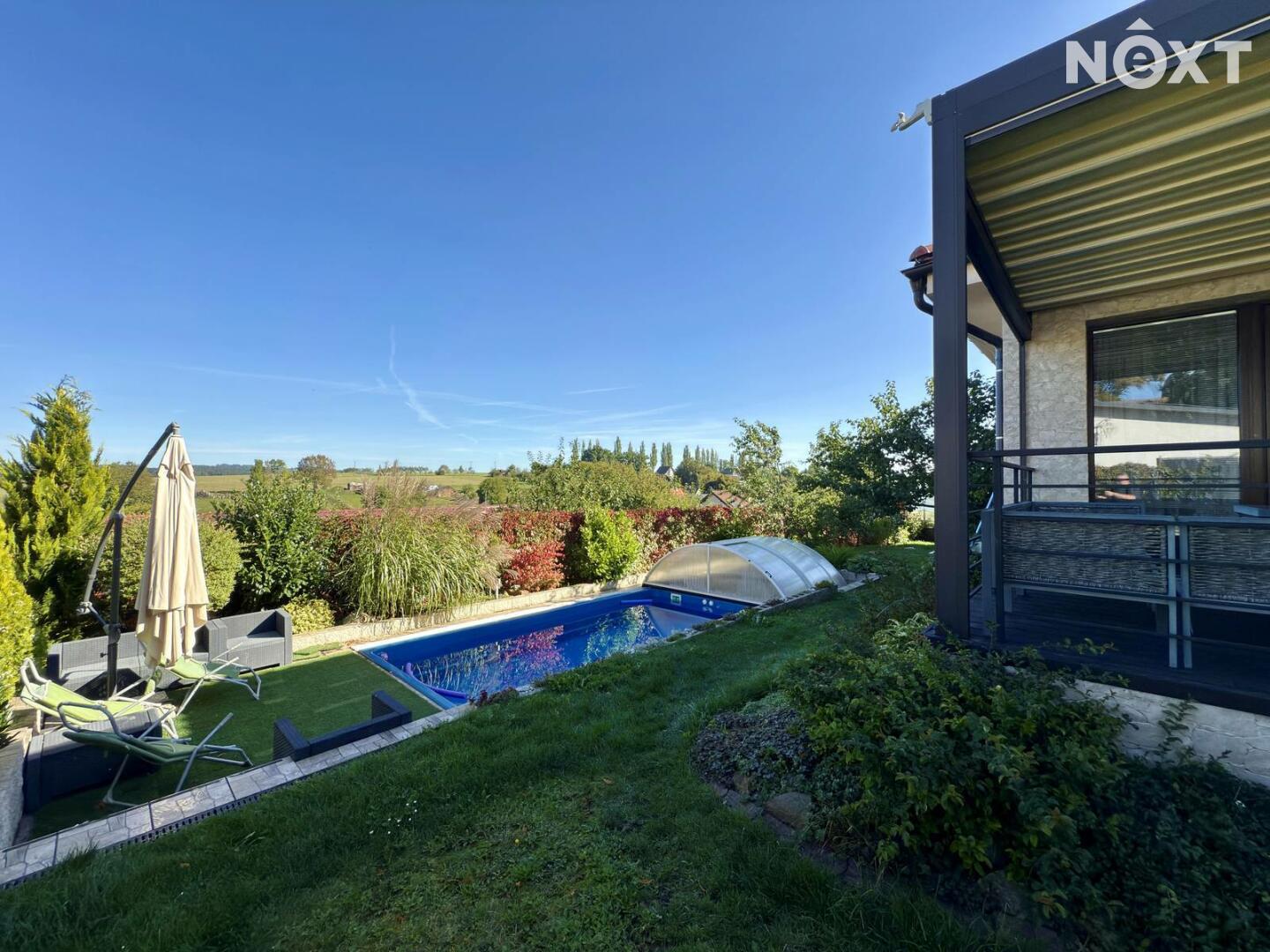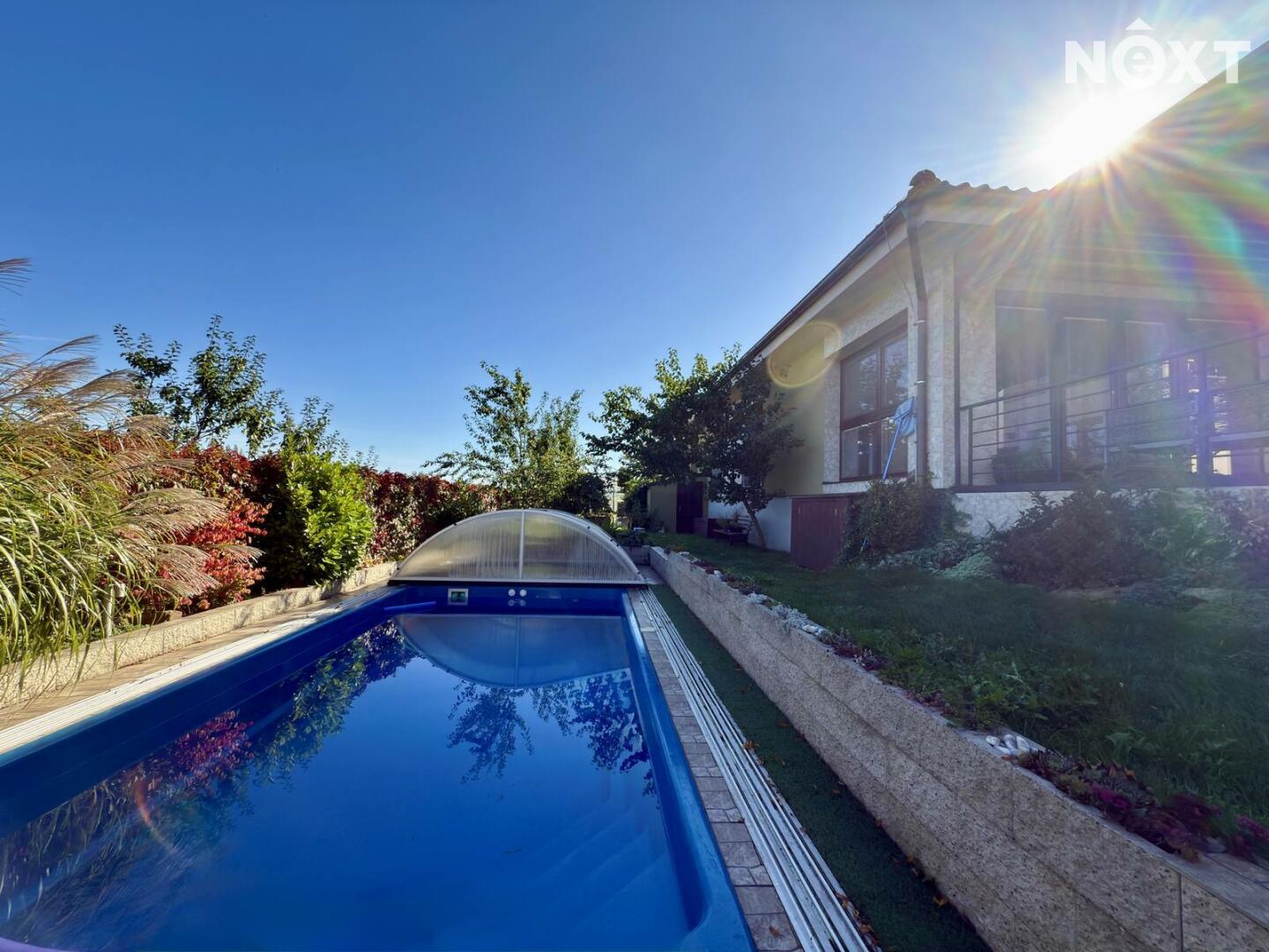Velkorysá dispozice 6+KK, wellness zóna se saunou a vířivkou, garáž pro 2 vozy (50 m²), bazén – různé funkce, kompletní zastřešení, nízké provozní náklady – elektrické podlahové vytápění a krb na pelety, možnost solárního napojení, moderní konstrukce – keramická cihla Porotherm 44 + 16 cm izolace, velká terasa s možností kompletního zastínění – automatické ovládání.