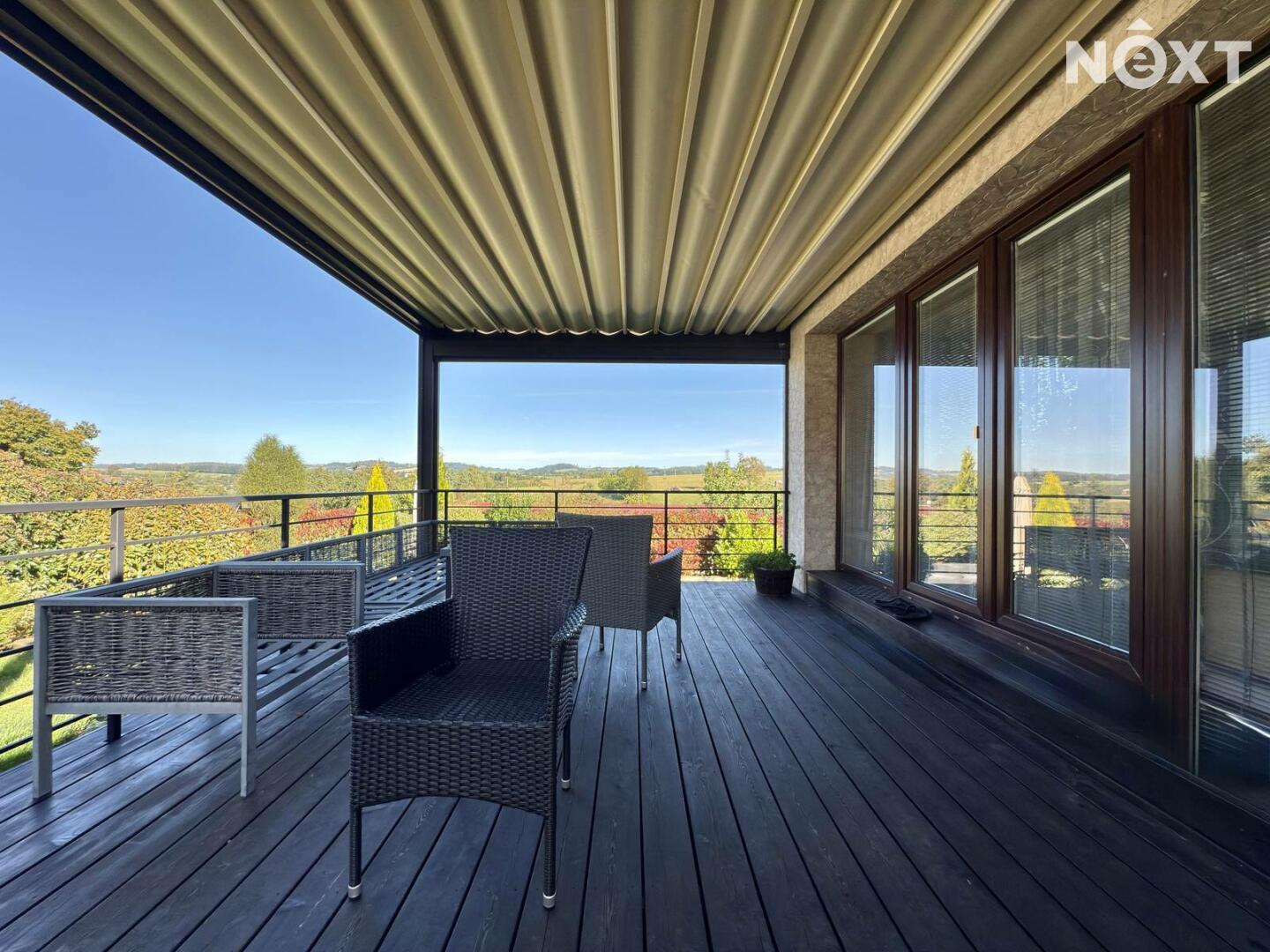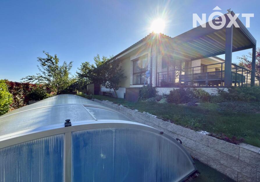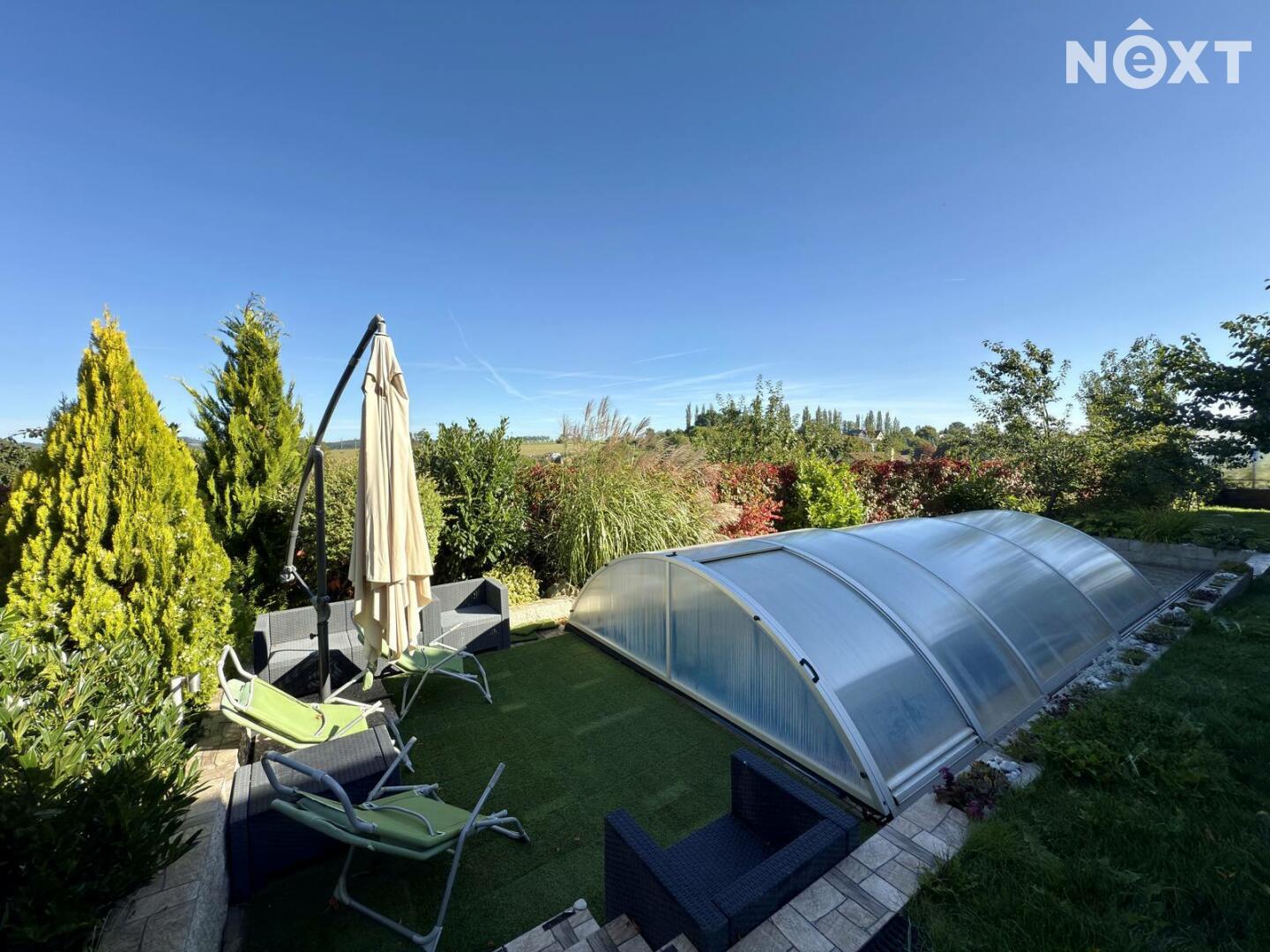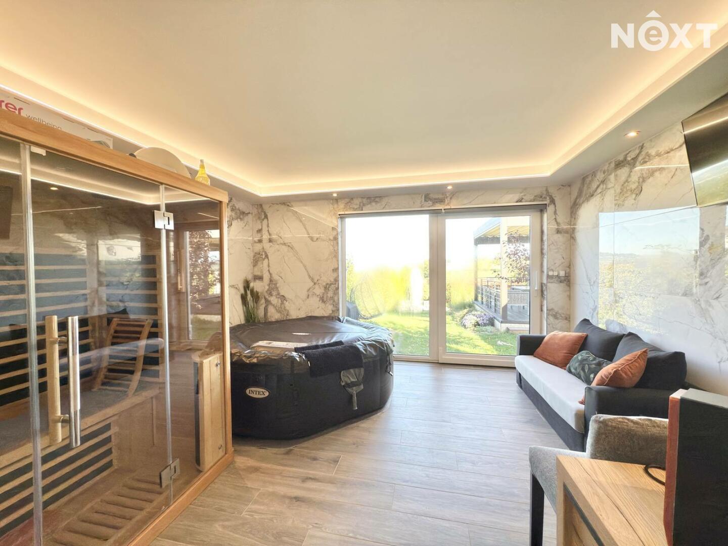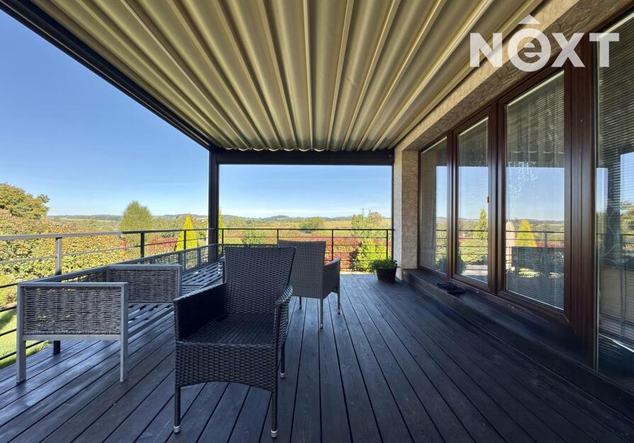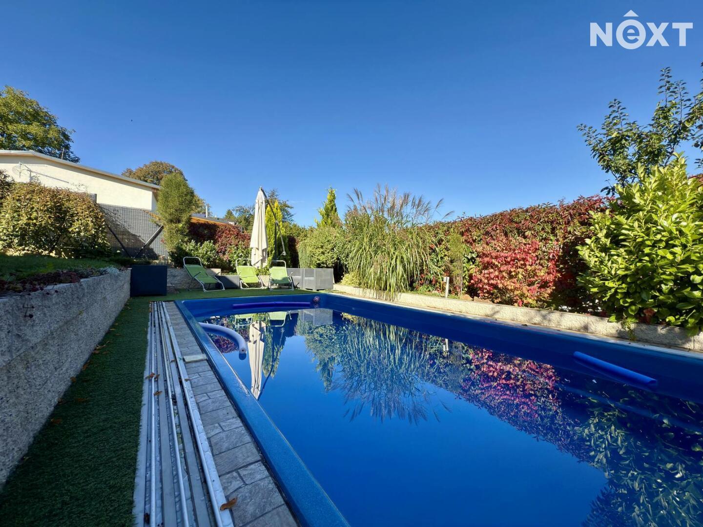 Velkorysá dispozice 6+KK, wellness zóna se saunou a vířivkou, garáž pro 2 vozy (50 m²), bazén – různé funkce, kompletní zastřešení, nízké provozní náklady – elektrické podlahové vytápění a krb na pelety, možnost solárního napojení, moderní konstrukce – keramická cihla Porotherm 44 + 16 cm izolace, velká terasa s možností kompletního zastínění – automatické ovládání.