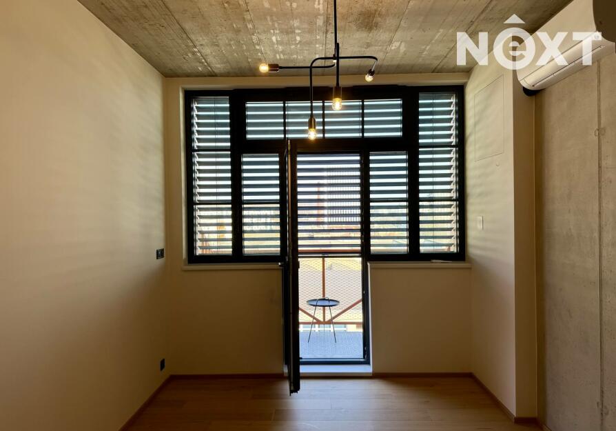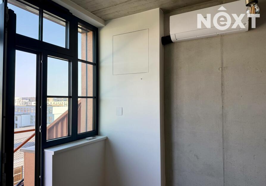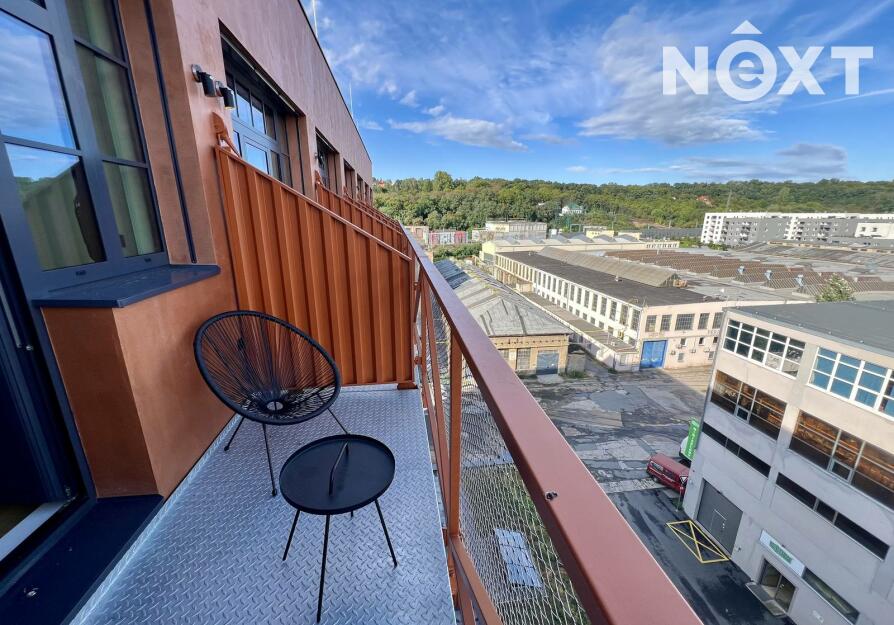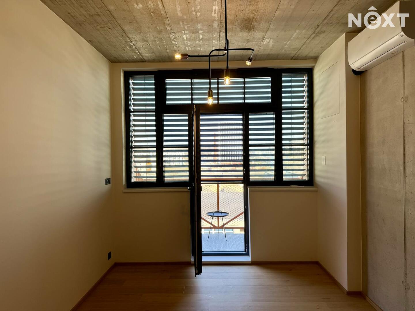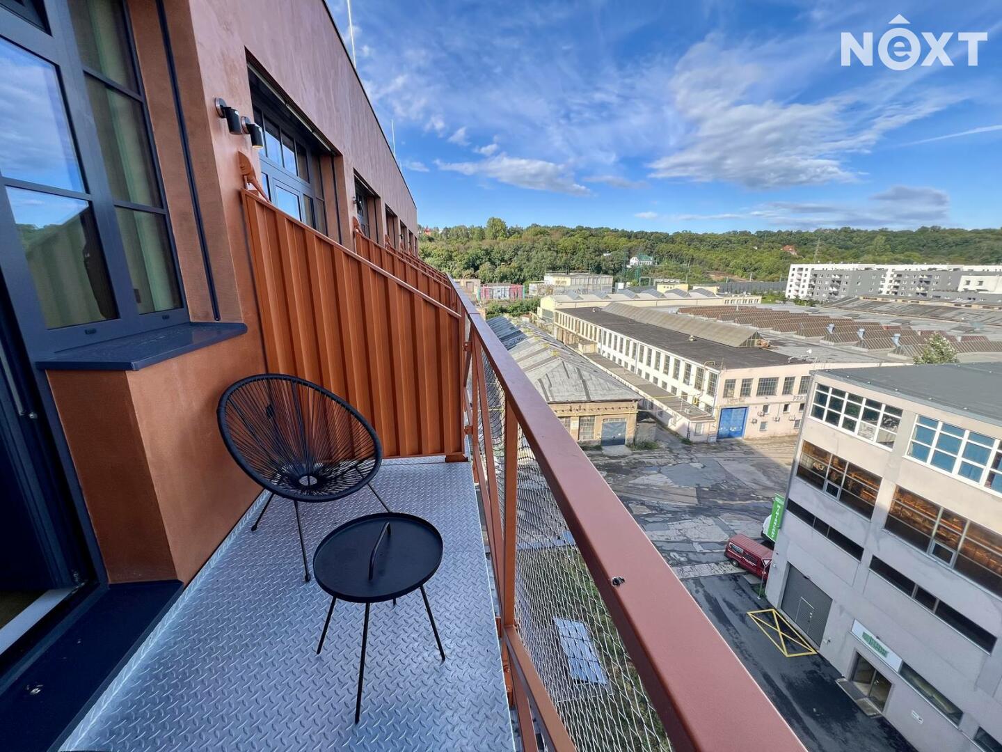 Světlý interiér s velkoformátovými okny a industriálními prvky vytváří osobitou atmosféru. Praktická dispozice 1+kk je doplněna balkonem vhodným pro posezení.