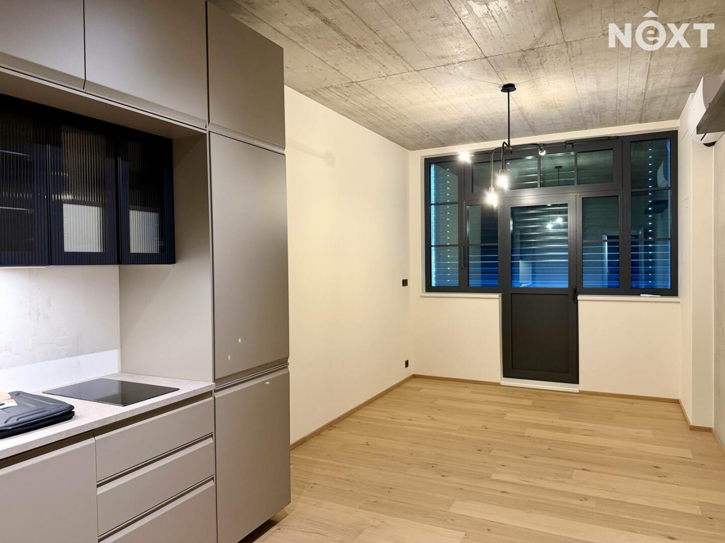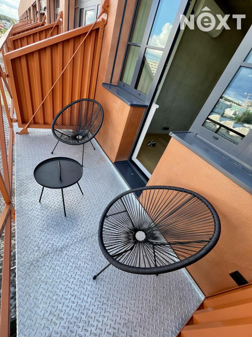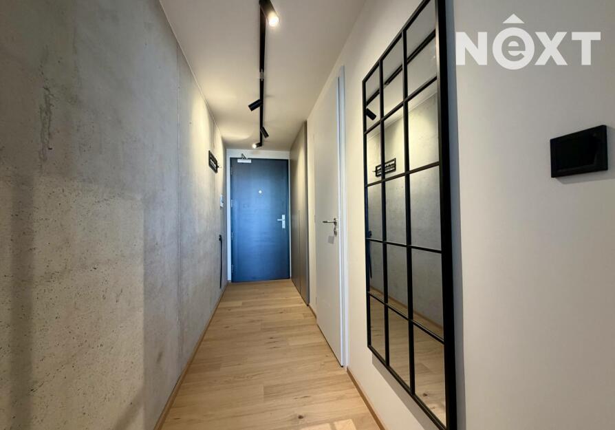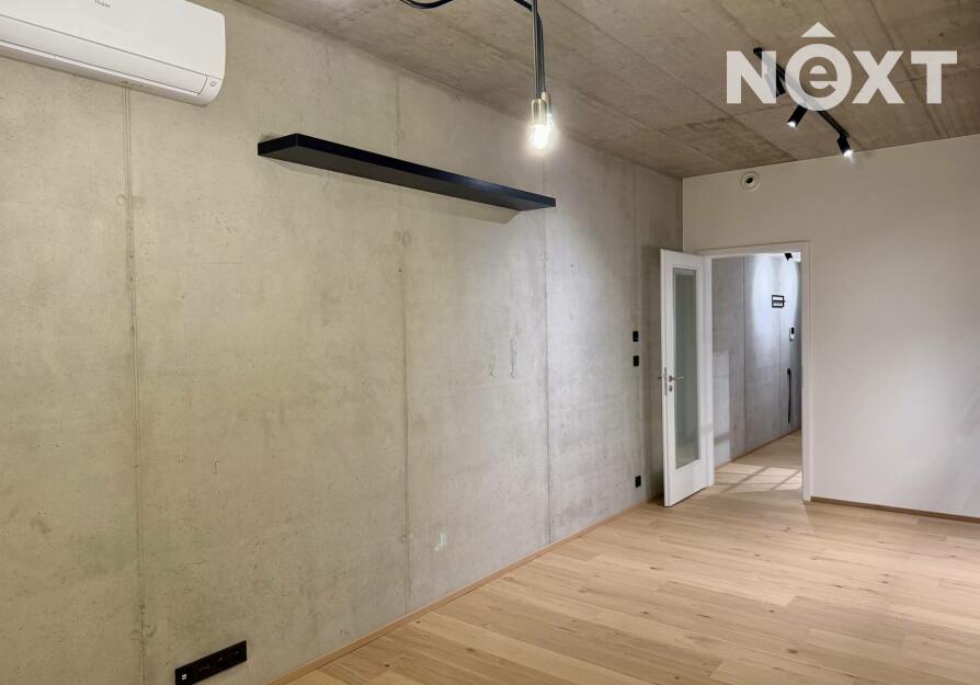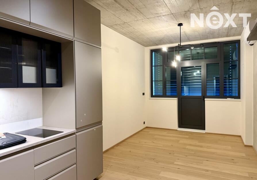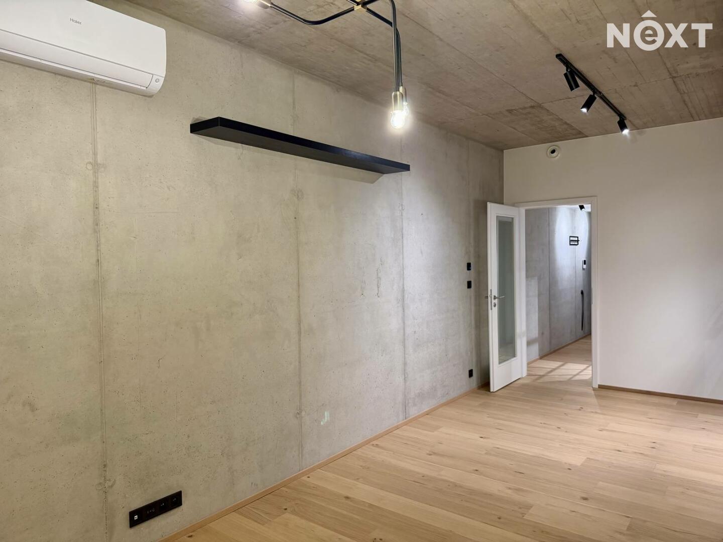 Světlý interiér s velkoformátovými okny a industriálními prvky vytváří osobitou atmosféru. Praktická dispozice 1+kk je doplněna balkonem vhodným pro posezení.