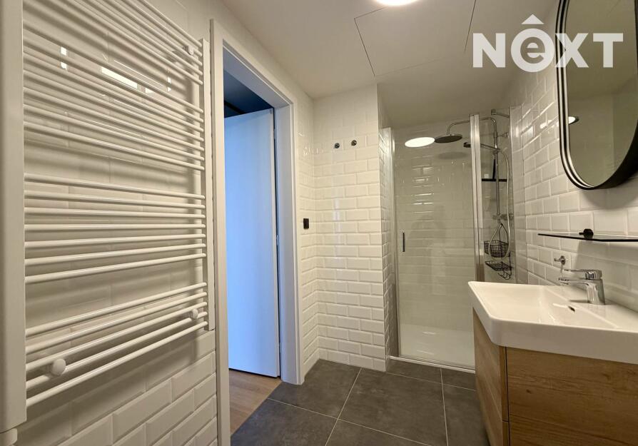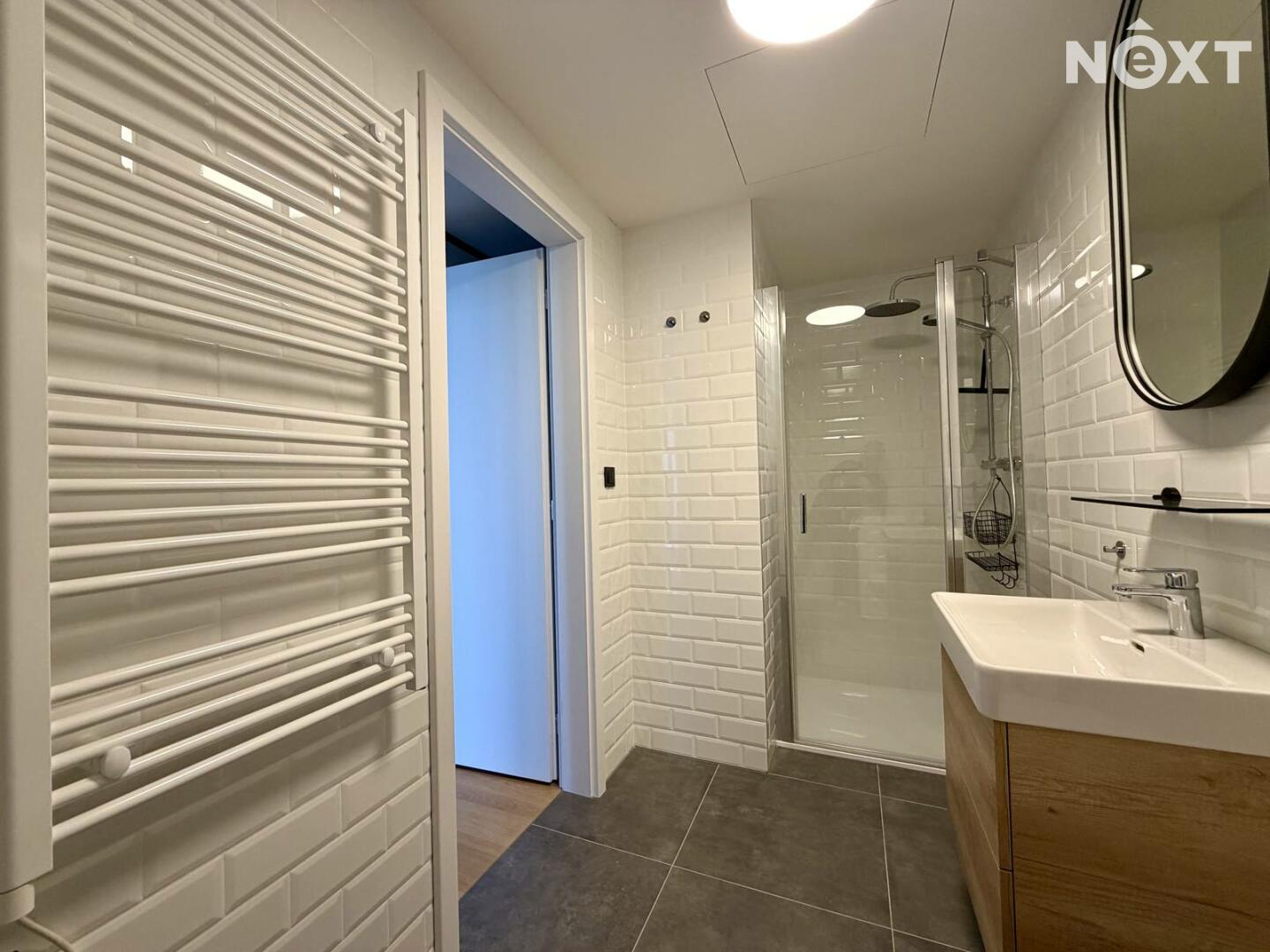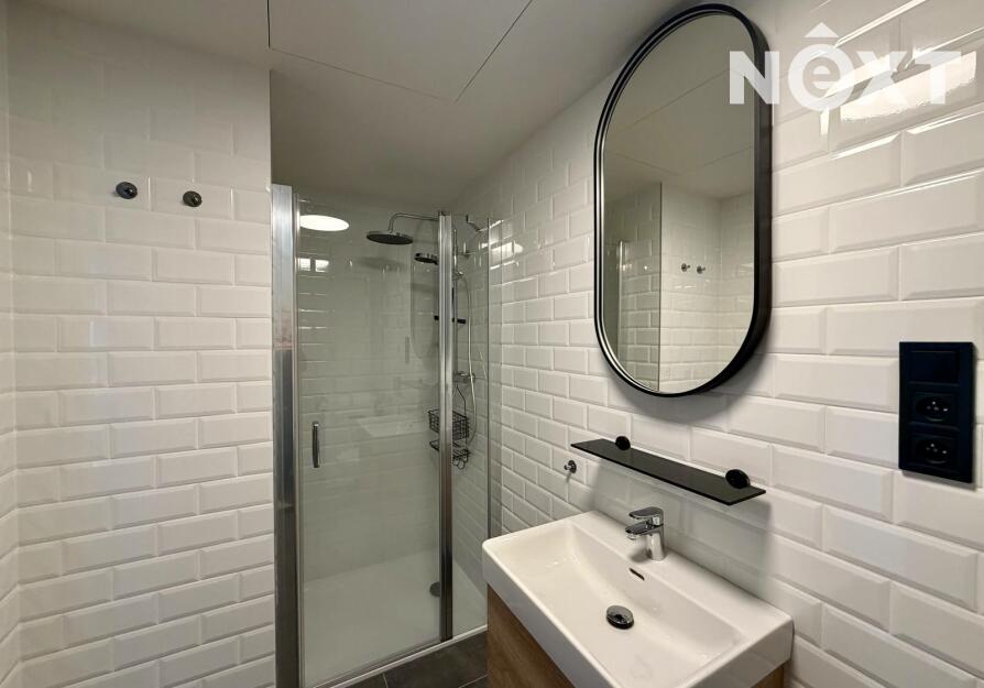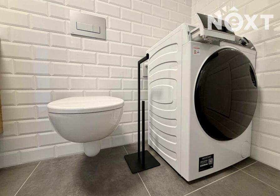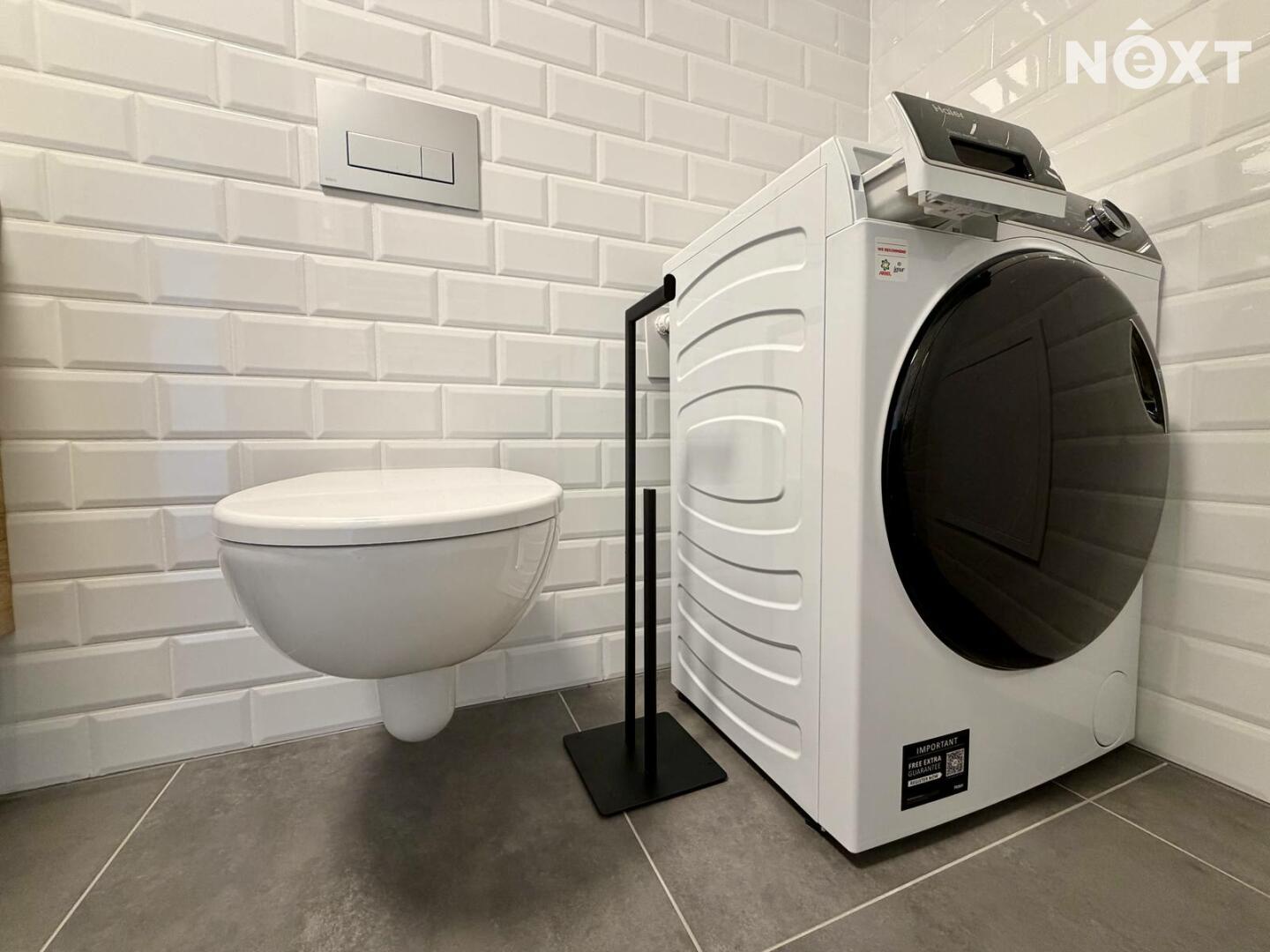 Moderní koupelna se sprchovým koutem, vybavená pračkou se sušičkou značky Haier.