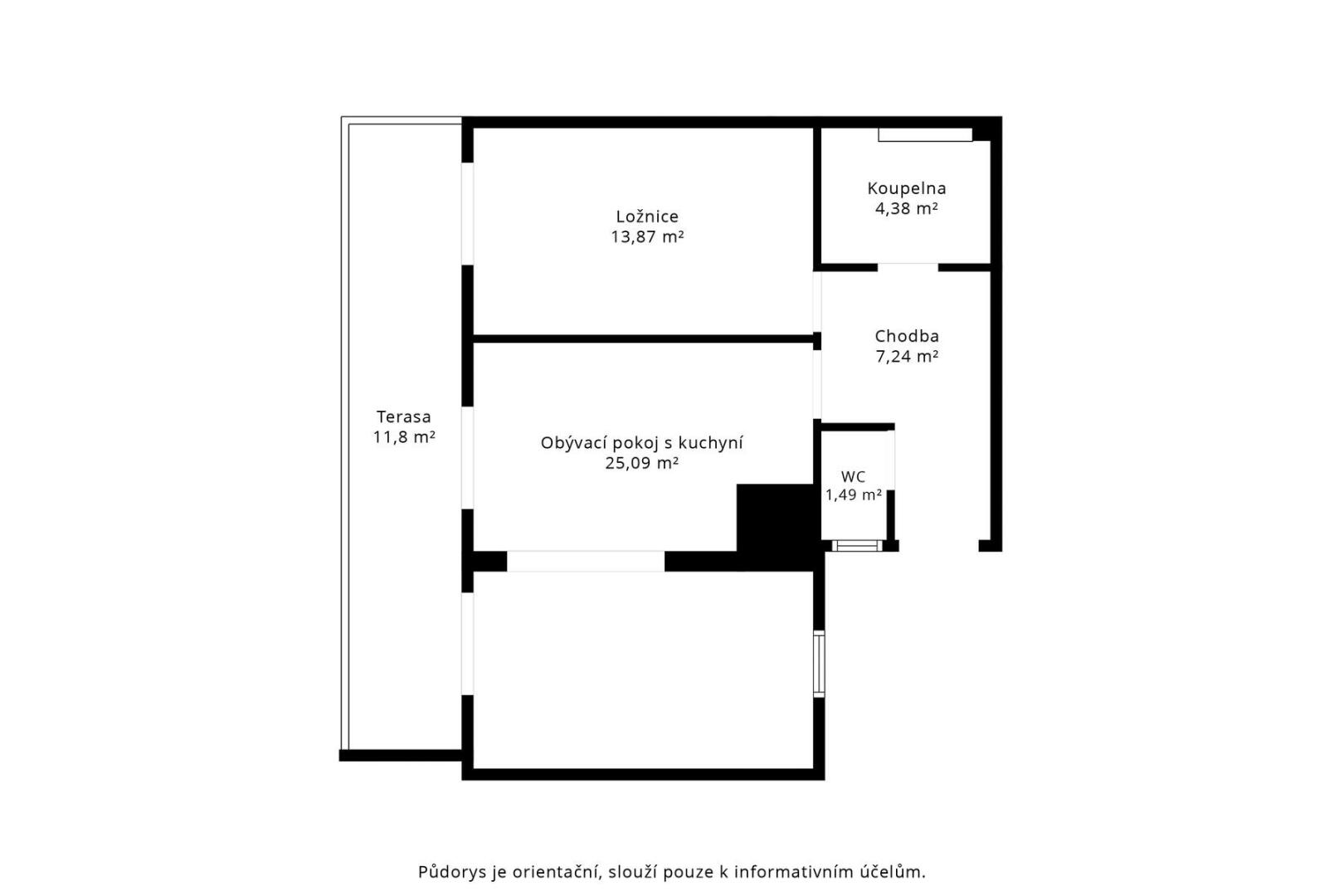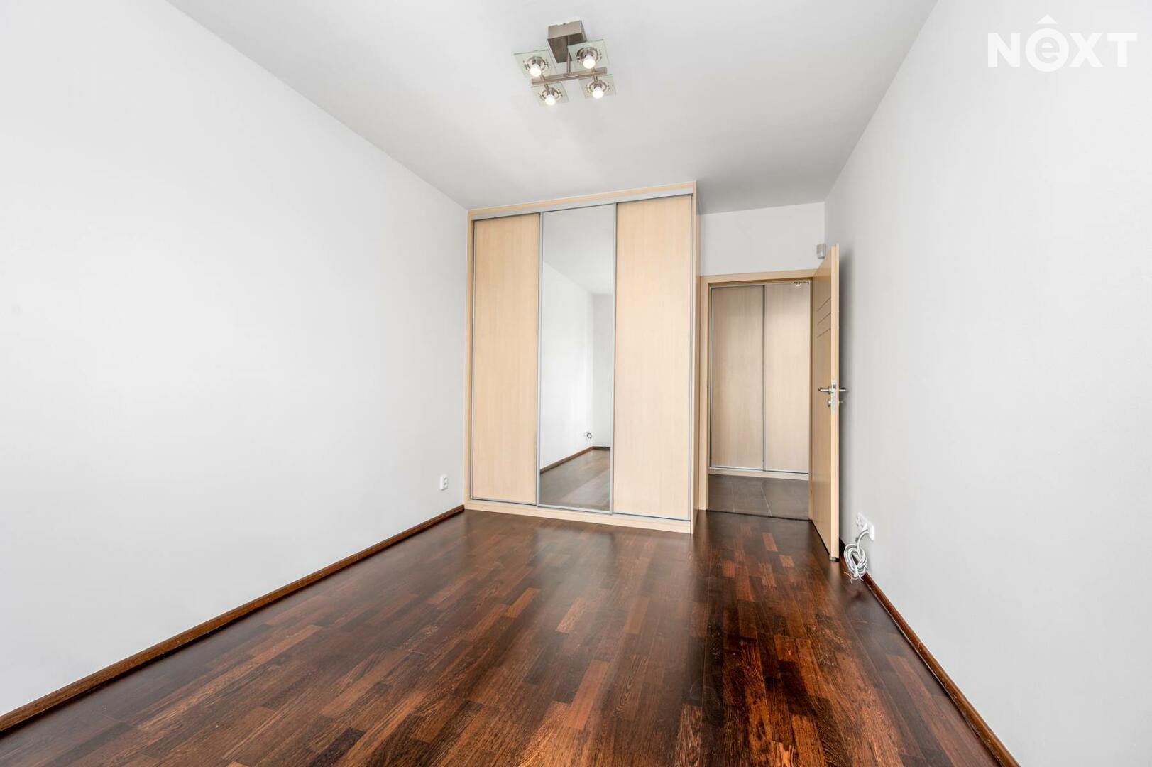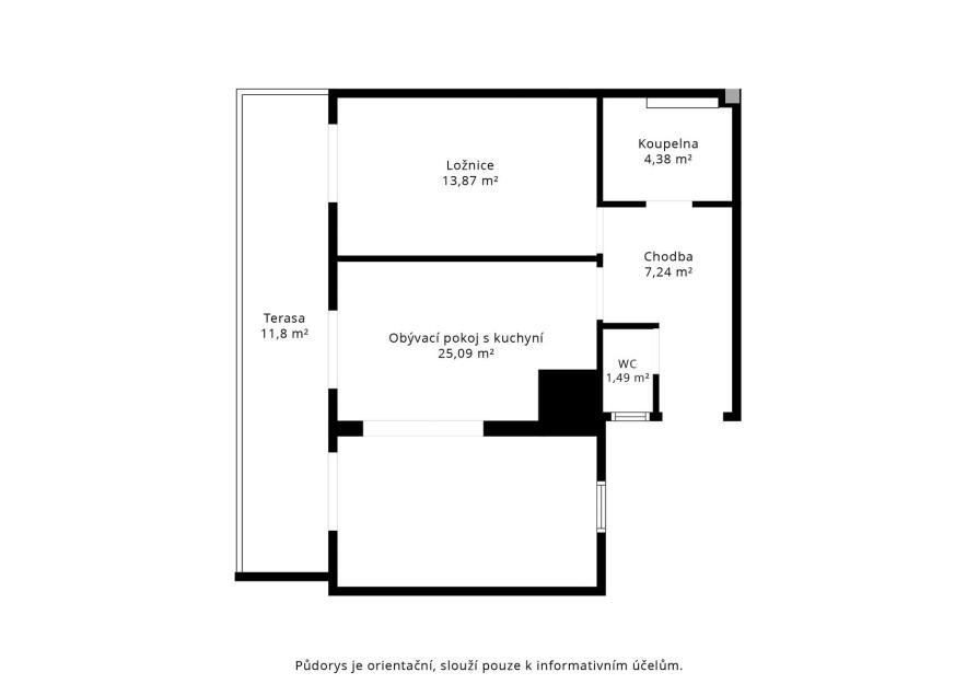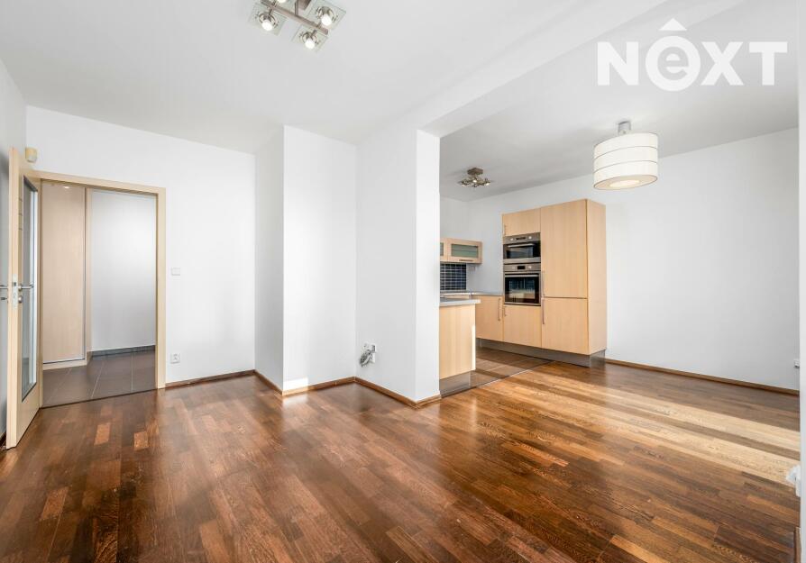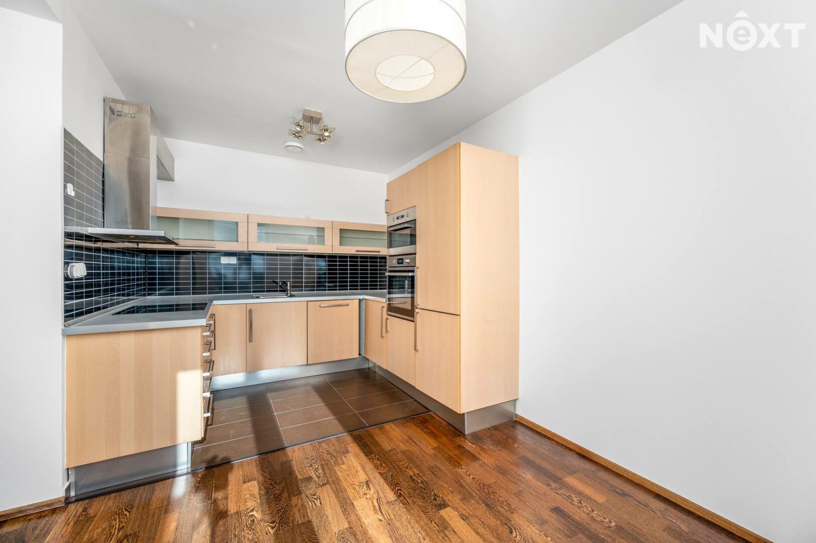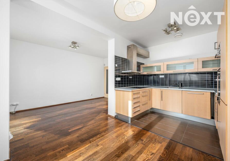 Samotný byt je zděný, v perfektním stavu, podlahy v pokojích dřevěné, skládací parkety WENGE. Chytrá dispozice: obývací pokoj s kuchyní a plně vybaveným kuchyňským koutem vč. myčky, trouby, mikrovlnné trouby, vestavěné lednice s mrazákem (25,09 m²), ložnice se skříní (13,87 m²), moderní koupelna s místem pro pračku i sušičku (4,38 m²), samostatné WC (1,49 m²) a předsíň s prostornou skříní (7,24 m²). Z obou místností je přímý vstup na prostornou terasu francouzskými okny.