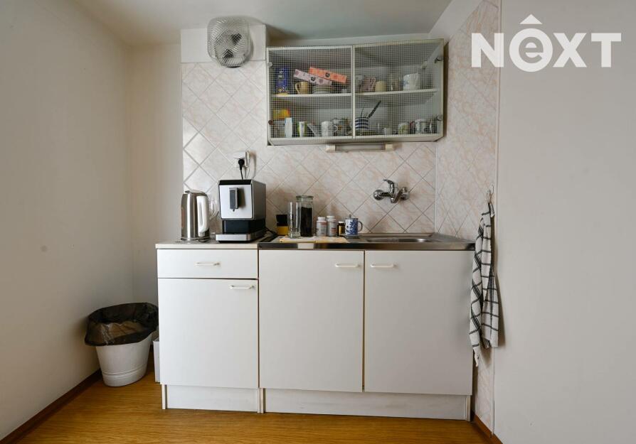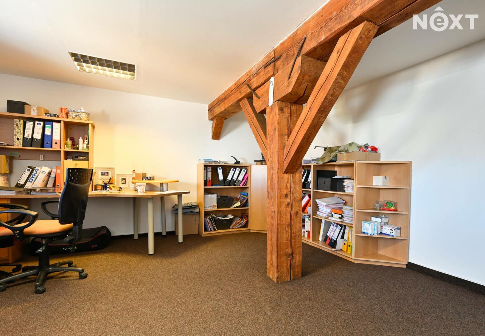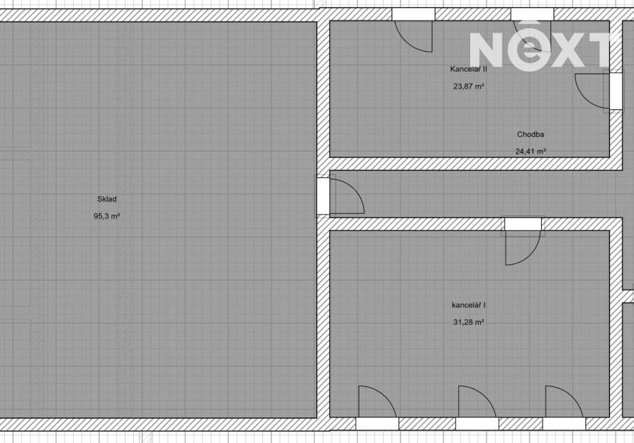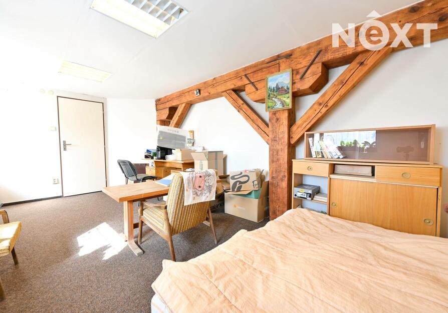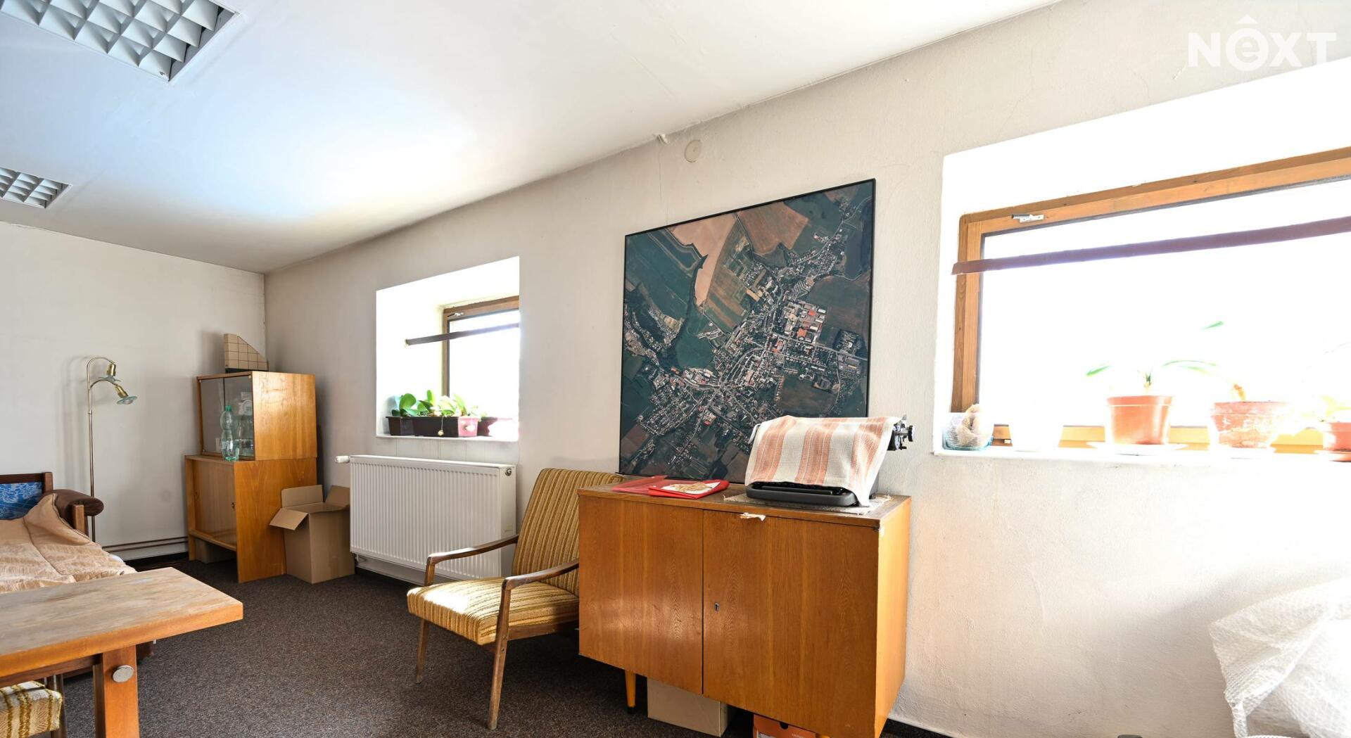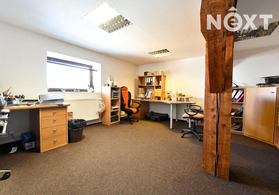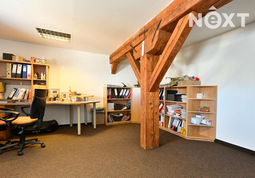 Patro (administrativa a sklady): V patře se nachází moderní kancelářské prostory (cca 55 m²) rozdělené na dvě samostatné kanceláře (31,28 m² a 23,87 m²) propojené chodbou, sociální zařízení (WC) a rozlehlý sklad o výměře 95,3 m².