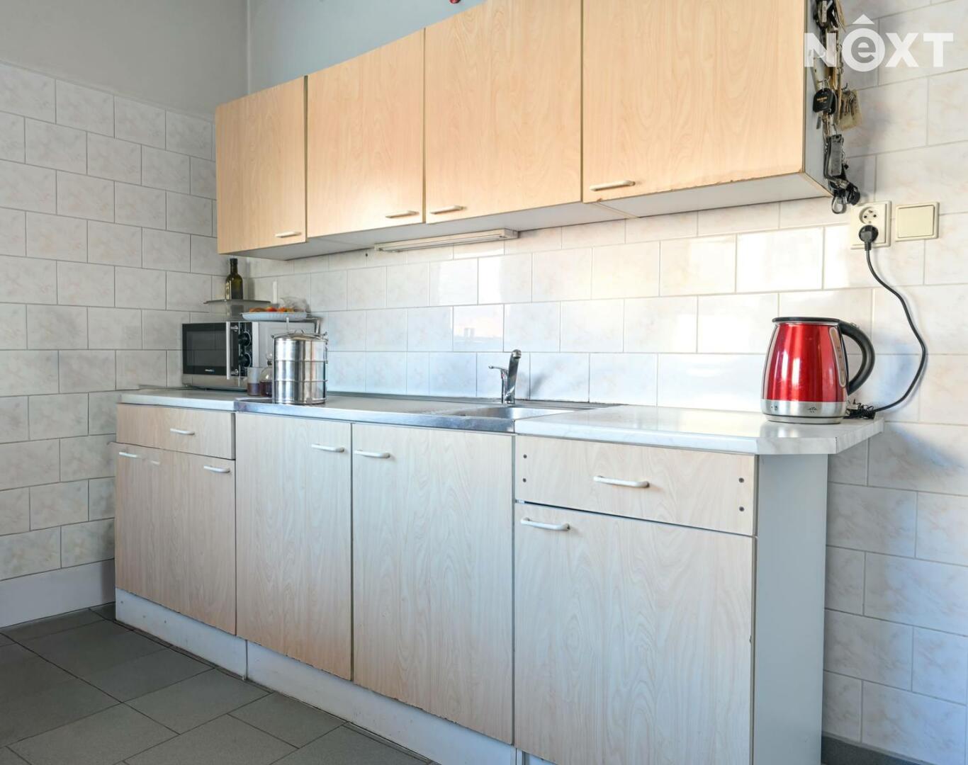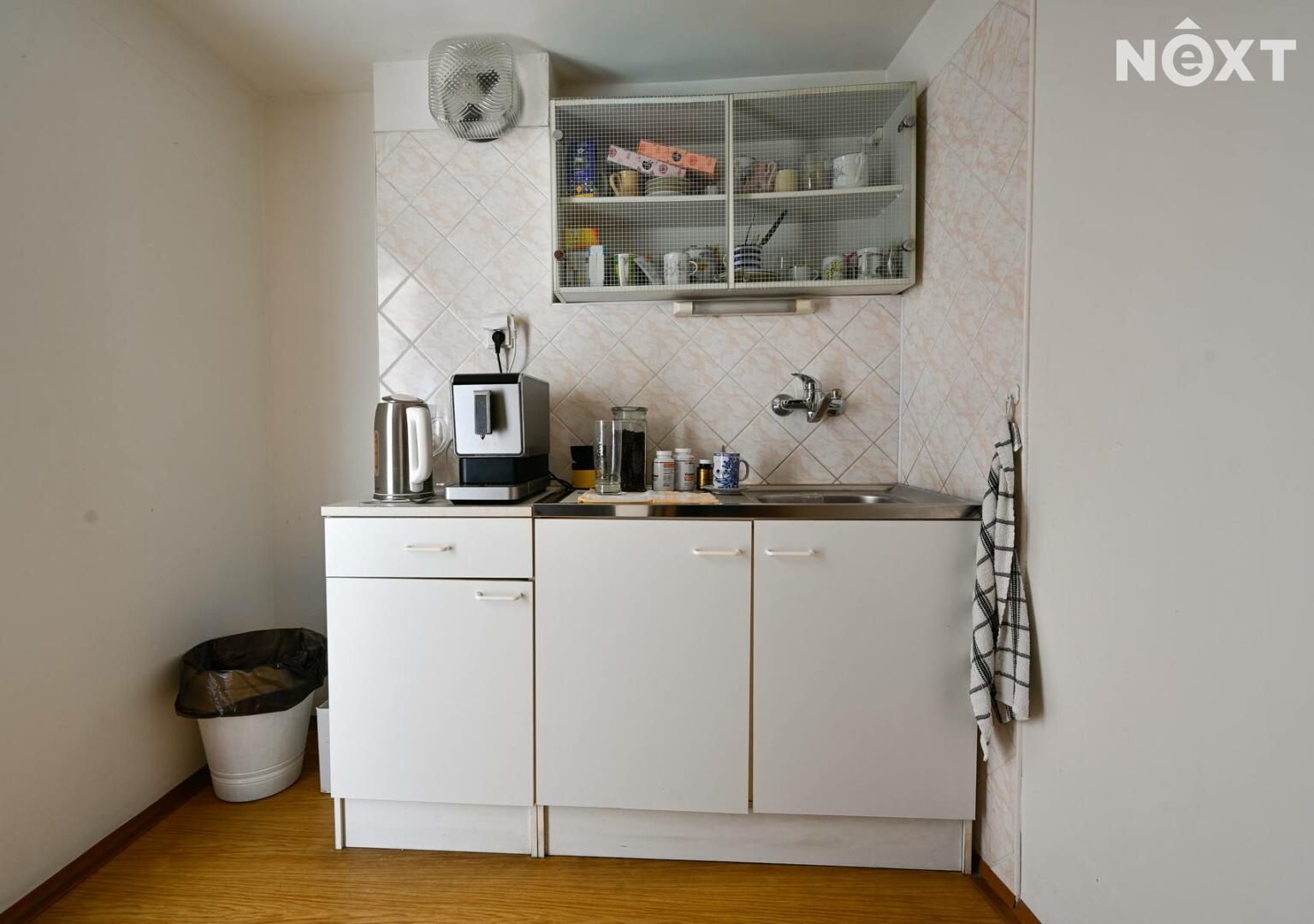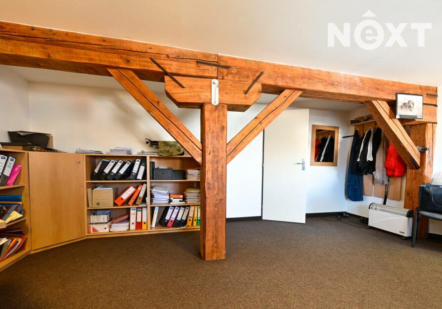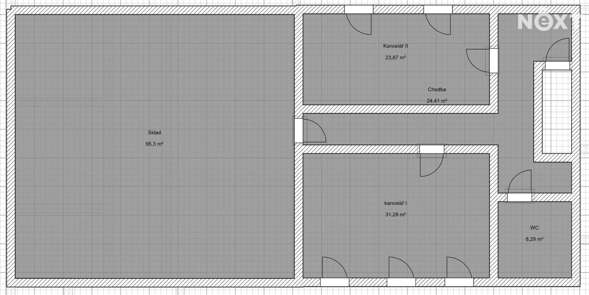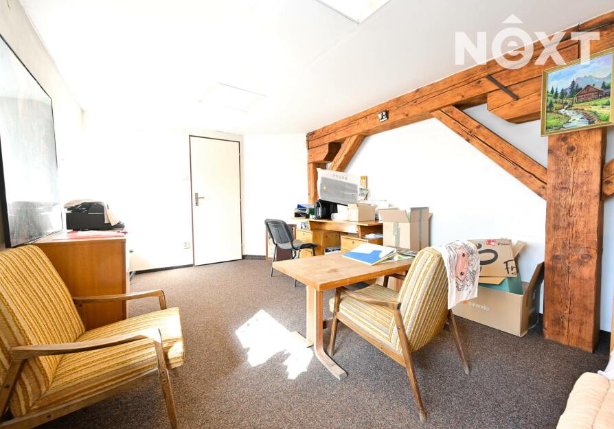 Patro (administrativa a sklady): V patře se nachází moderní kancelářské prostory (cca 55 m²) rozdělené na dvě samostatné kanceláře (31,28 m² a 23,87 m²) propojené chodbou, sociální zařízení (WC) a rozlehlý sklad o výměře 95,3 m².