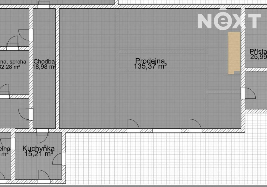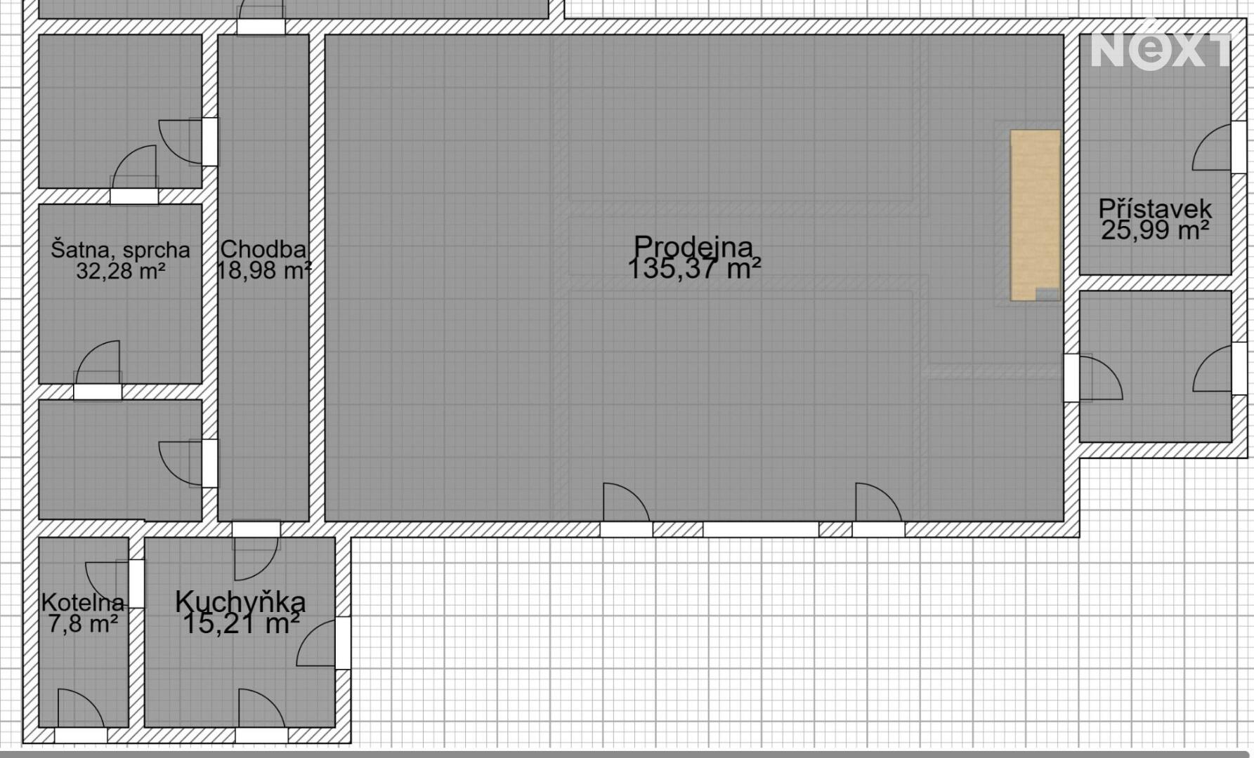 Přízemí (235 m²): Dominantou je obchodní prostor (prodejna) o výměře 135,37 m². Dále zde najdete kompletní zázemí: kuchyňku (15,21 m²), šatny se sprchami (32,28 m²), kotelnu a přístavky o celkové ploše 26 m².