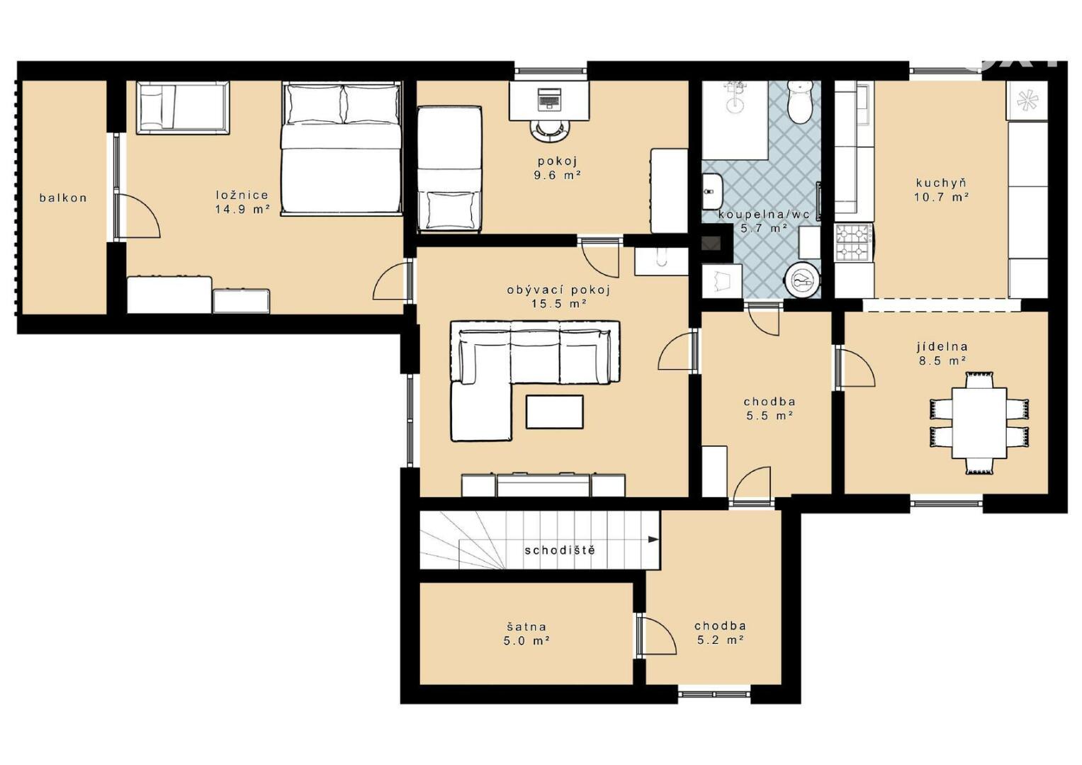 Vybavení a služby: Moderní kuchyňská linka se spotřebiči (myčka, trouba s varnou deskou, lednice), krb v obývacím pokoji a zahrada s terasou a grilem. Obecní vodovod i kanalizace. Rodinný dům si nový majitel převezme včetně vybavení.