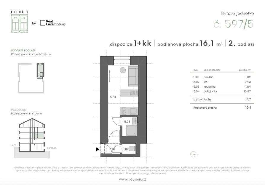Tato konkrétní jednotka č.5 o dispozici 1kk a podlahové ploše 16,1 m2 se nachází ve 2 nadzemním podlaží s výhledem do zahrady. Je členěna na vstupní chodbu, oddělenou koupelnu, samostatnou toaletu a obývací pokoj s kuchyňským koutem. Přesné rozložení místností, či možný budoucí stav si můžete prohlédnout na přiloženém půdorysu a vizualizacích.