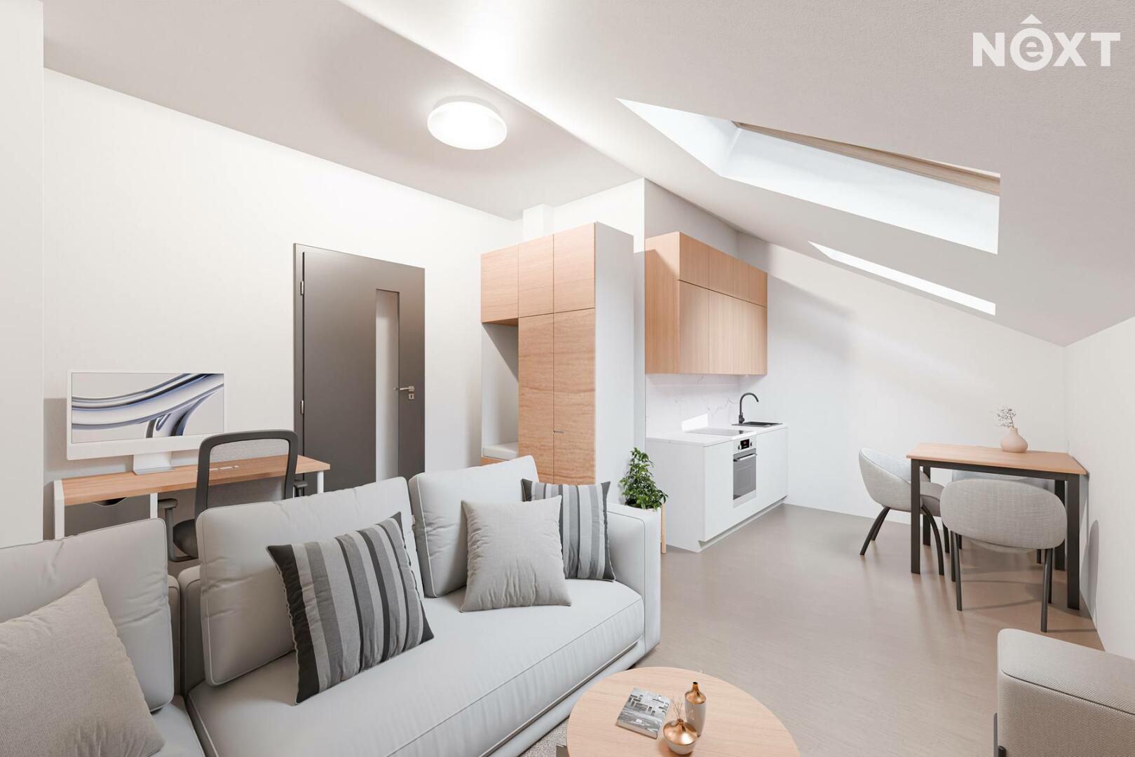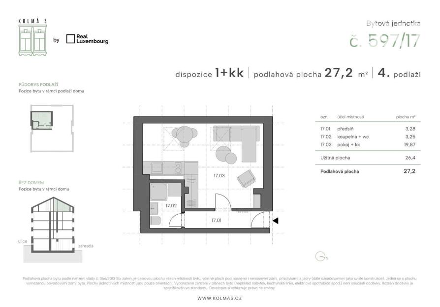 Tato konkrétní jednotka č.17 o dispozici 1kk a podlahové ploše 27,2 m2 se nachází ve 4 nadzemním podlaží s výhledem do zahrady. Je členěna na vstupní chodbu ze které je přístup do koupelny s wc, a dále obývacího pokoje s kuchyňským koutem. Přesné rozložení místností, či možný budoucí stav si můžete prohlédnout na přiloženém půdorysu a vizualizacích.