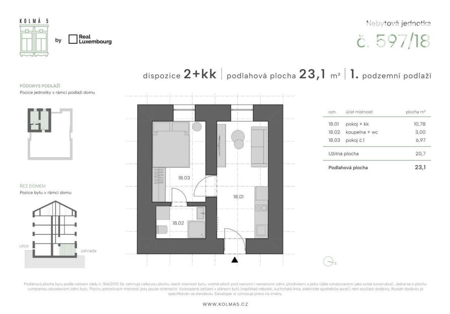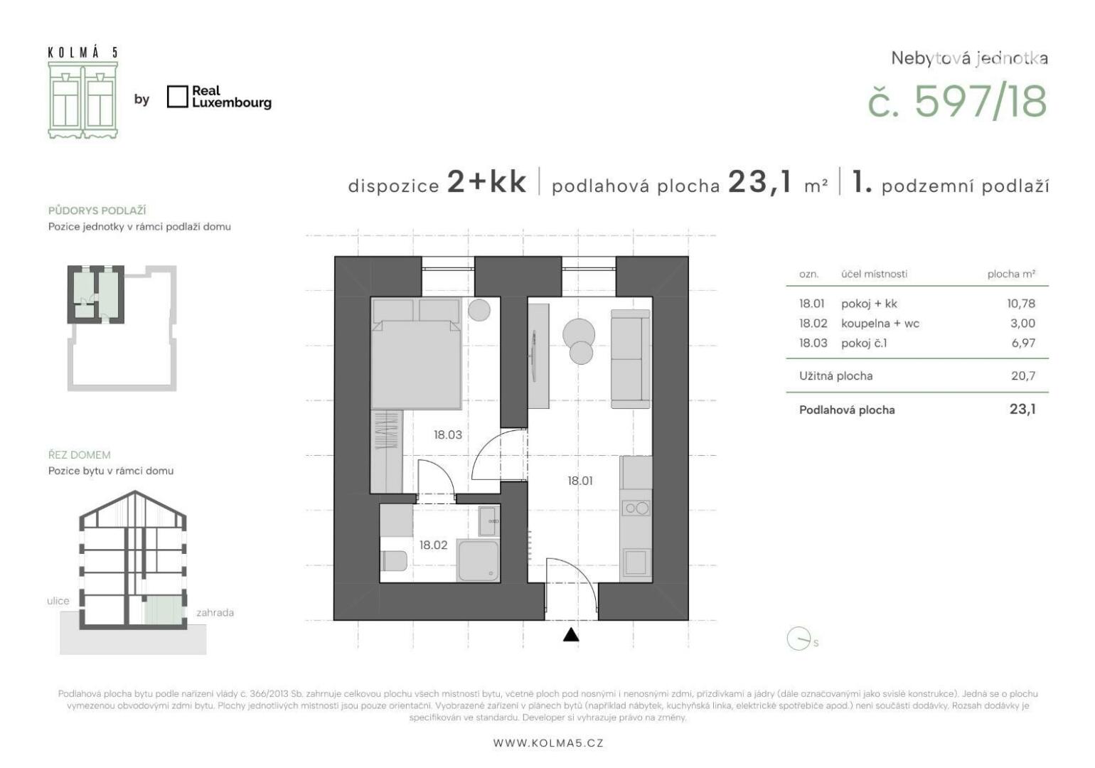 Tato konkrétní jednotka č.18 o dispozici 2kk a podlahové ploše 23,1 m2 se nachází v 1 podzemním podlaží s výhledem do ulice. Přesné rozložení si můžete prohlédnout na přiloženém půdorysu.
