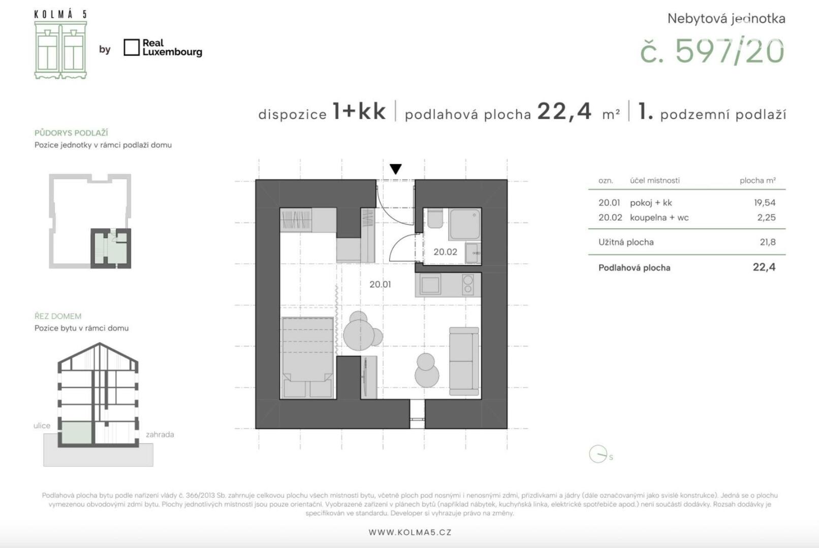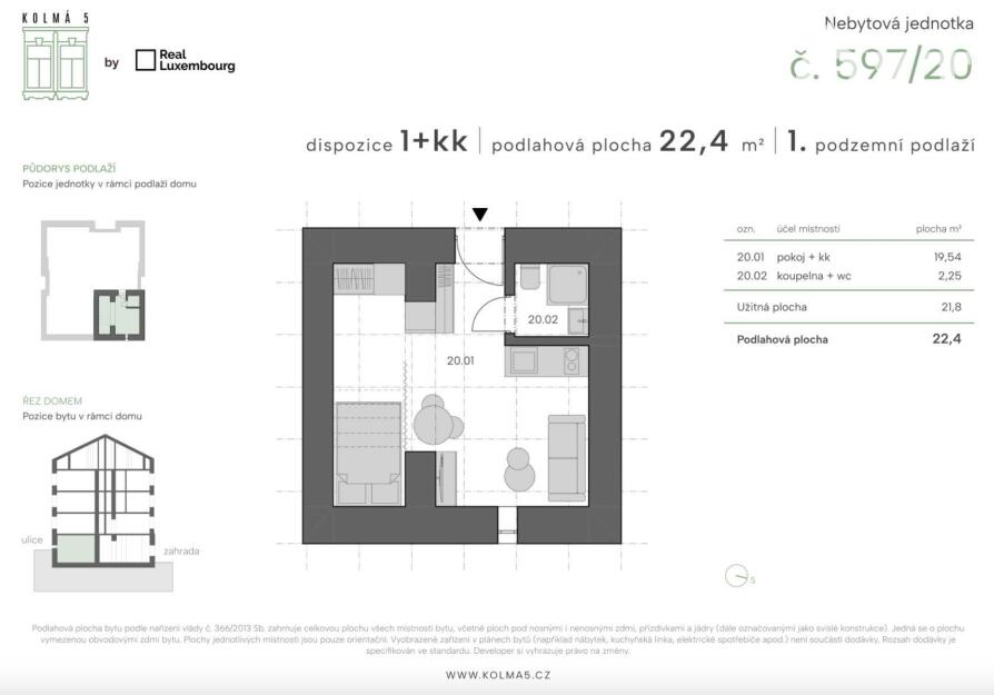 Tato konkrétní jednotka č.20 o dispozici 1kk a podlahové ploše 22,4 m2 se nachází v 1 podzemním podlaží s výhledem do ulice. Přesné rozložení si můžete prohlédnout na přiloženém půdorysu.