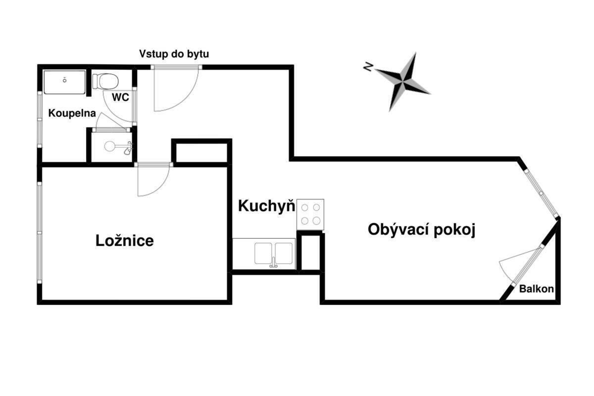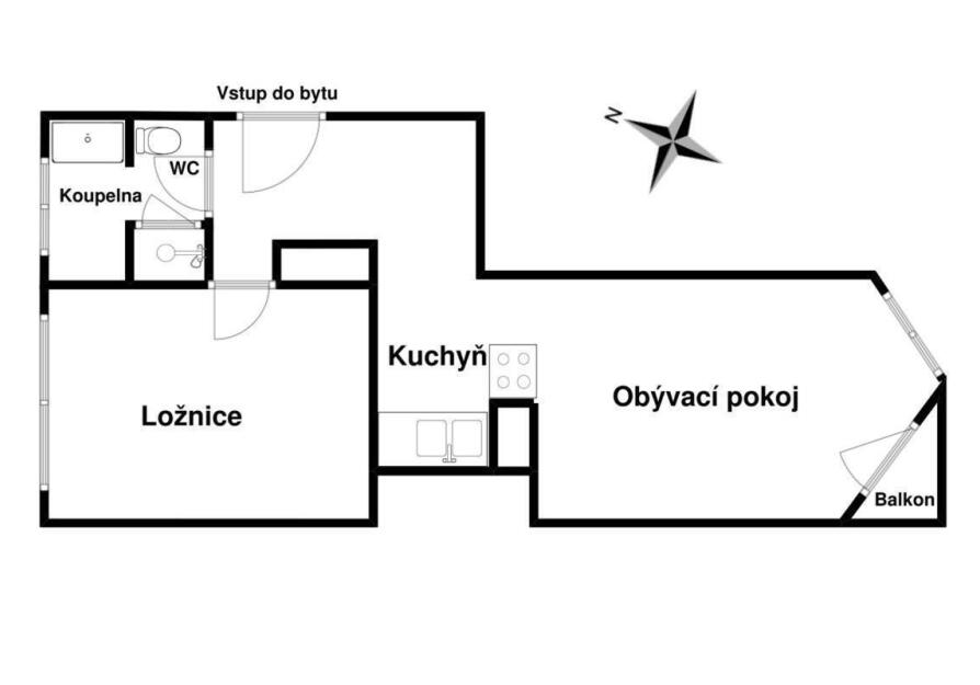 Byt nabízí velmi příjemné dispoziční řešení s důrazem na komfort a praktičnost. Obývací pokoj s kuchyňským koutem tvoří vzdušný a světlý prostor s přímým vstupem na balkon, orientovaný na jižní stranu do klidného vnitrobloku, což zajišťuje maximální soukromí a dostatek denního světla. Samostatná ložnice přístupná z chodby vytváří oddělenou klidovou zónu ideální pro odpočinek.