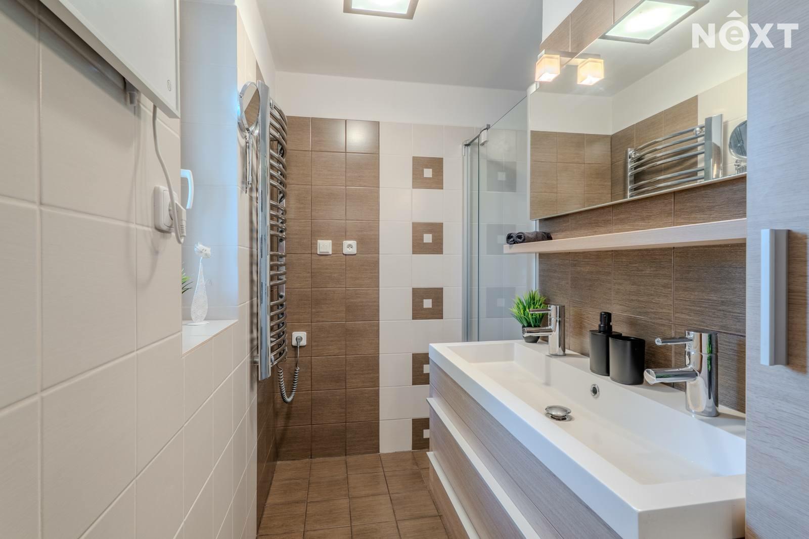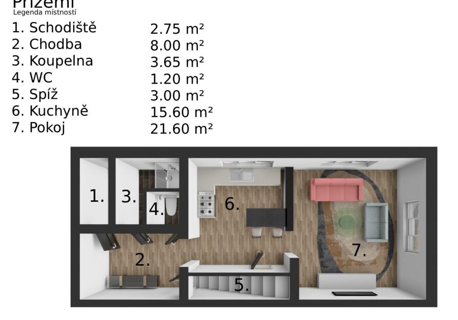 Přízemí - obývací pokoj (21,6 m2), kuchyně s jídelnou (15,6 m2), chodba (8 m2), koupelna (3,65 m2), WC (1,2 m2), schodiště (2,75 m2), spíž (3 m2). V koupelně je dvojumyvadlo, sprchový kout, el. žebřík i infrapanel. Kuchyně nabízí moderně zařízenou kuchyňskou linku vč. vestavěných spotřebičů.
