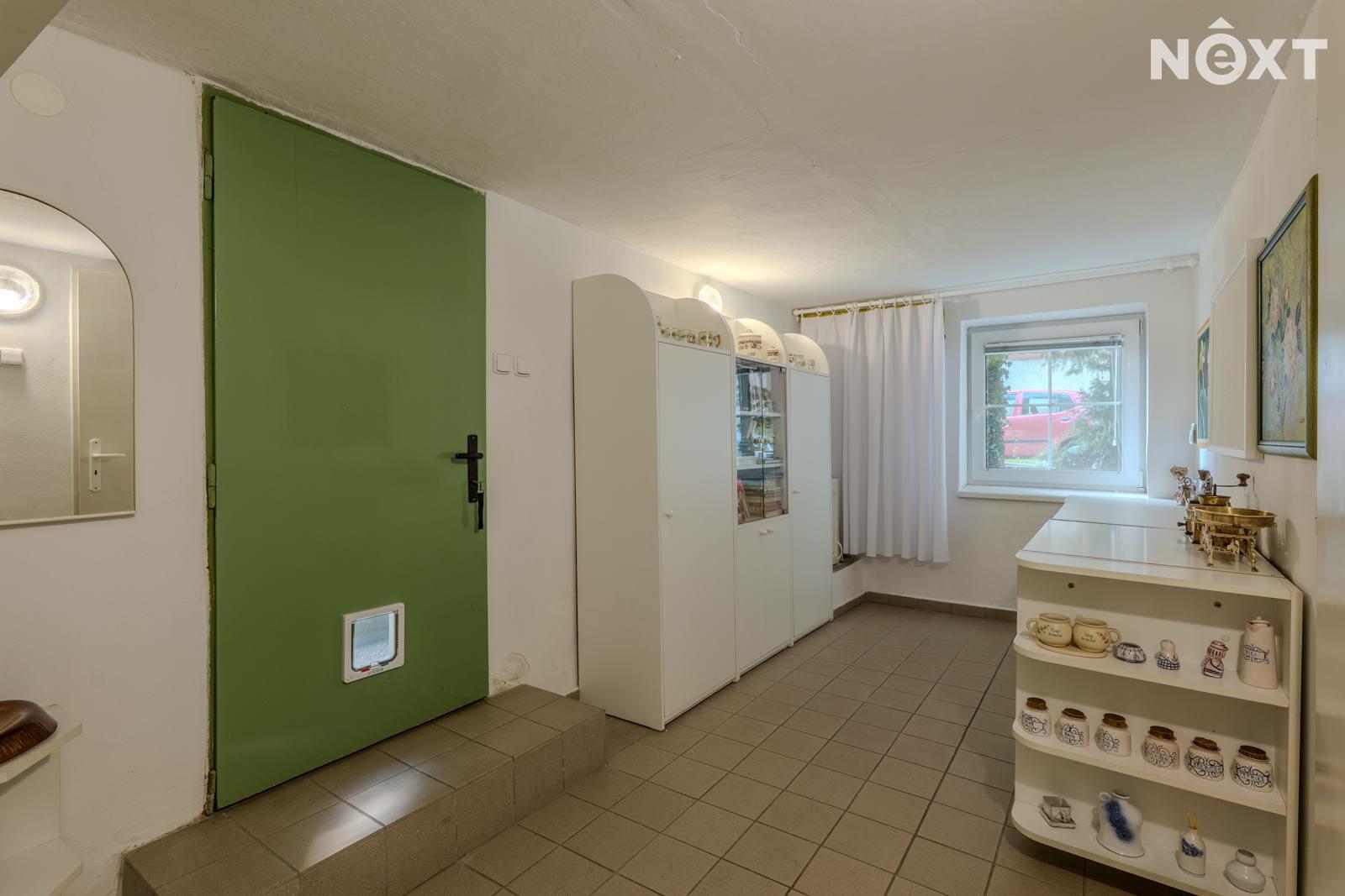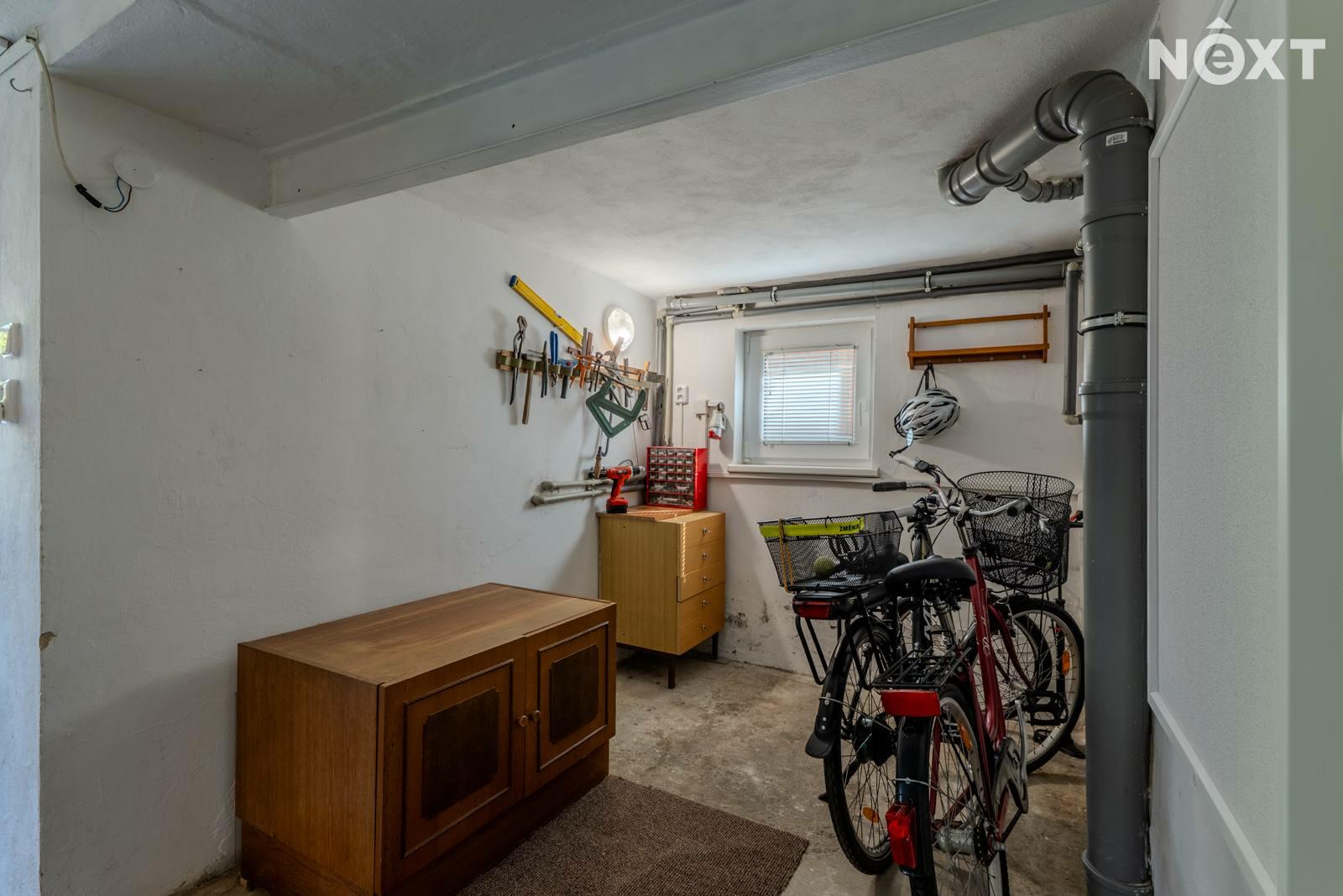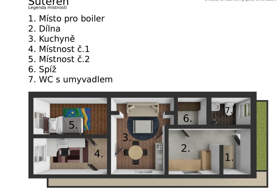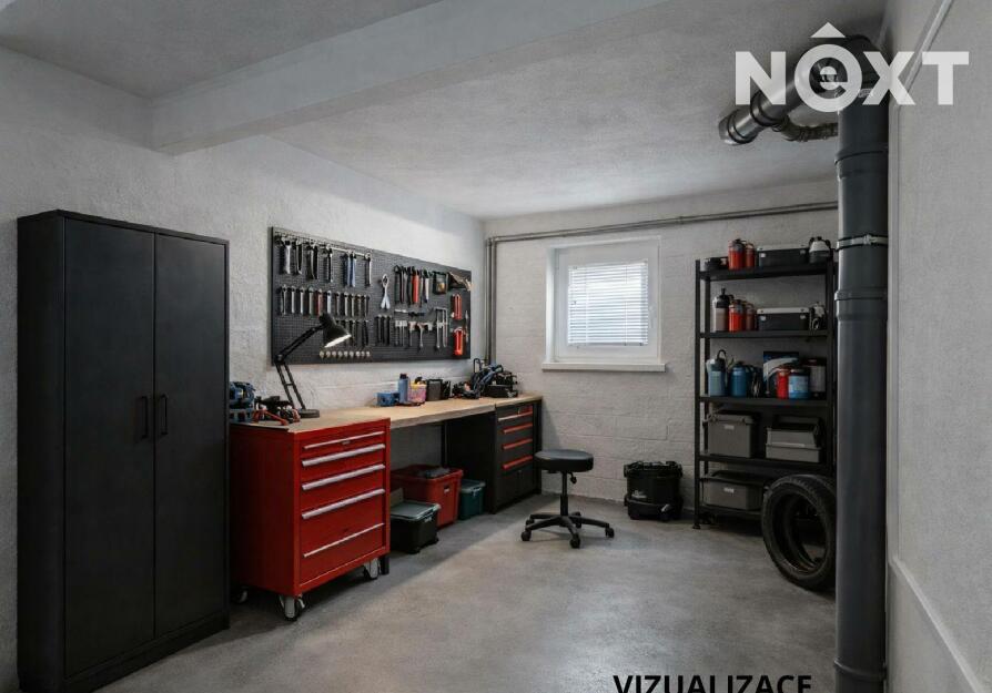 Suterén - samostatné WC s umyvadlem, technická místnost, dvě spíše s možností předělat na budoucí koupelnu a dílnu, kuchyně a dvě místnosti, které čekají na své využití např. v podobě podnikání nebo pokoje pro návštěvy. Kuchyně poskytuje příjemný chlad i v parnějším létě. Do sklepních místností vedou dvoje dveře. Jedny se nachází pod pergolou, druhé z boku domu. Zastřešená pergola je dalším ideálním místem pro posezení a chvíle odpočinku.