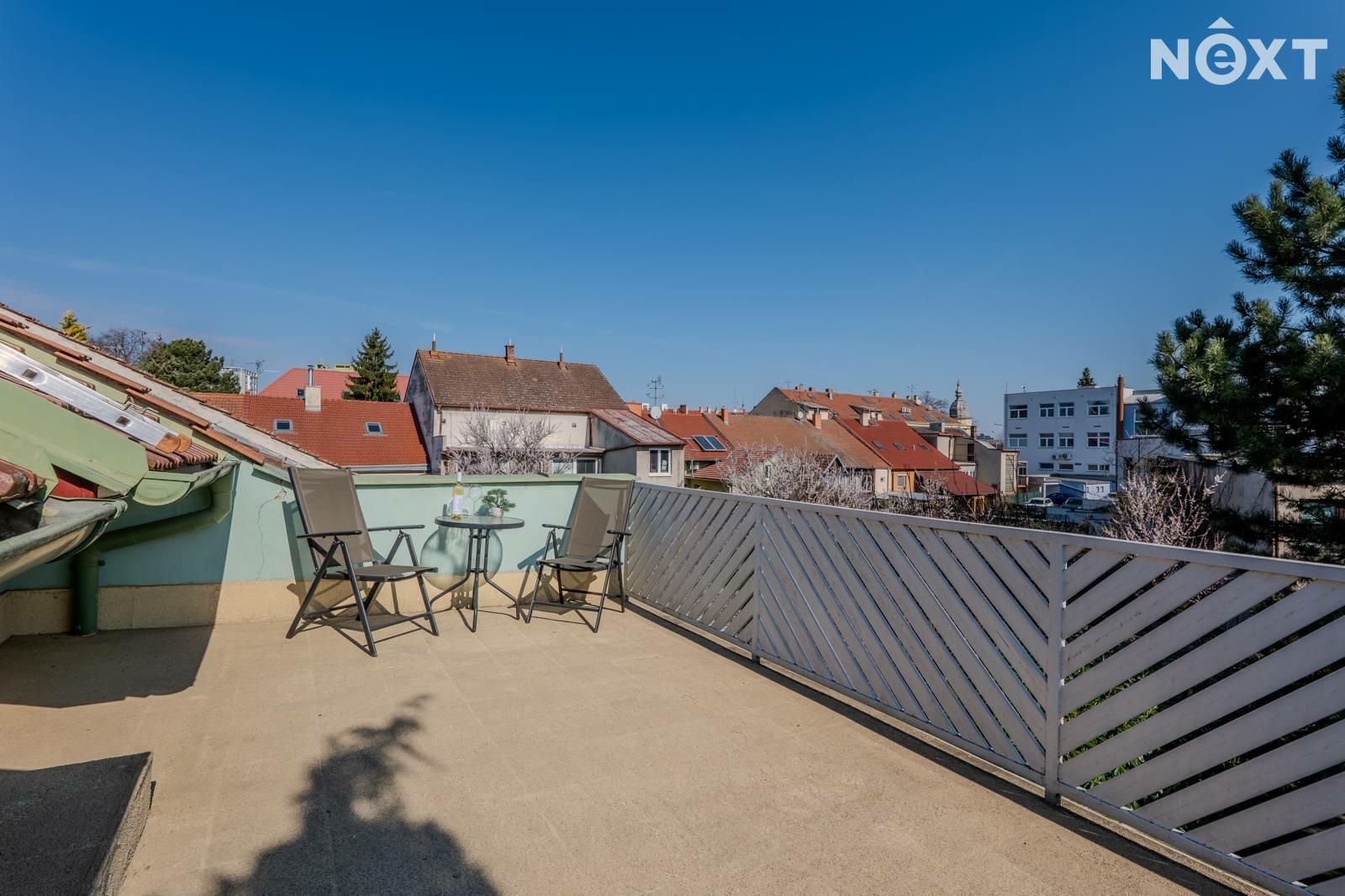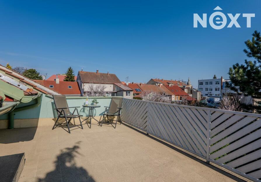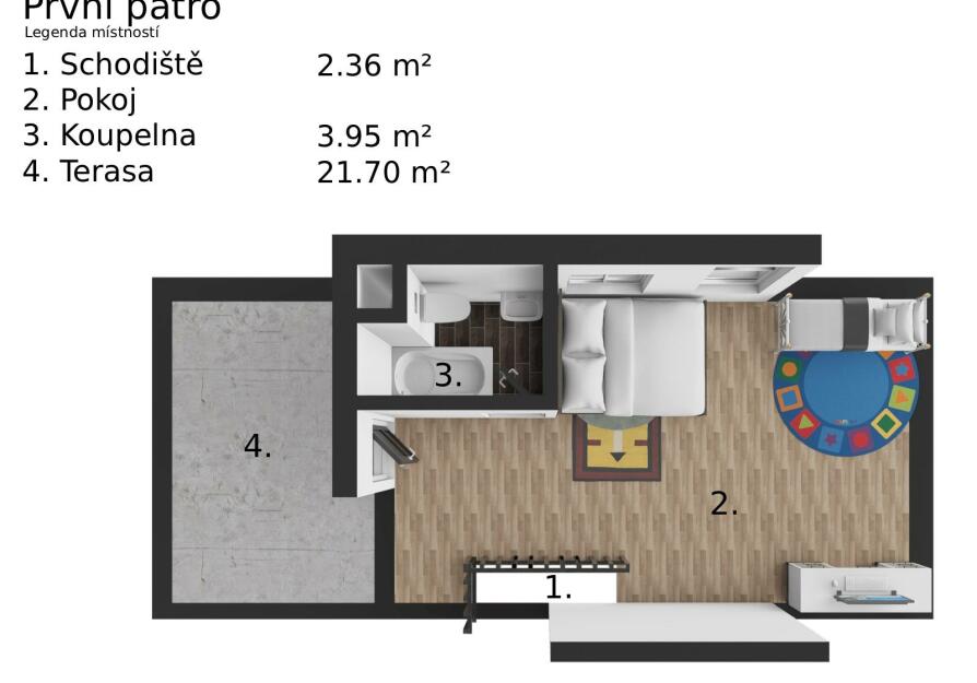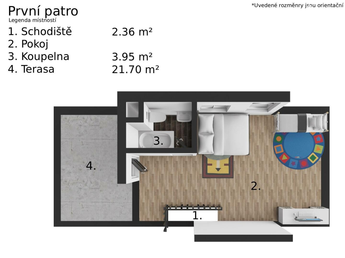 Patro - pokoj (25,4 m2) s možností přepažit na dvě místnosti, chodba (17,5 m2), koupelna (3,95 m2), schodiště (2,36 m2), terasa (21,7 m2). V koupelně je vana, WC, umyvadlo a el. žebřík. Prostorná terasa Vám nabízí dostatek místa pro posezení a relaxaci.