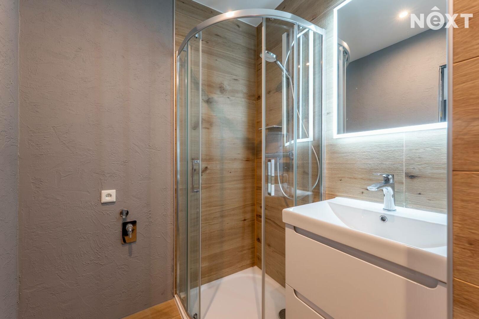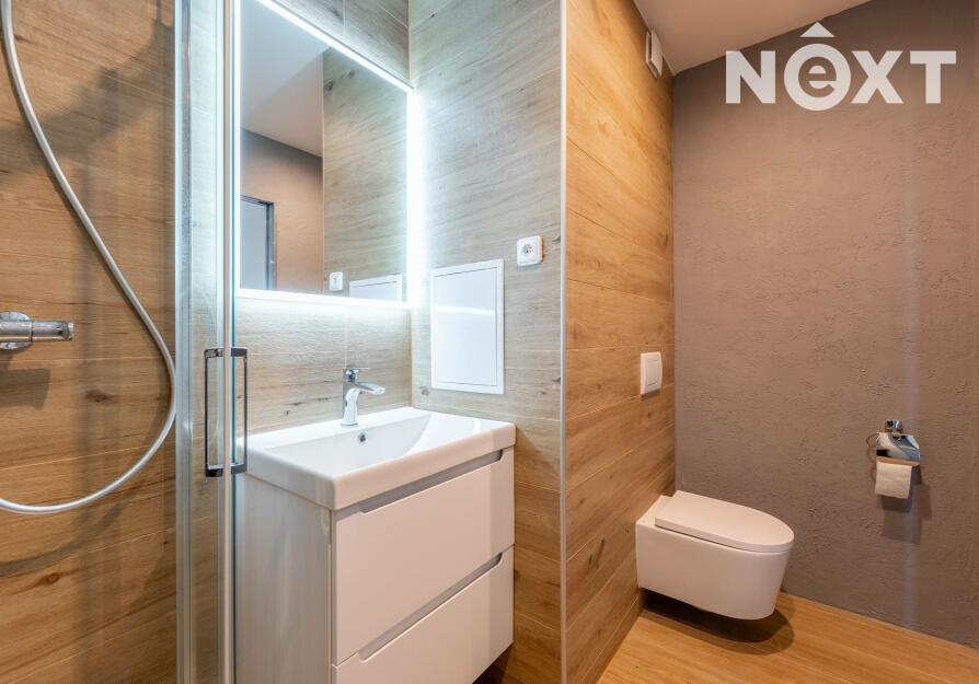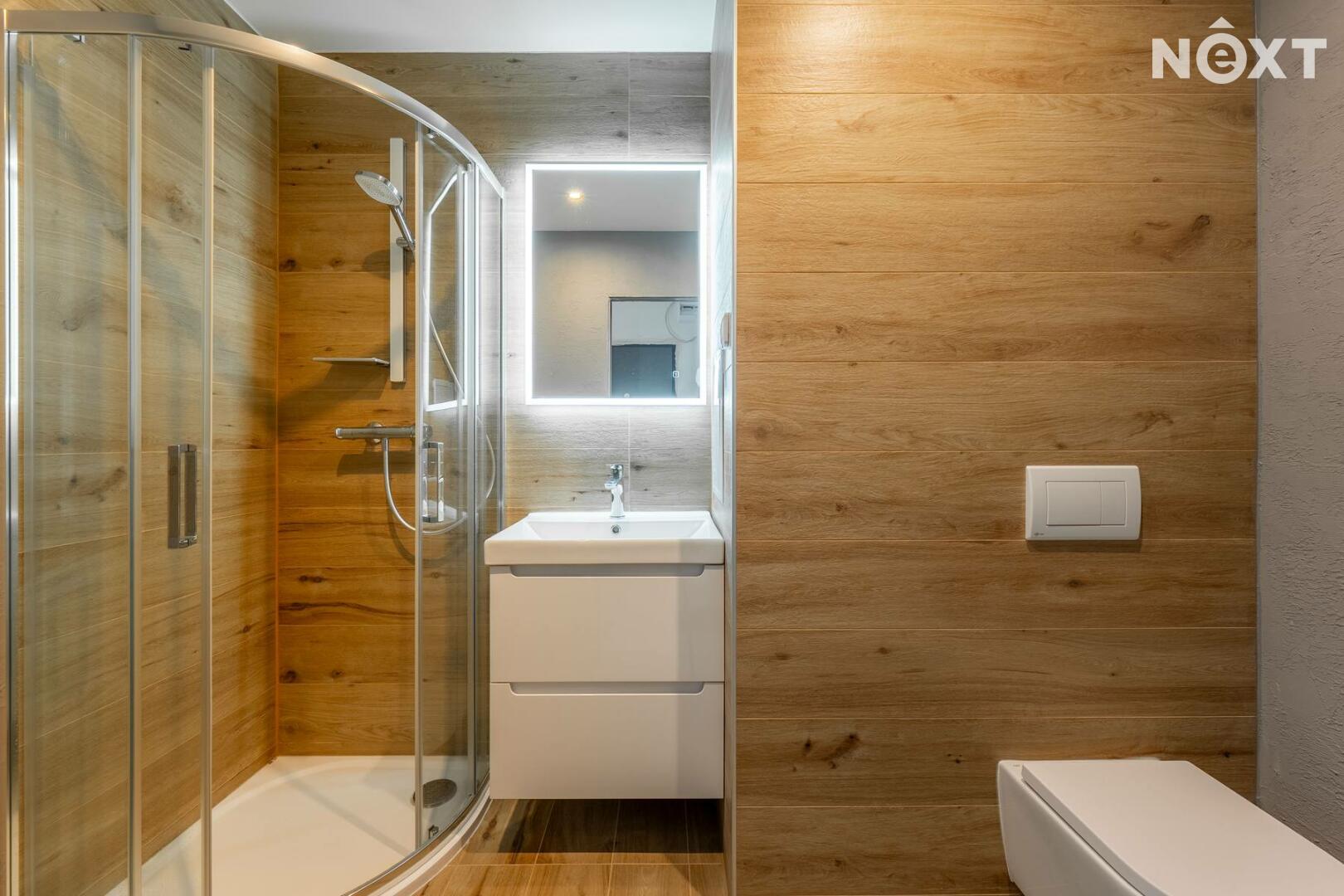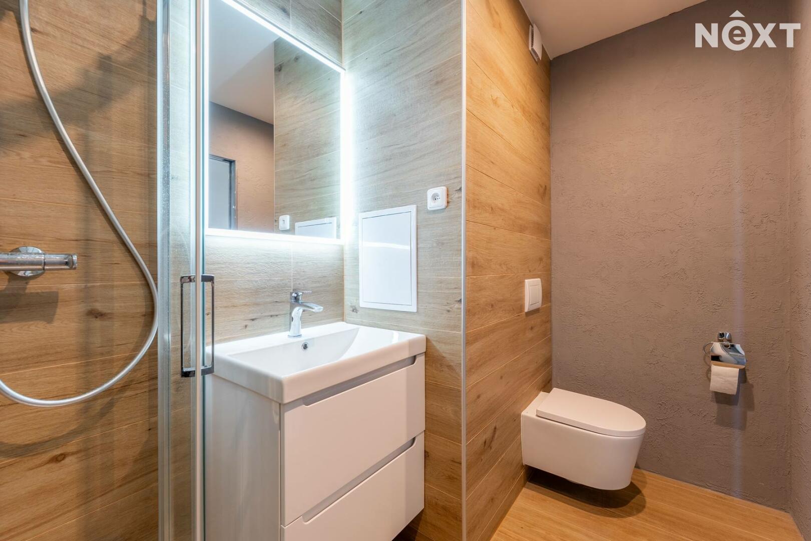 Byt má neprůchozí ložnici a obývací pokoj s novou, plně kuchyní vybavenou kombinovanou lednicí, indukční varnou deskou, troubou, MWT a digestoří. Koupelna se sprchovým koutem a umyvadlem je společná s toaletou.