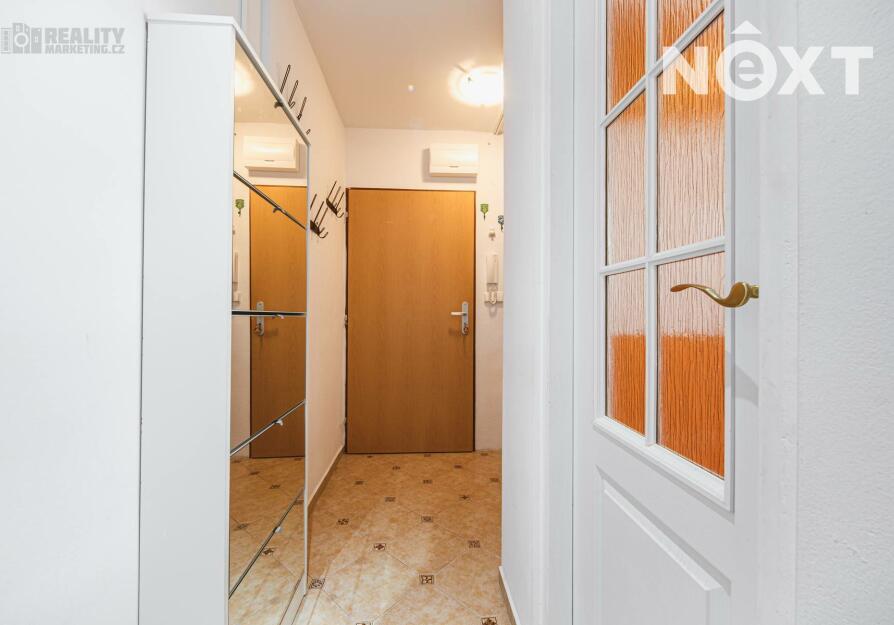 Byt je jen částečně vybavený – kuchyňská linka se spotřebiči (trouba, varná deska, digestoř, lednice, myčka), koupelnový nábytek, pohovka v obýváku a šatní skříň v ložnici, botníky na chodbě.