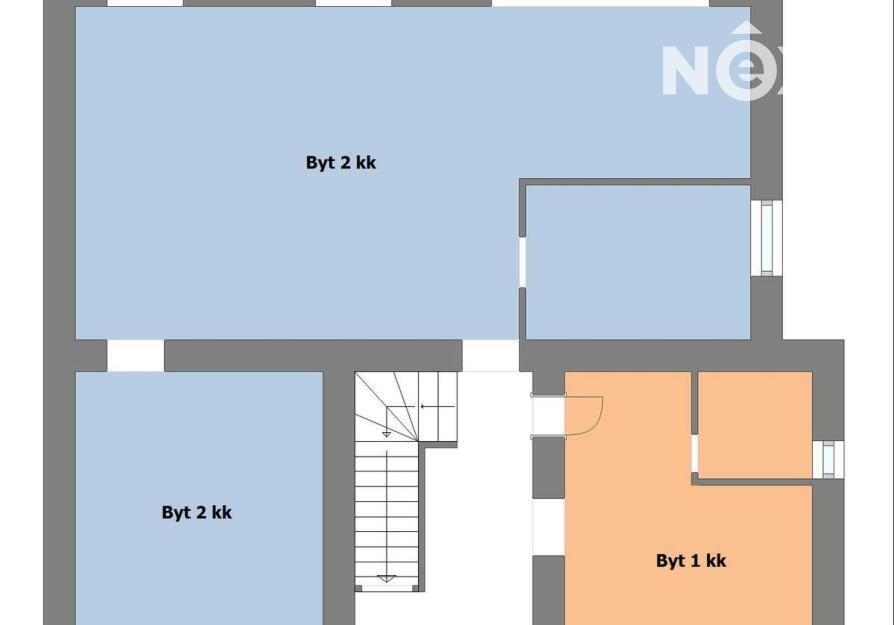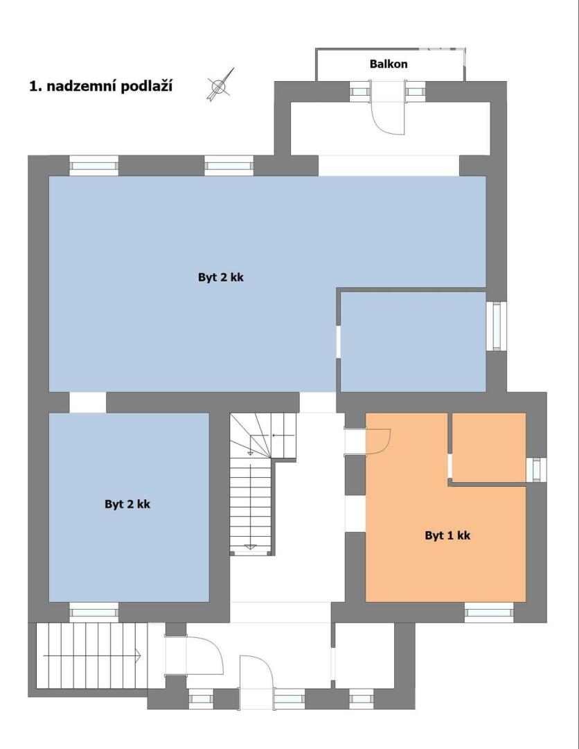 první nadzemní podlaží - dvě bytové jednotky o dispozici 1+kk (cca 20 m2) a 2+kk (cca 79 m2)