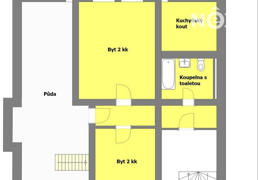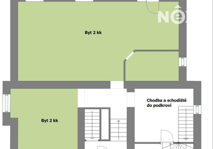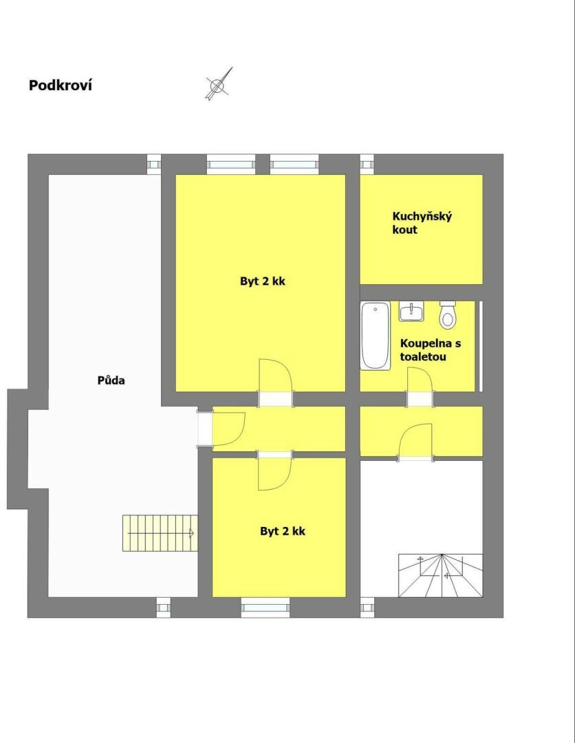 podkroví - jedna bytová jednotka o dispozici 2+kk (cca 54 m2)