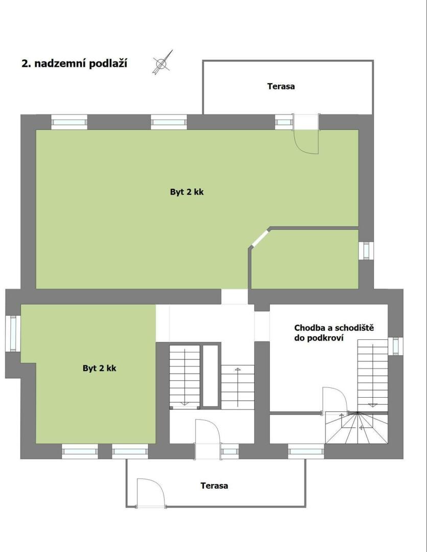 druhé nadzemní podlaží - jedna bytová jednotka o dispozici 2+kk (cca 75 m2) s balkonem (cca 10 m2)