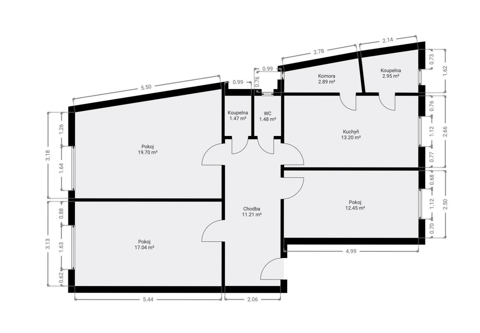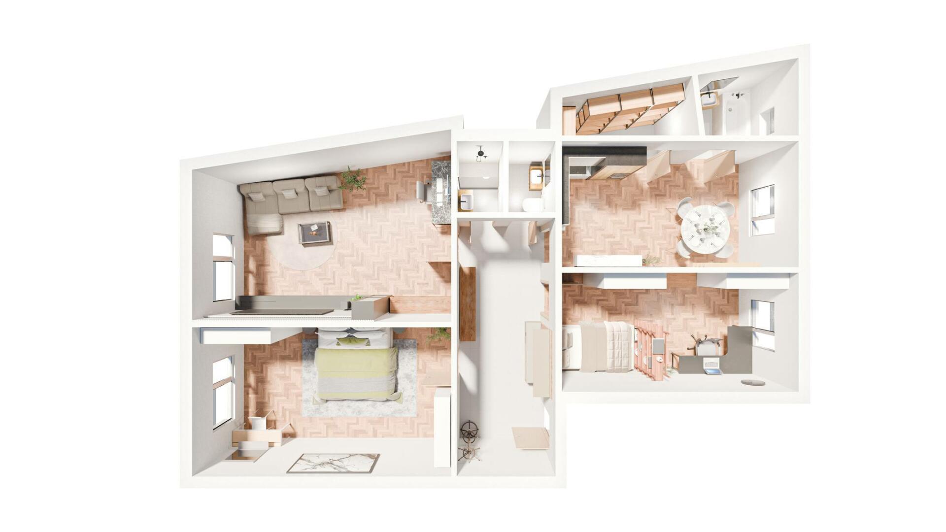 Byt má ideální rodinnou dispozici 4+kk s podlahovou plochou 89,7 m2. Skládá se ze třech plnohodnotných pokojů s plochami 19,7 m2, 17 m2 a 12,5 m2, prostorné kuchyně (13,2 m2) kam se ideálně vejde jídelna pro celou rodinu, předsíně, resp. chodby (11,2 m2), dvou koupelen, jedna s vanou (2,95 m2) a druhá se sprchovým koutem (1,5 m2), samostatné toalety (1,5 m2) a prostornou komorou (2,9 m2), „špajskou“, přístupnou přímo z kuchyně.