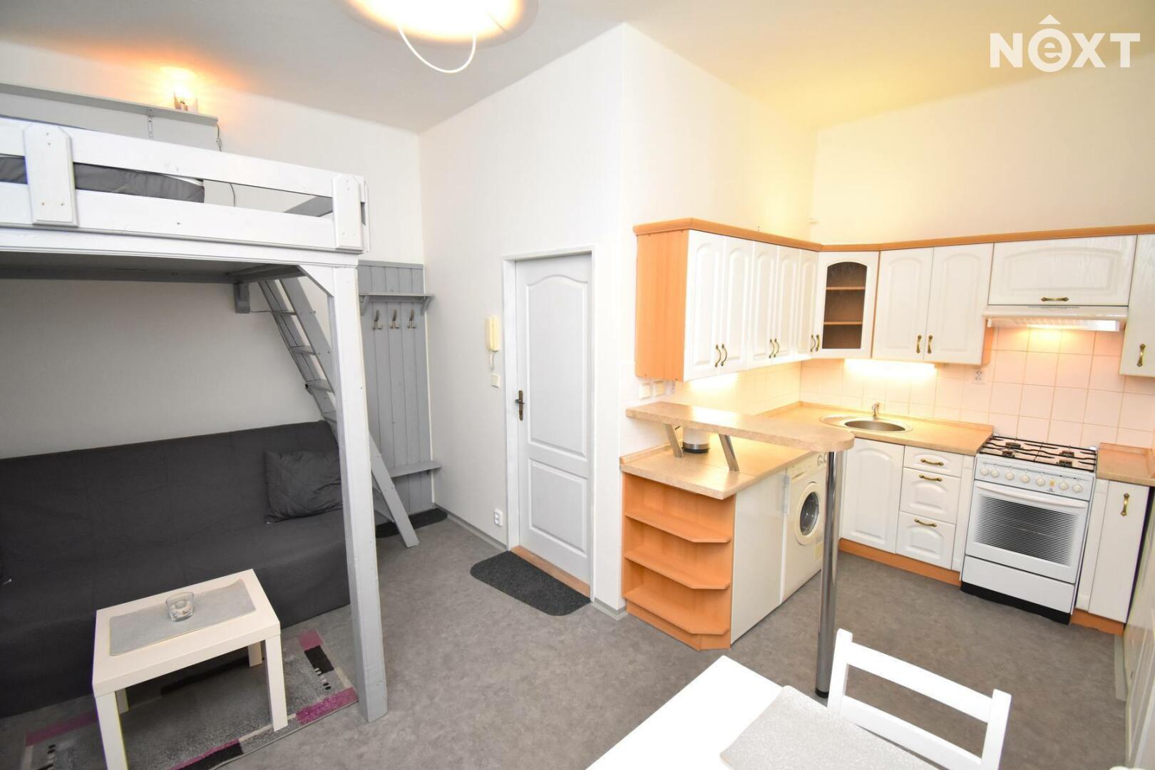 Vybavení bytu: kuchyňská linka s vařičem, lednice, pračka, postel ve zvýšeném patře, šatní skříň, úložné prostory, TV a sedací souprava. Podlahovou krytinu tvoří plovoucí podlaha a dlažba. Internetové připojení je v ceně nájmu.