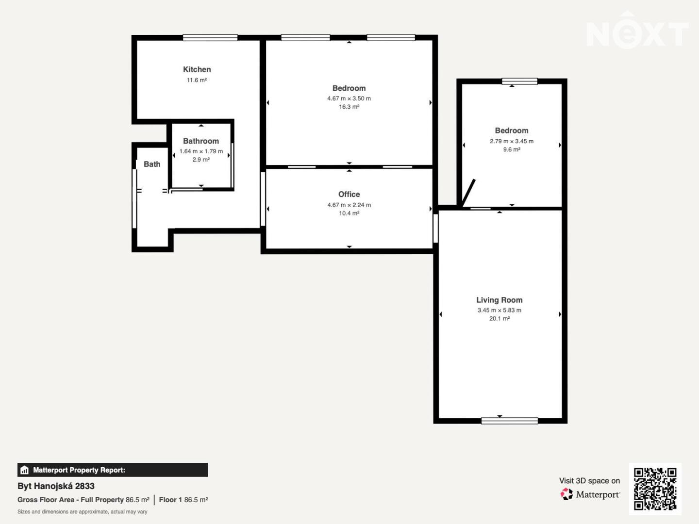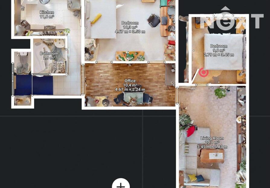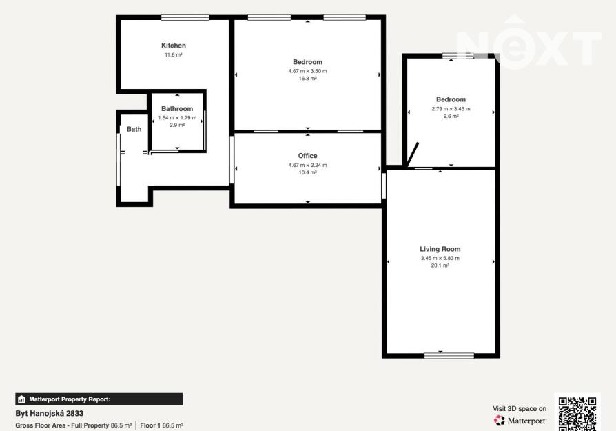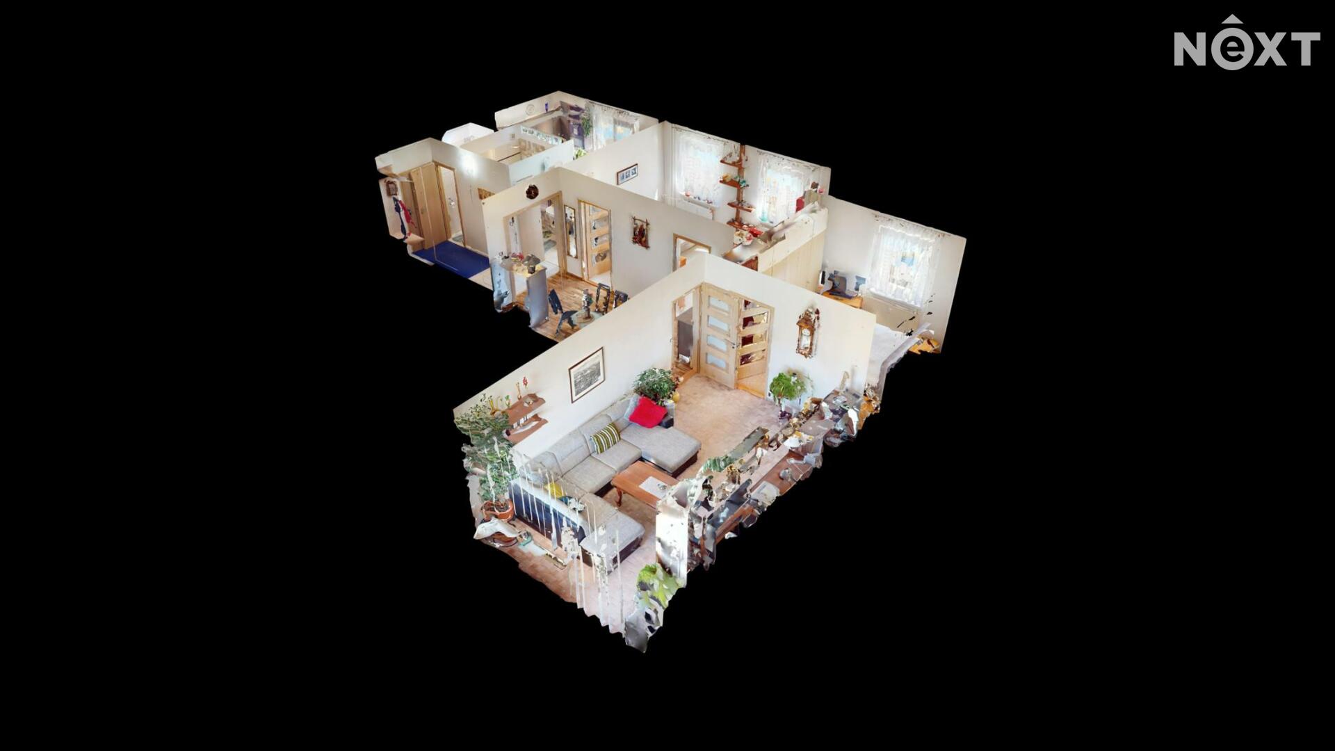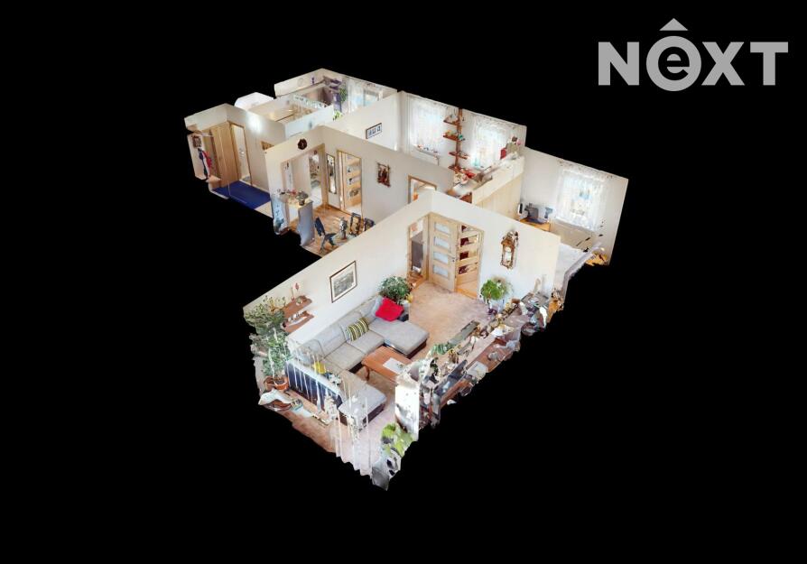 Dispozice: předsíň cca 4,3 m2, hala cca 13,7 m2, WC cca 1,0 m2, koupelna cca 2,8 m2, obývací pokoj cca 20,3 m2, ložnice cca 12,0 m2, pokoj cca 16,4 m2, kuchyně cca 7,9 m2 s kuchyňskou linkou s elektrospotřebiči.