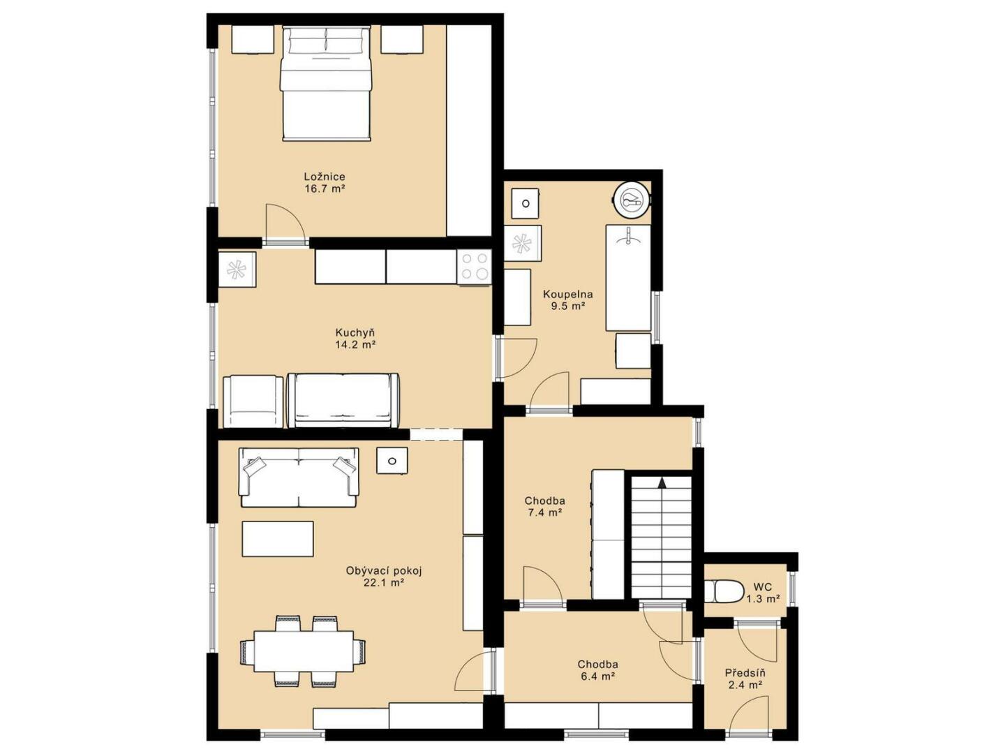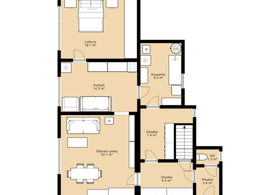 Obývací pokoj o výměře 22 m², kuchyň 14 m², ložnice 16 m², koupelna 9 m², chodba 7,4 m², druhá chodba 6,4 m², předsíň 2,4 m², samostatné WC 1,5 m² a pokoj v patře o velikosti 9 m². Tato část je vhodná jako hlavní rodinné bydlení.