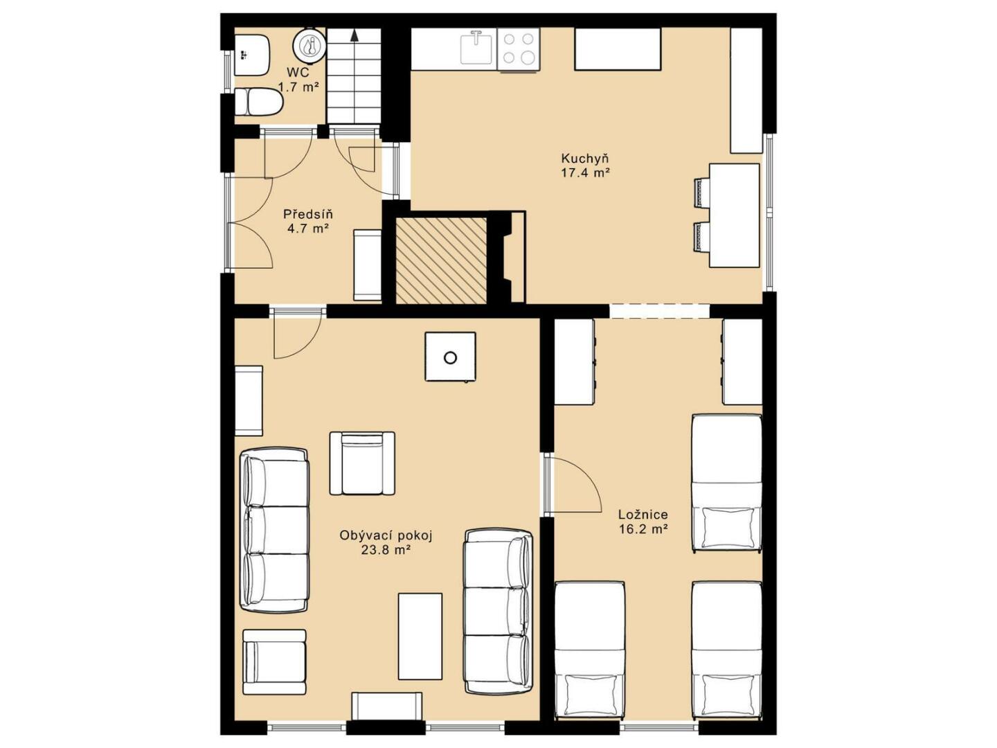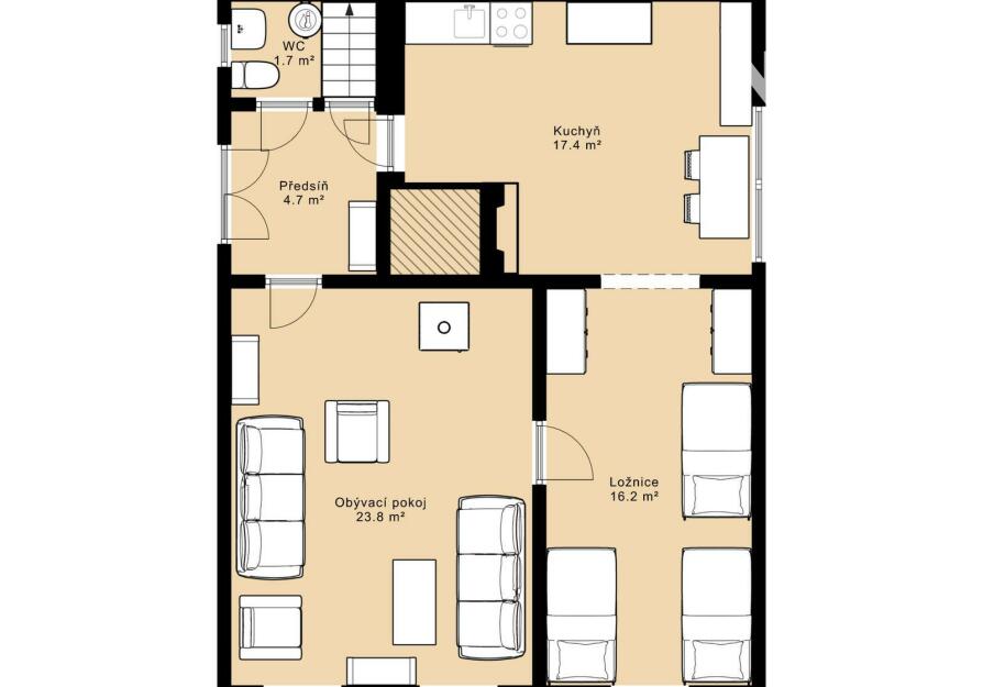 Obývací pokoj 23 m², ložnice 16 m², kuchyň 17 m², předsíň 4 m² a samostatné WC 1,7 m². Tato jednotka nabízí možnost samostatného bydlení pro další členy rodiny nebo využití k pronájmu.