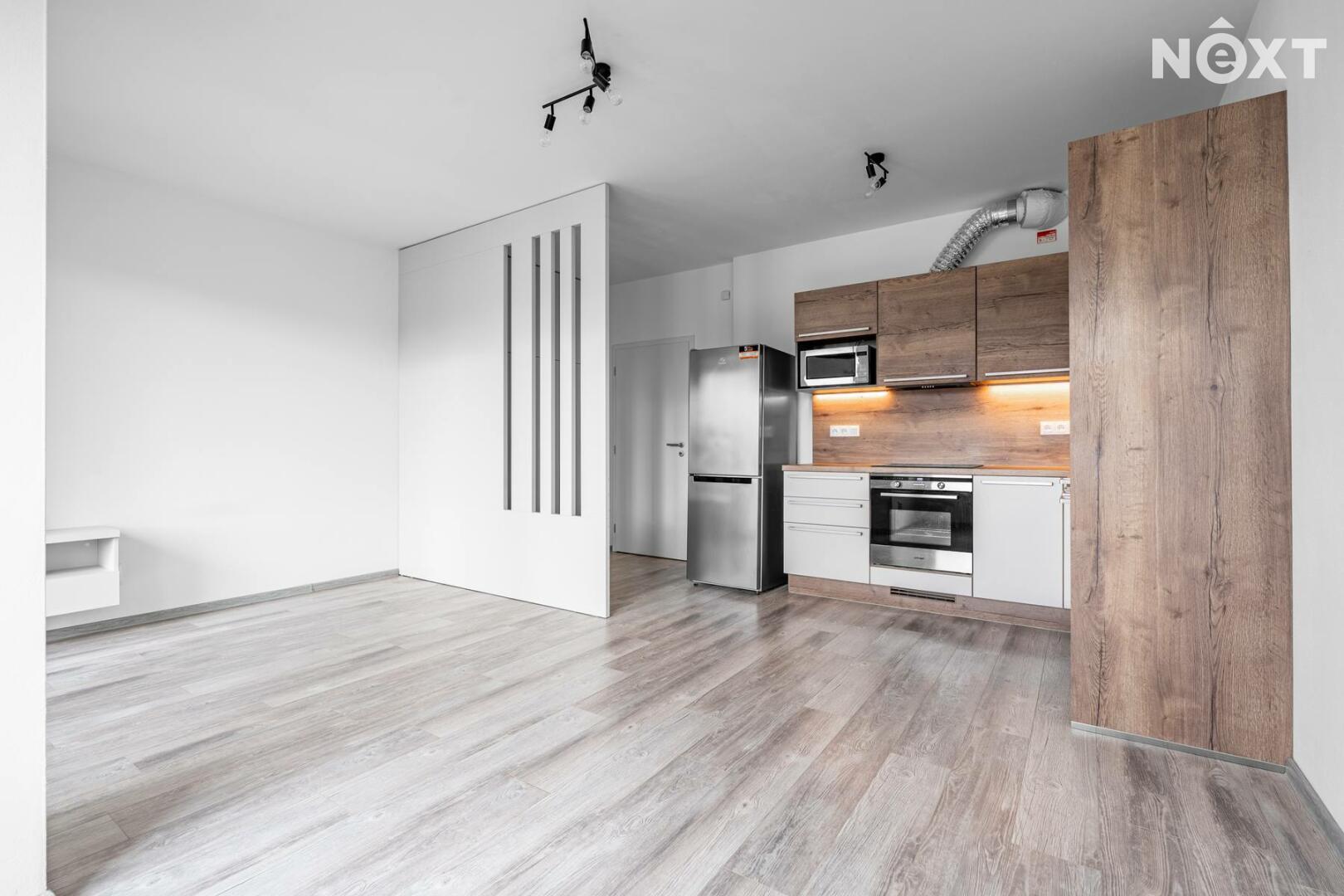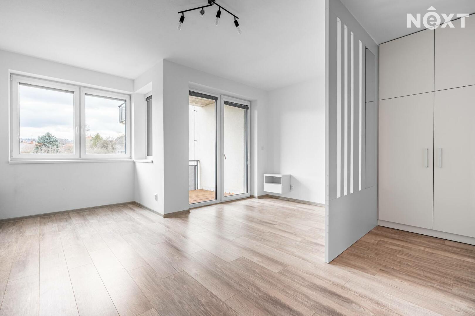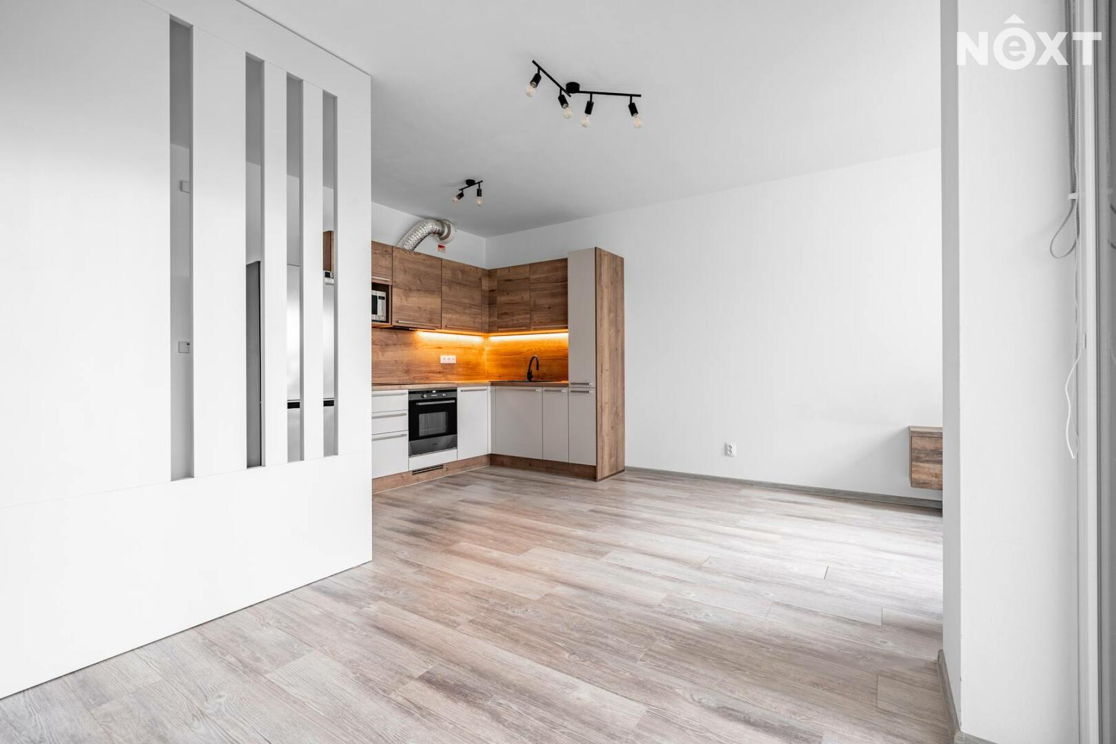Byt se pronajímá jako nevybavený, součástí však zůstává kuchyňská linka se spotřebiči a vestavěné skříně.