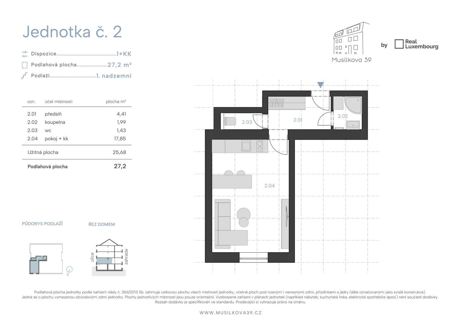 Rozdělení ploch: Pokoj s kuchyňským koutem (17,85 m2), prostorná předsíň (4,4 m2), plně vybavená koupelna se sprchovým koutem (2 m2) a samostatné WC (1,4 m2)