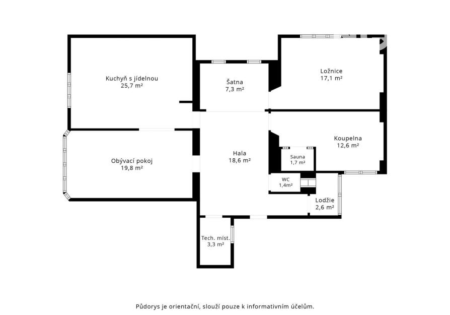 vstupní prostorná hala z níž jsou vstupy do všech místností a na 3 m2 velkou lodžii.