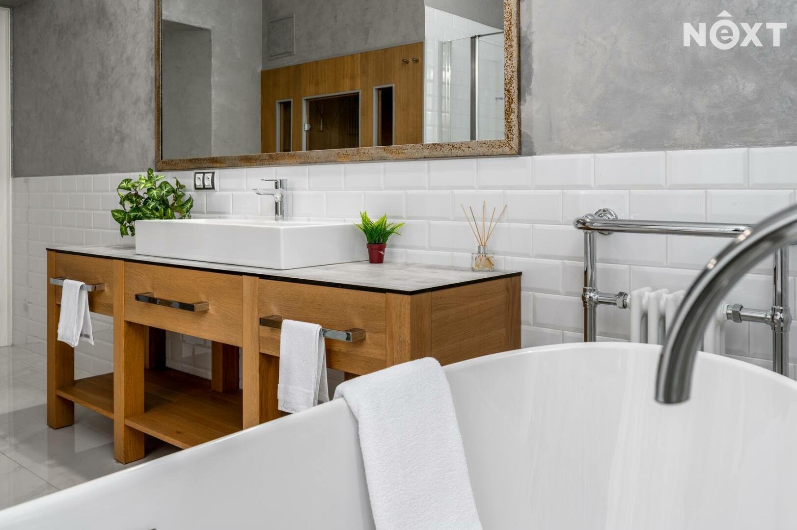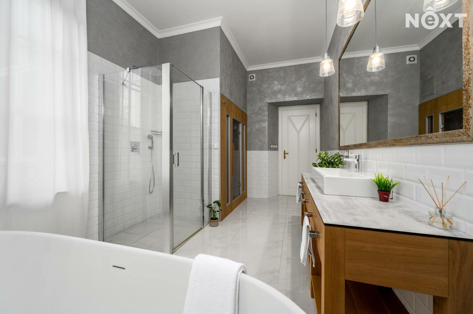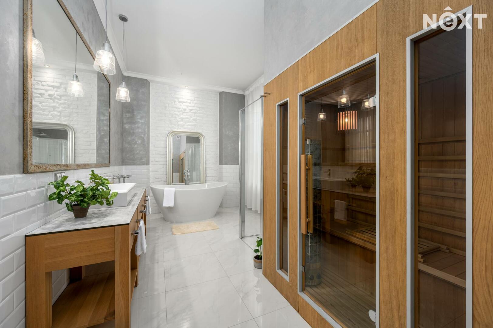 Další místnosti: obývací pokoj, kuchyně a jídelnou, ložnice se šatnou, koupelna se samostatnou vanou a saunou, toaleta, technická místnost. Pokoje jsou velmi vkusně zařízené s velmi příjemnou atmosférou.