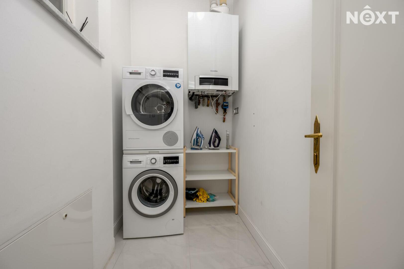 Kuchyňská linka (trouba Electrolux, digestoř Gurranti, myčka Siemens, vestavěná lednice s mrazákem Freestore). V komoře je kondenzační plynový kotel. Topení podlahové vodovodní.