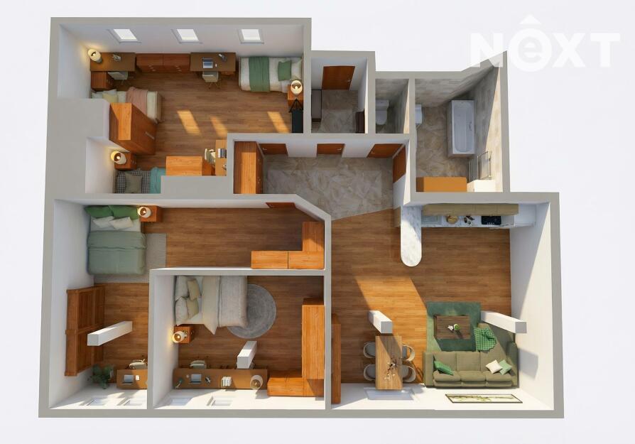Byt zaujme především svým velkorysým řešením – otevřený obytný prostor s kuchyní nabízí dostatek místa pro každodenní život i společné chvíle. Na něj navazují tři samostatné pokoje, které poskytují komfortní zázemí pro rodinu i dostatek soukromí.
