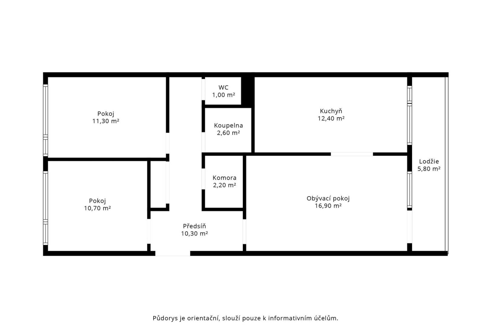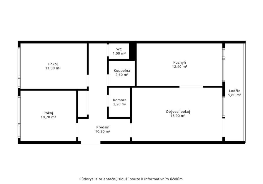 Celková plocha bytu včetně lodžie (5,8 m²) a zděného sklepa (1,2 m²) činí 75,4 m².