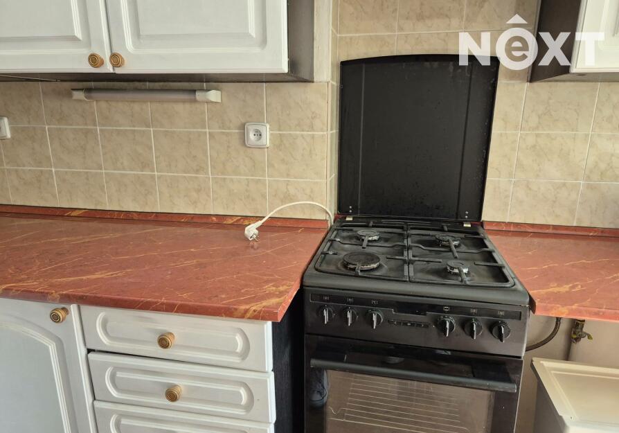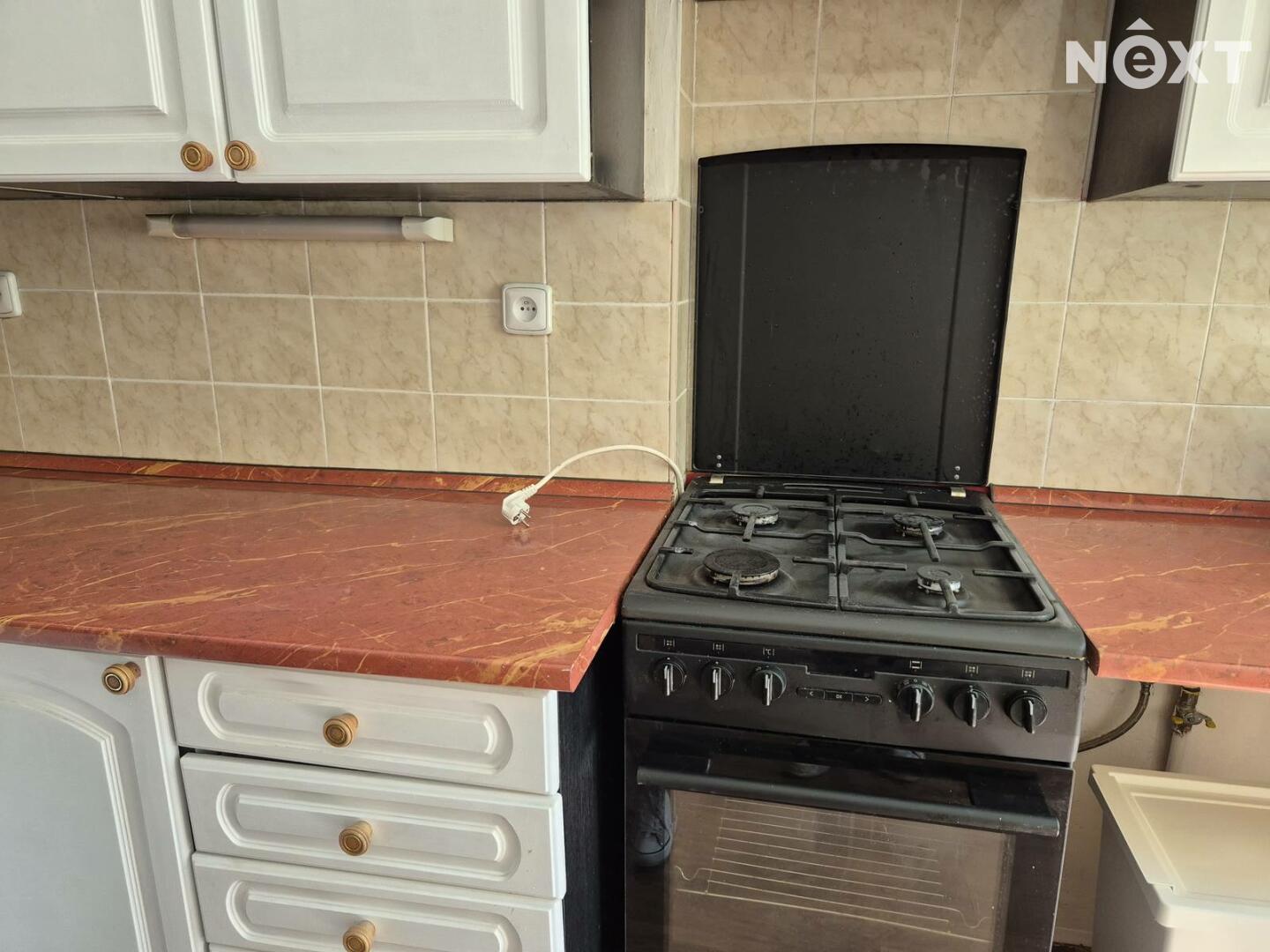 Na fotografiích můžete vidět prostornou kuchyň s linkou, která obsahuje plynový vařič, troubu a digestoř.