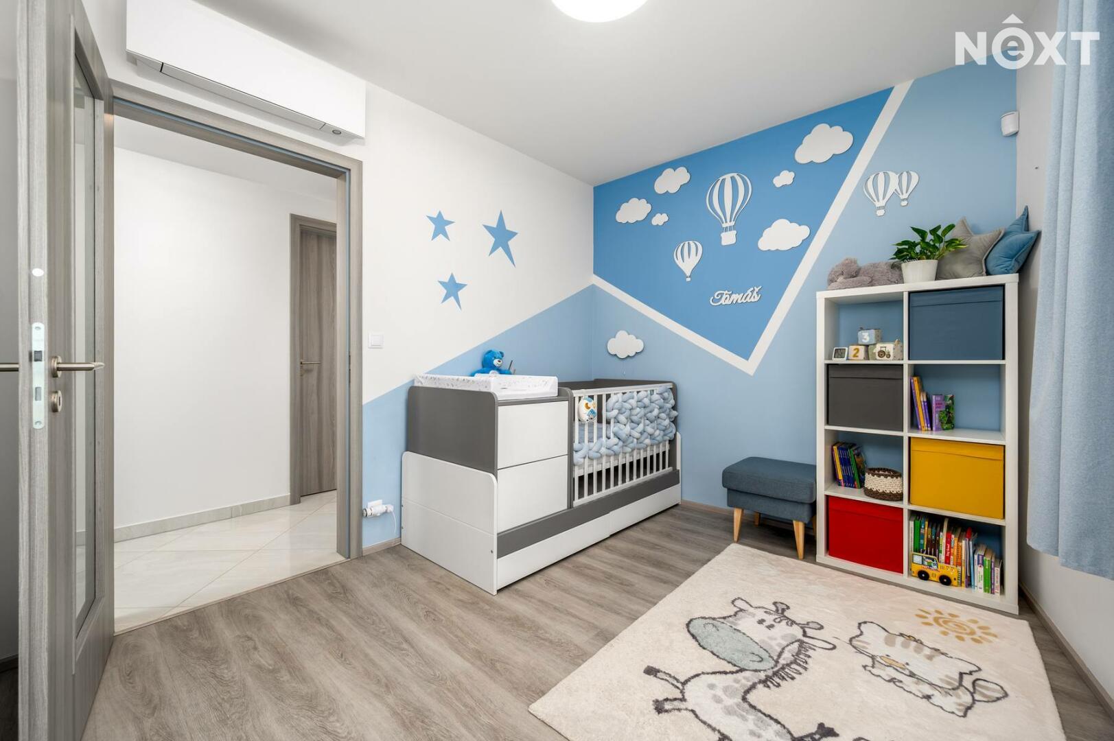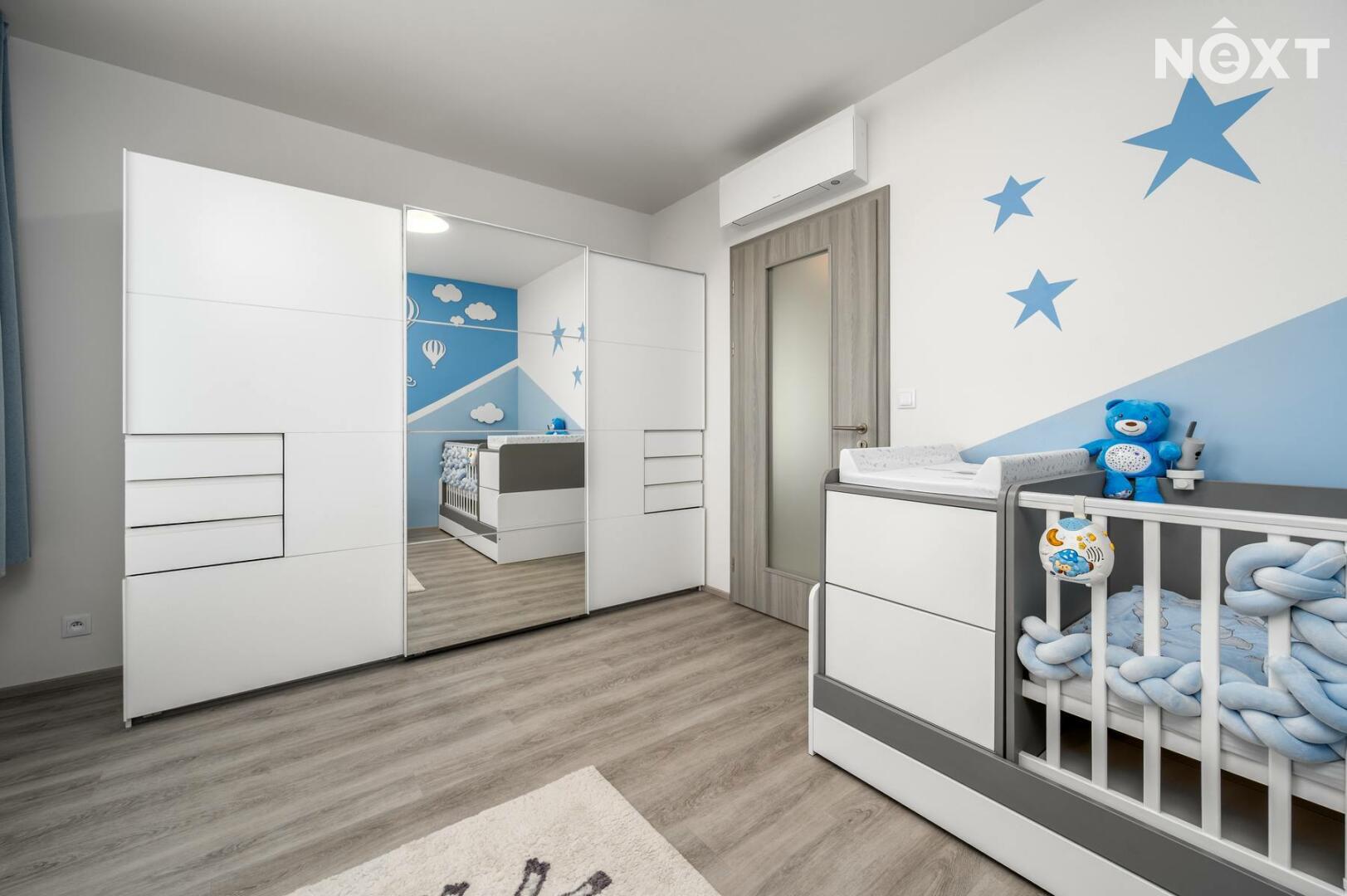 Byt je orientován na jihovýchod a severovýchod, což zajišťuje dostatek světla během dne a současně příjemné klima v letních měsících. O to se starají i elektrické venkovní rolety a klimatizace ve všech místnostech. Dispozice byla navržena tak, aby poskytovala komfortní rodinné bydlení s dostatkem soukromí i úložných prostor.