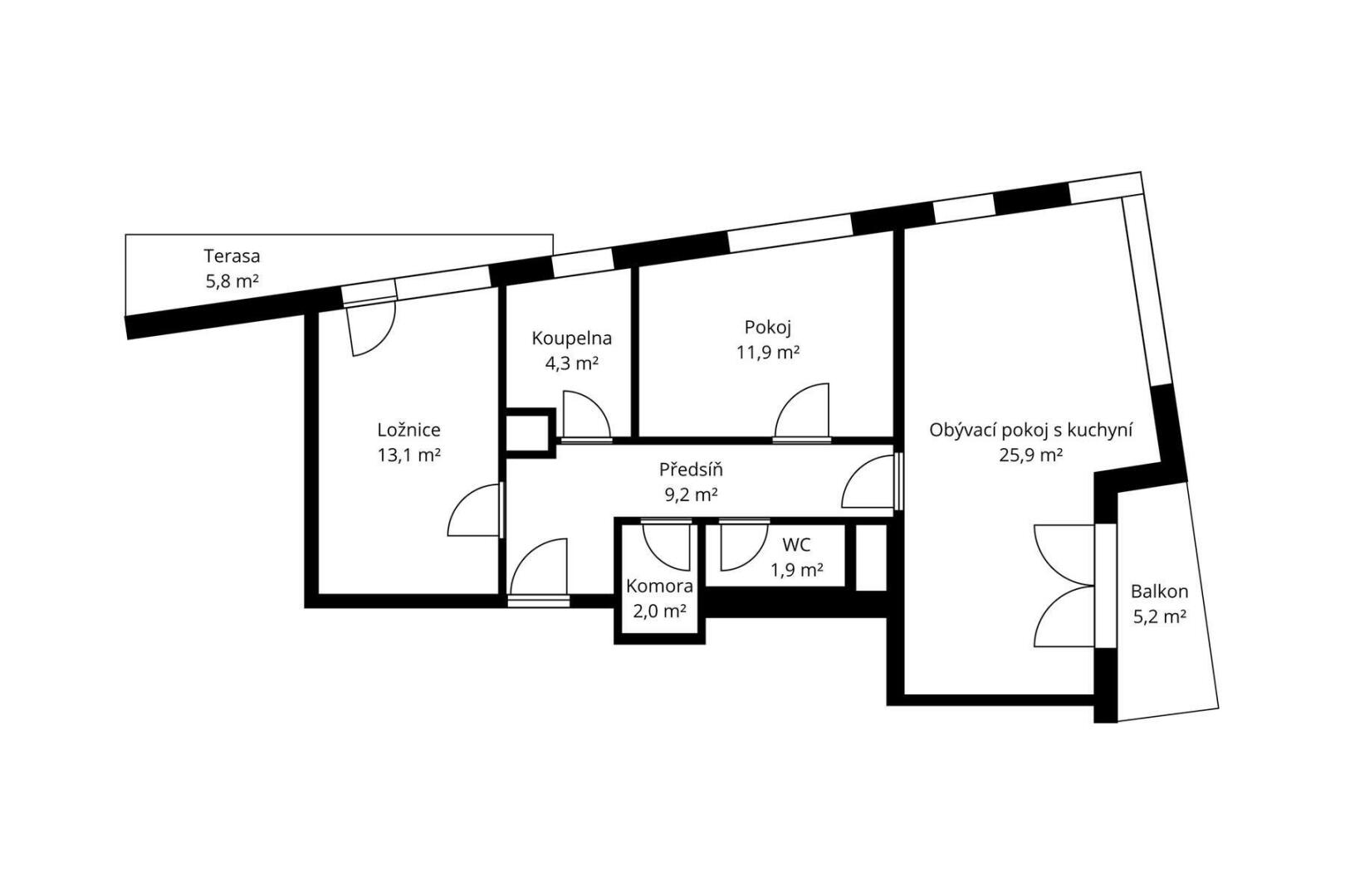 Exkluzivní prodej bytu 3+kk s celkovou výměrou 79,3m² (byt 68,3 m² + balkon 5,2 m² + terasa 5,8 m²), sklep 4,7m², vnitřní parkovací stání, Praha – Záběhlice, ulice Klapálkova.