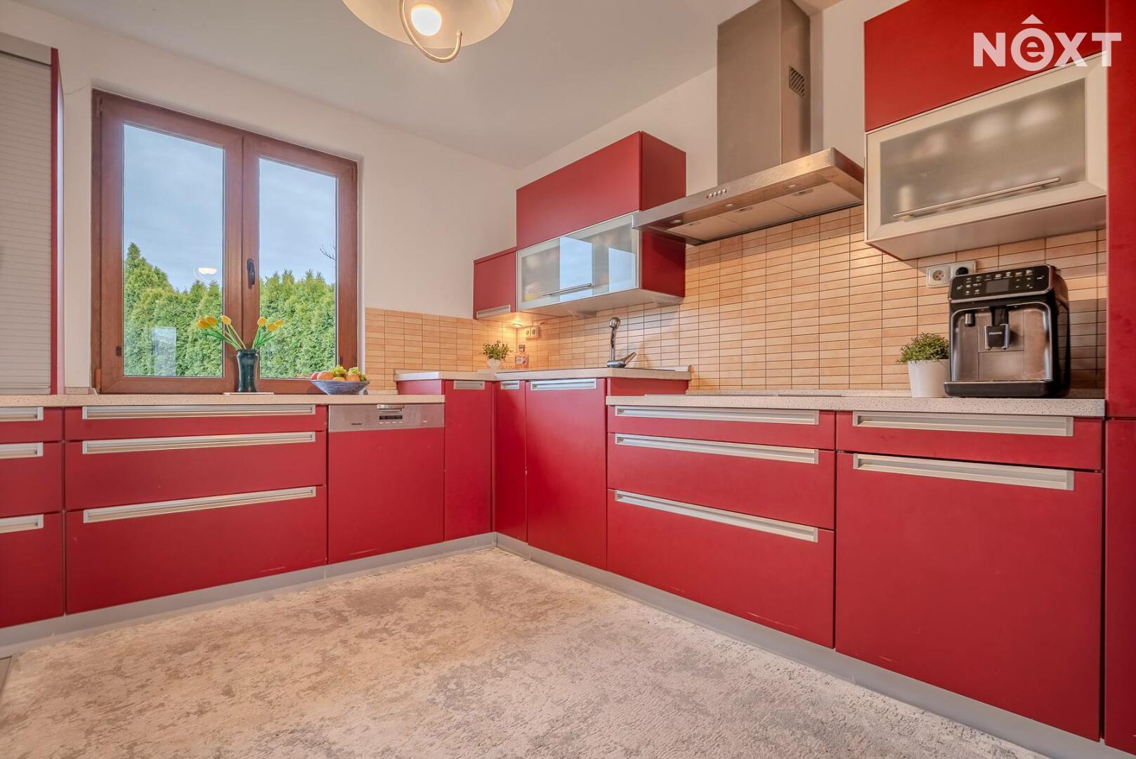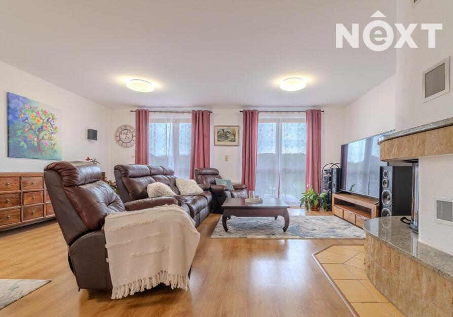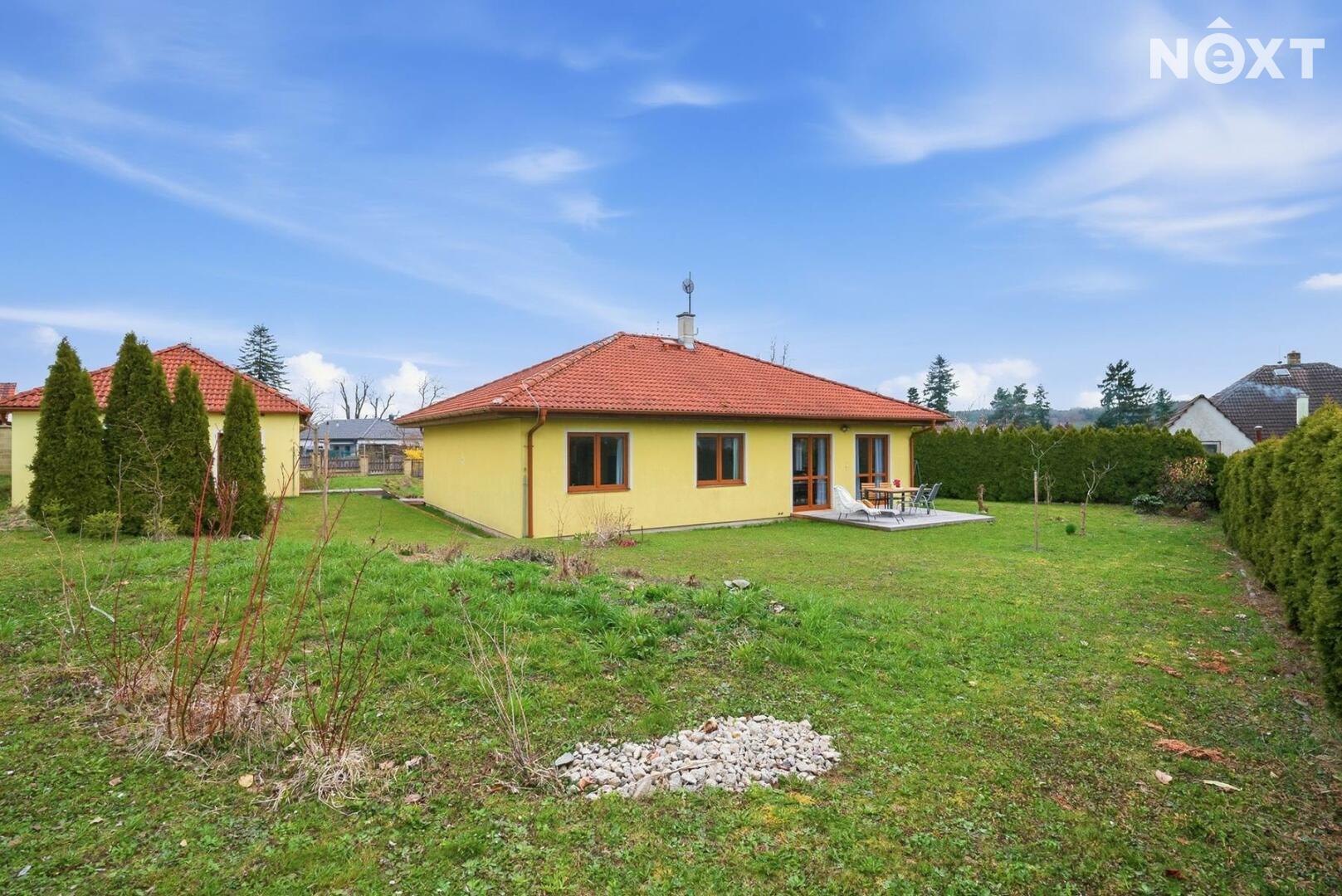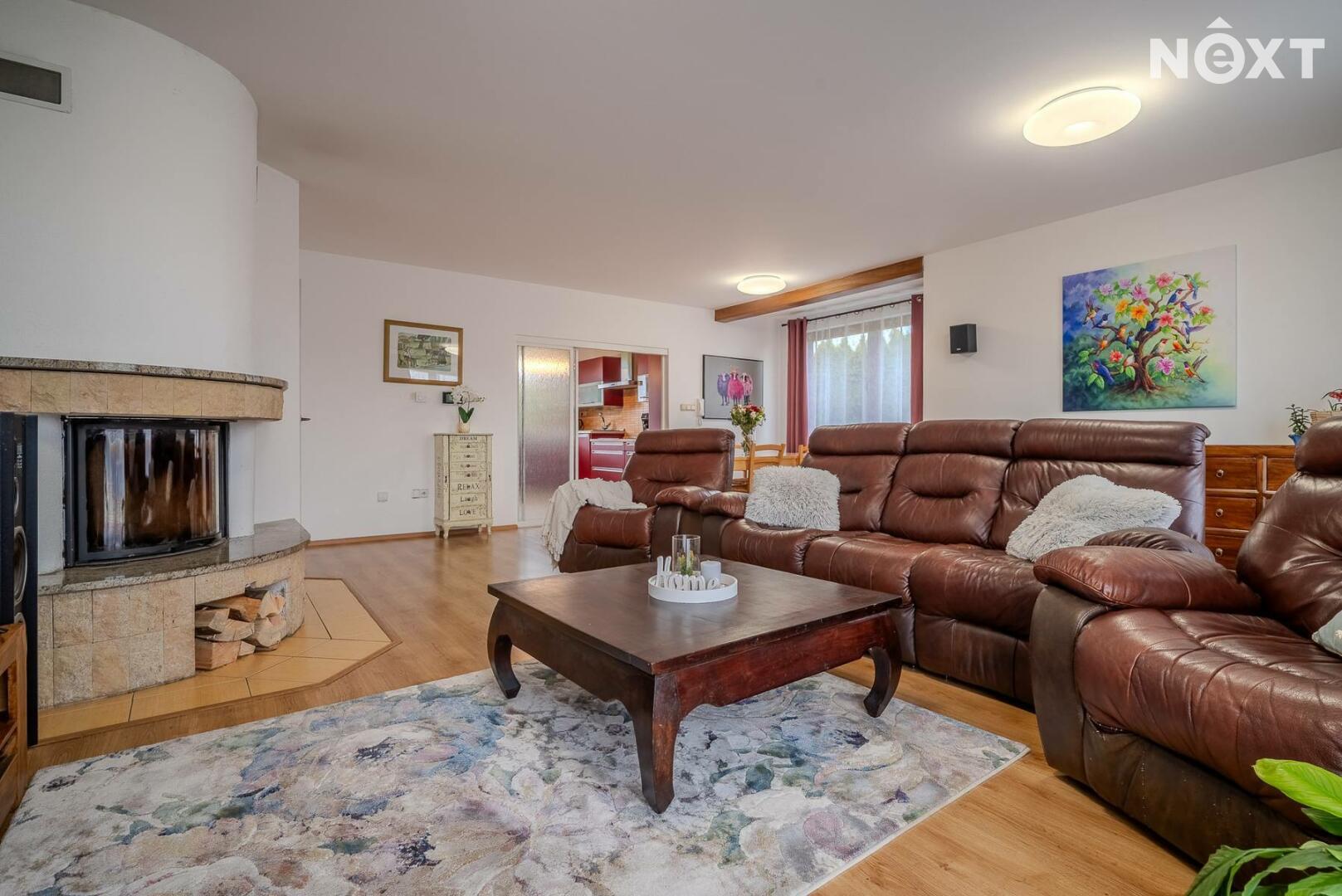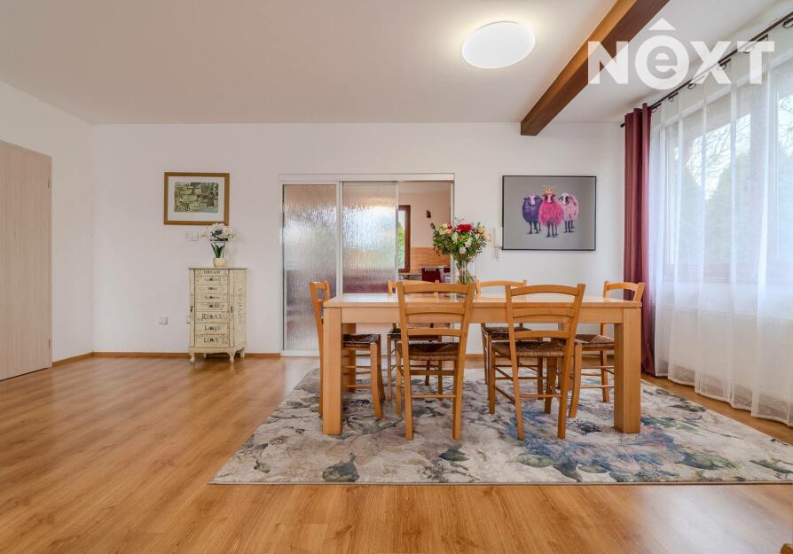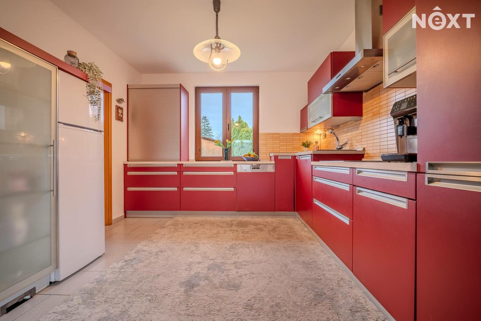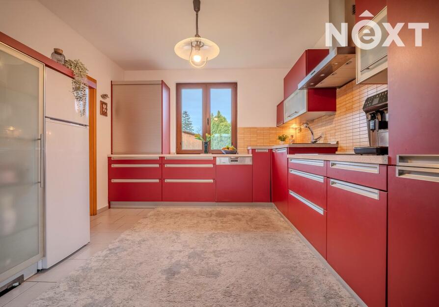 Dům stojí na pozemku o 1 280 m² a nabízí promyšleně řešený, prostorný interiér: