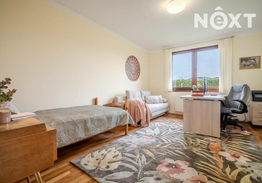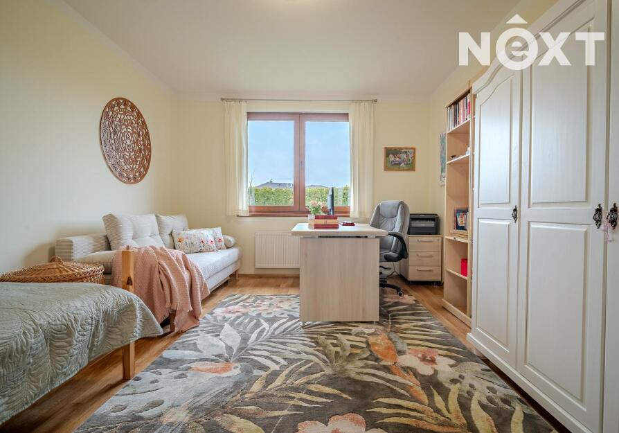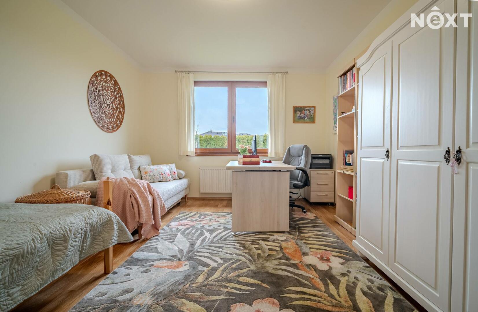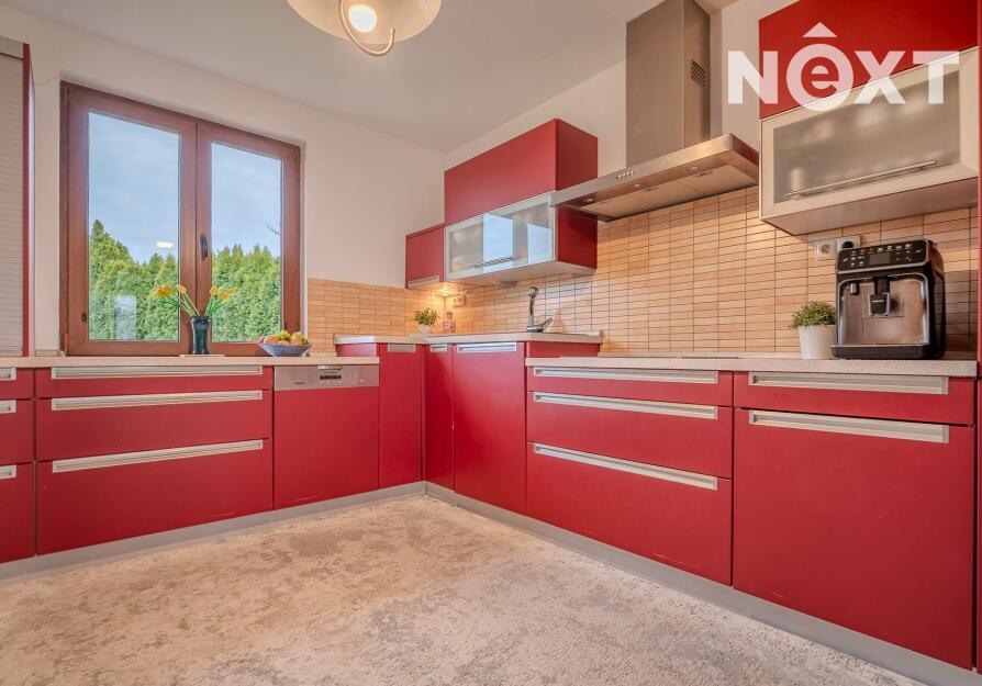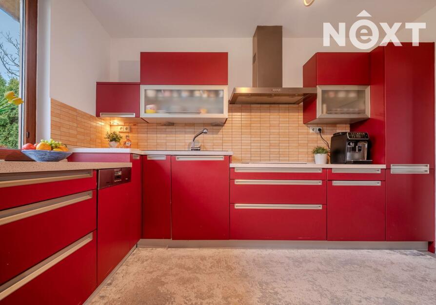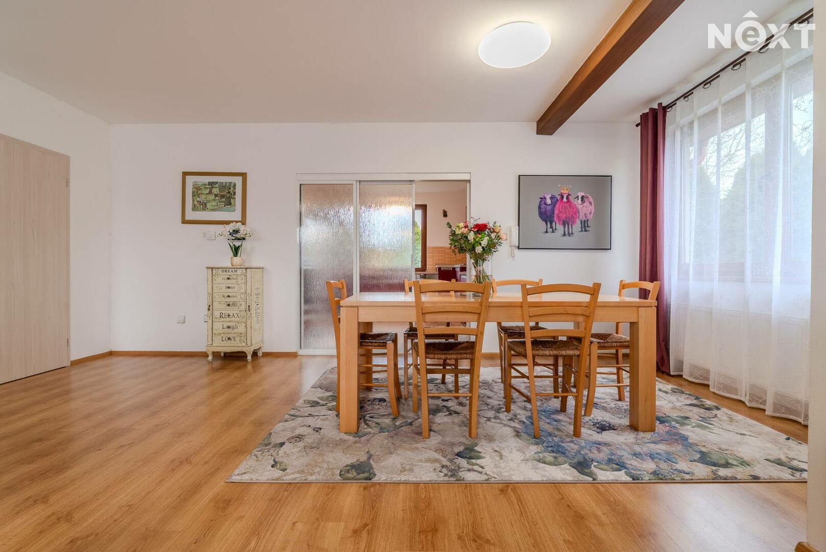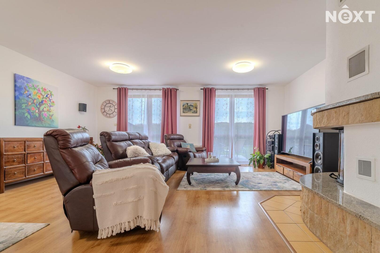 Dům stojí na pozemku o 1 280 m² a nabízí promyšleně řešený, prostorný interiér: