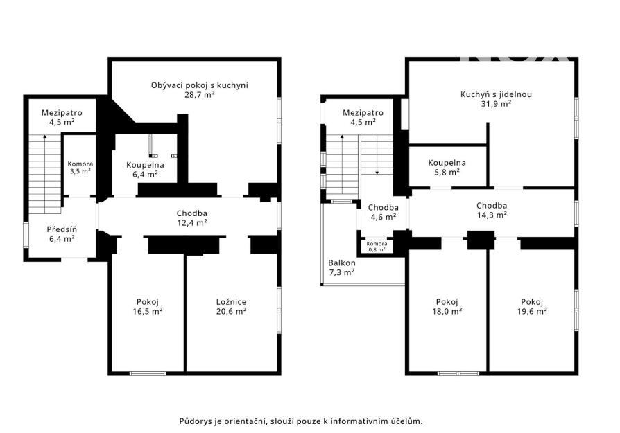 2. podlaží (106,8 m²): Moderní kuchyně s jídelnou (31,9 m²), dva velké pokoje (19,6 m² a 18,0 m²), koupelna, balkon (7,3 m²) a prostorná chodba.
