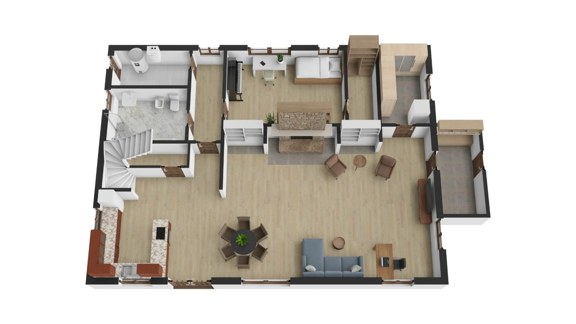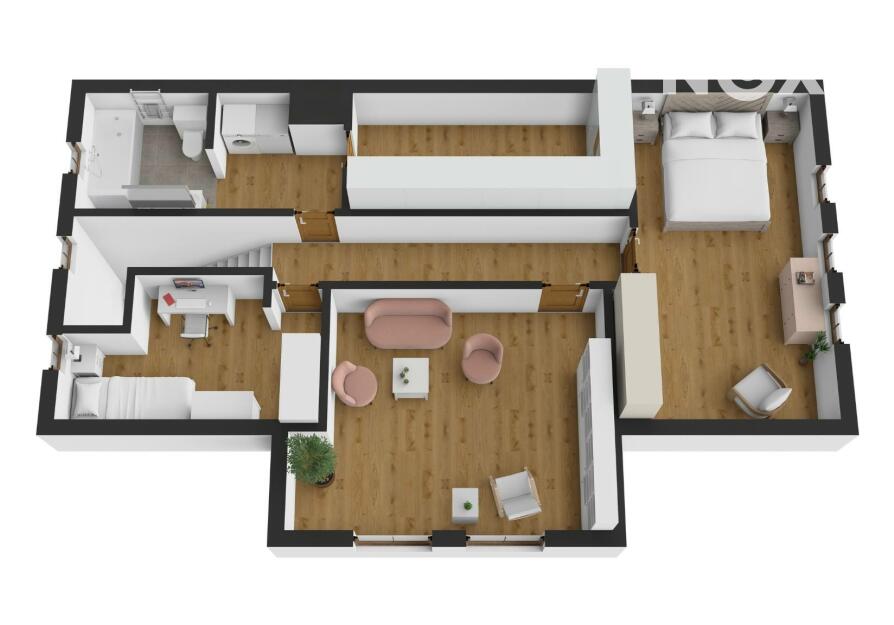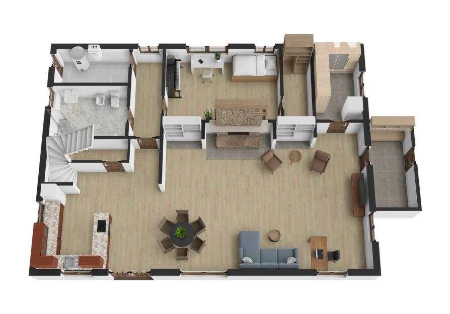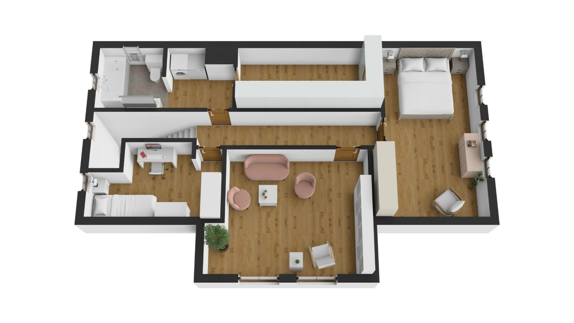 Srdcem domu je otevřený obytný prostor s krbem, který přirozeně propojuje zónu pro společná setkání s jídelnou a kuchyní. Velká francouzská okna vpouští dovnitř světlo i výhled do zahrady, takže interiér působí vzdušně a živě po celý rok. Dispozice nabízí několik neprůchozích ložnic, které dávají soukromí rodičům i dětem, dvě koupelny pro pohodlí každodenního provozu a praktické zázemí v podobě centrálního vysavače či plynového kotle. Dům z roku 2002 je dřevostavbou ve velmi dobrém stavu – připravený k okamžitému bydlení bez nutnosti zásadních úprav.