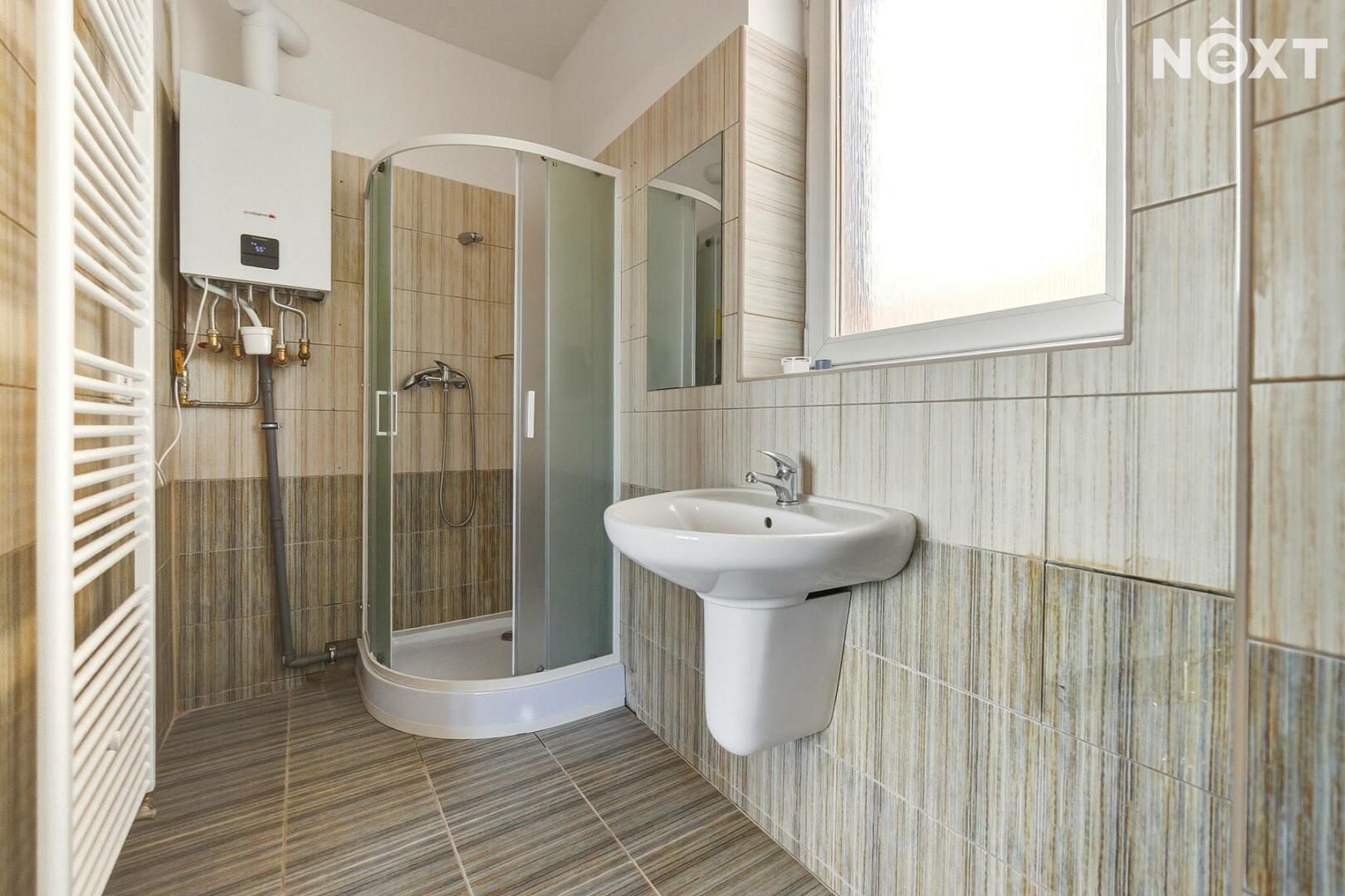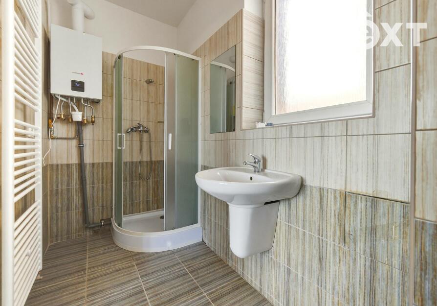 Topení je řešeno novým plynovým kotlem a radiátory v obytných místnostech a komoře. V koupelně je na zdi otopný žebřík.