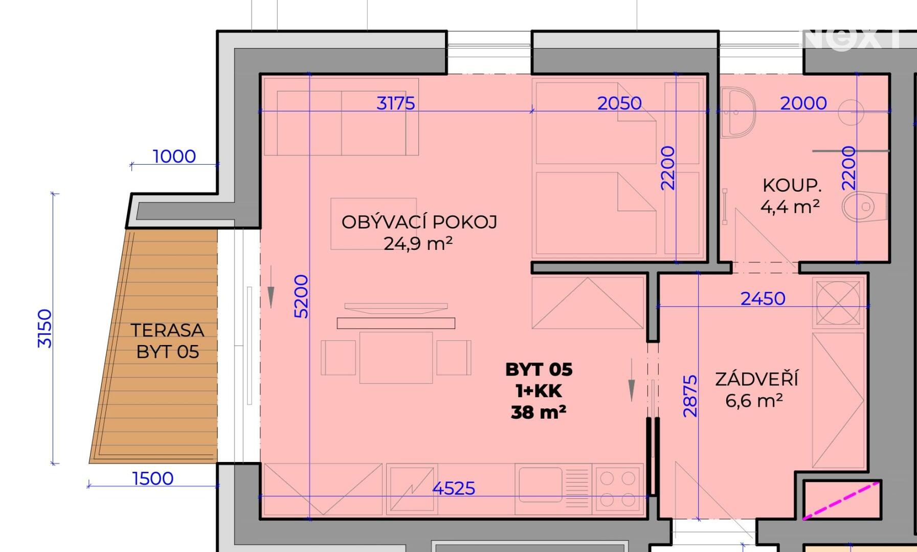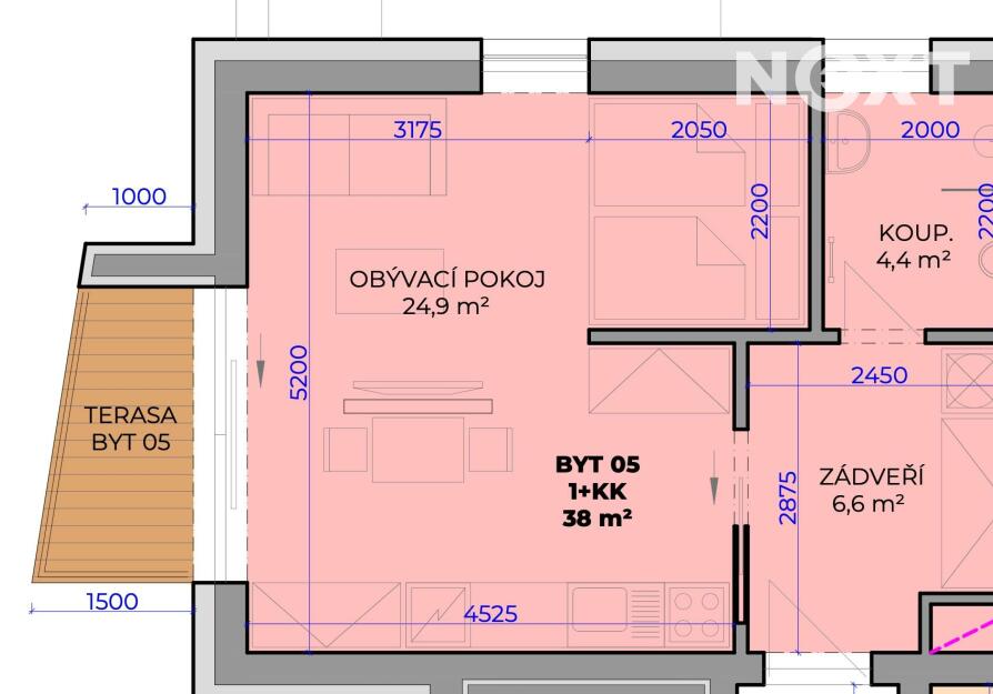 Byt se nachází ve 2. nadzemním podlaží, podlahová plocha je 36 m². Součástí bytu je také terasa o velikosti 4,00 m².
