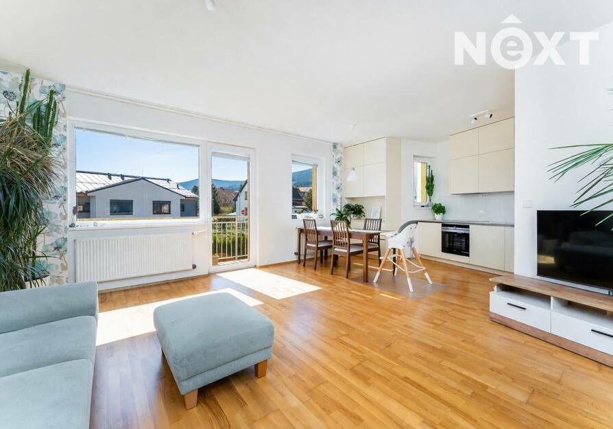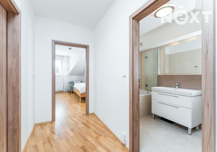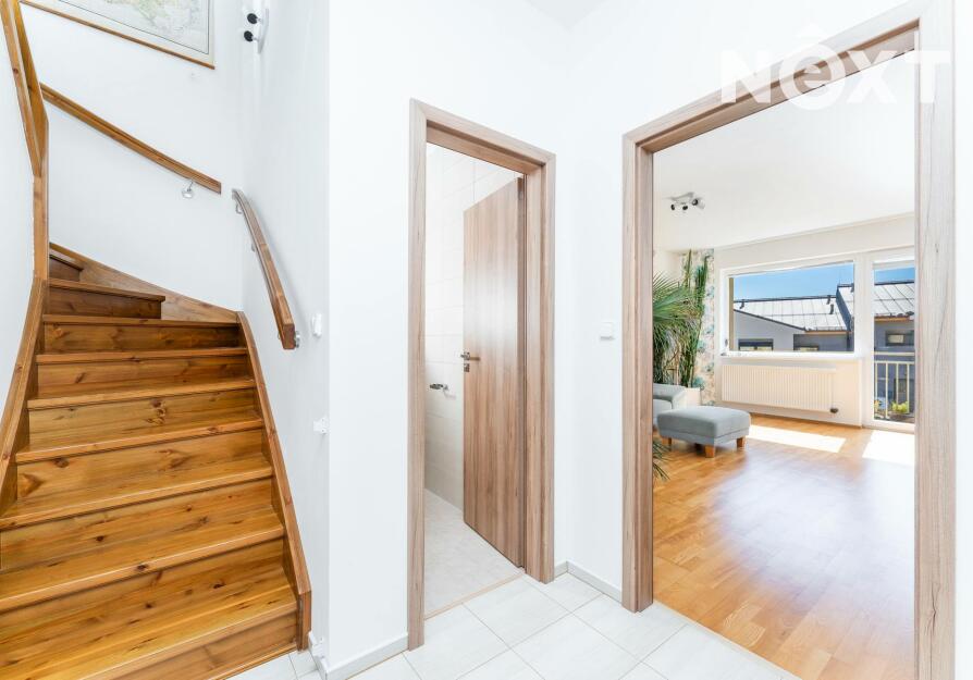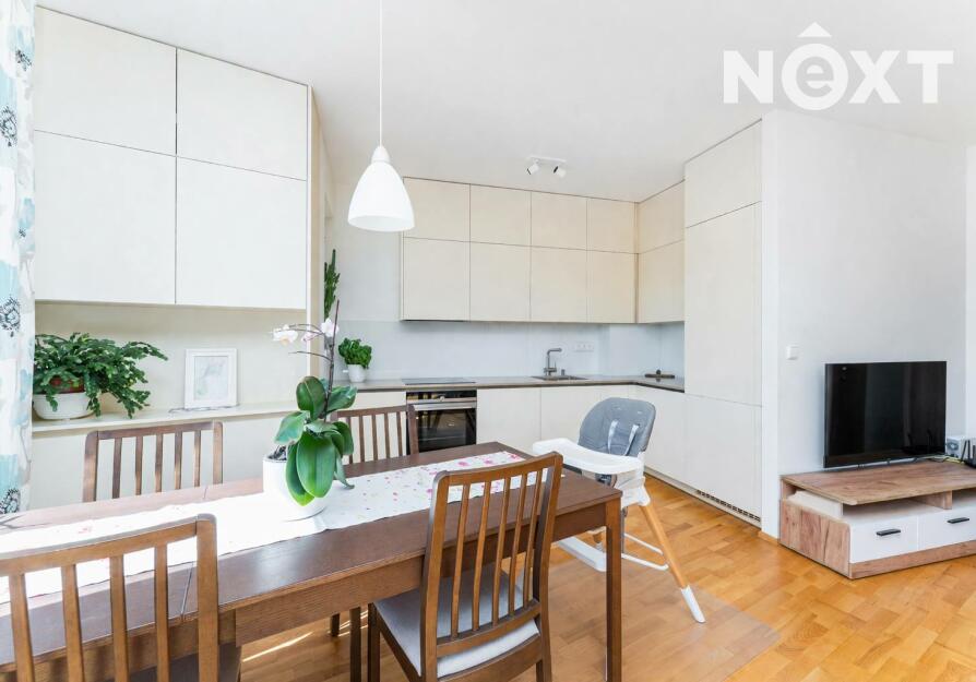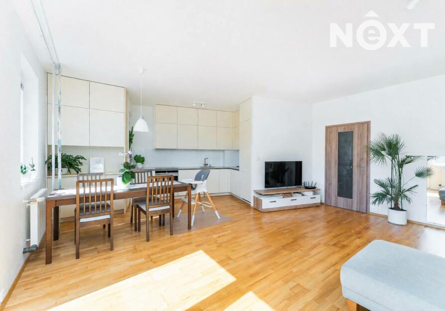 Byt je velmi pěkně zařízen, má dřevěné podlahy, kuchyň na míru s kamennou deskou.