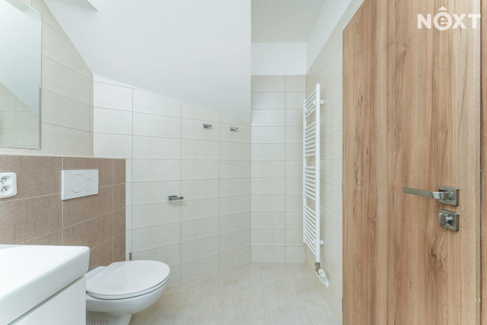 Dispozice bytu: zádveří a vstupní chodba, obývací pokoj propojen s kuchyňským koutem a výstupem na balkón, wc, po schodech do patra, kde jsou 2 samostatné pokoje, koupelna s vanou a technická místnost s možností zapojení pračky. Vytápění bytu a ohřev teplé vody zajišťuje společný plynový kotel pro každý blok.