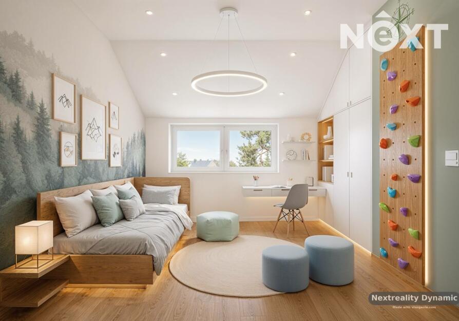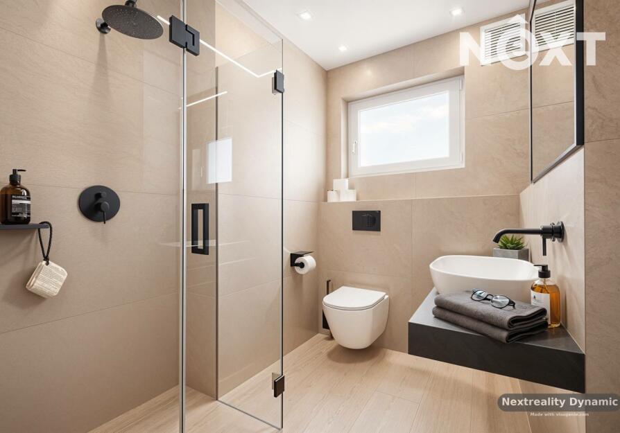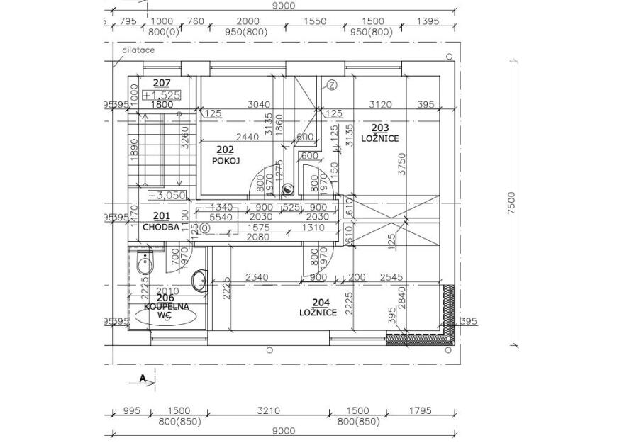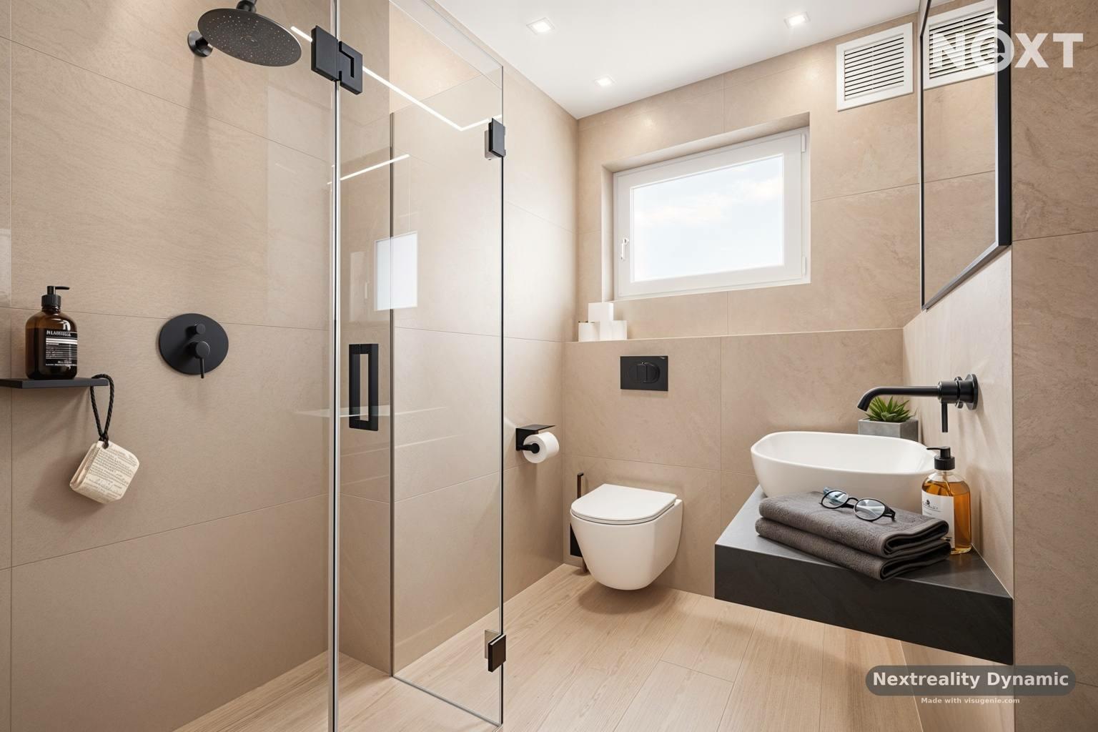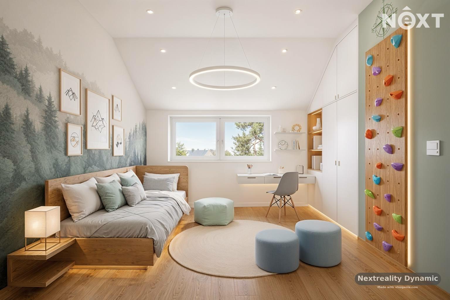 V patře se nachází tři samostatné pokoje, které poskytují dostatek soukromí pro každého člena rodiny. Praktické řešení doplňuje technická místnost a dvě koupelny – jedna se sprchovým koutem, druhá s vanou.