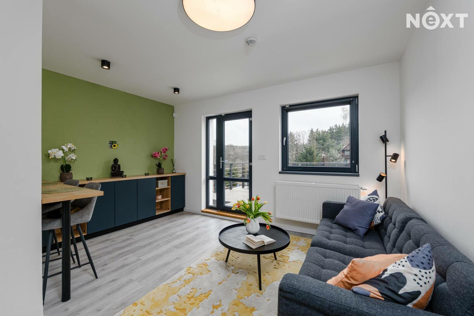 Dispozice bytu zahrnuje světlý obývací prostor s kuchyňským koutem, ložnici, další pokoj (ideální jako druhá ložnice či pracovna) a koupelnu s toaletou. Díky své dispozici a atmosféře je byt perfektní jak pro vlastní využití, tak jako investice na krátkodobé pronájmy (např. víkendové pobyty, Airbnb apod.).