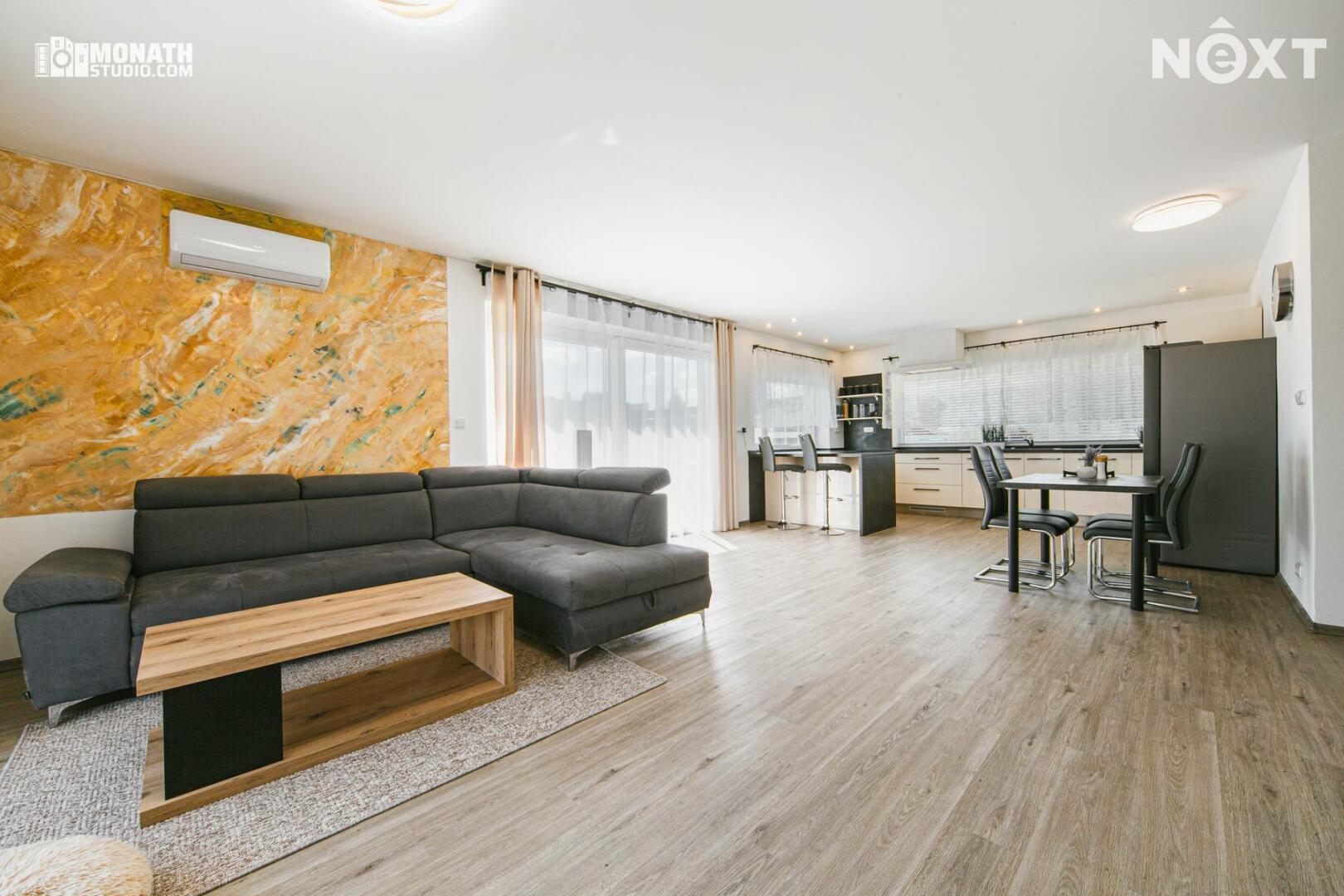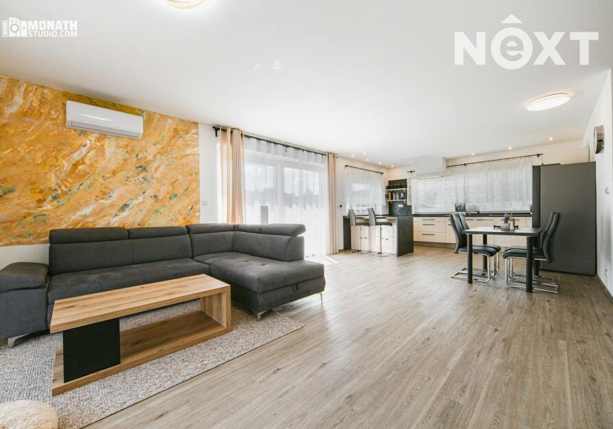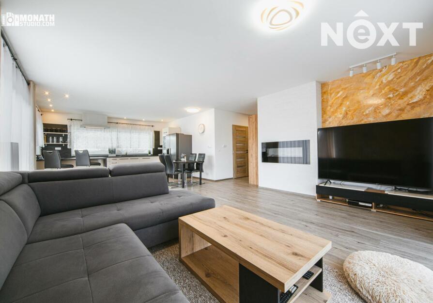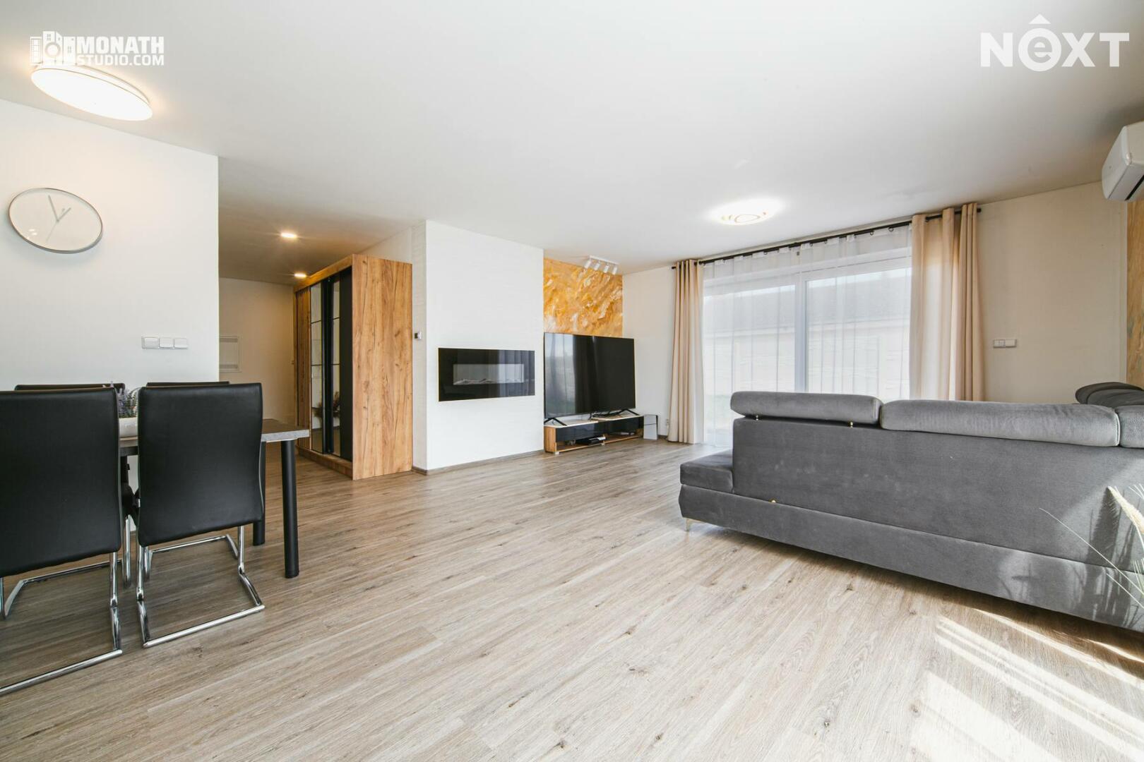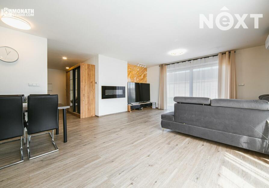 • Prostorný obývací pokoj se dvěma HS portály a přímým vstupem na terasu; elektrický krb vytváří příjemnou atmosféru.